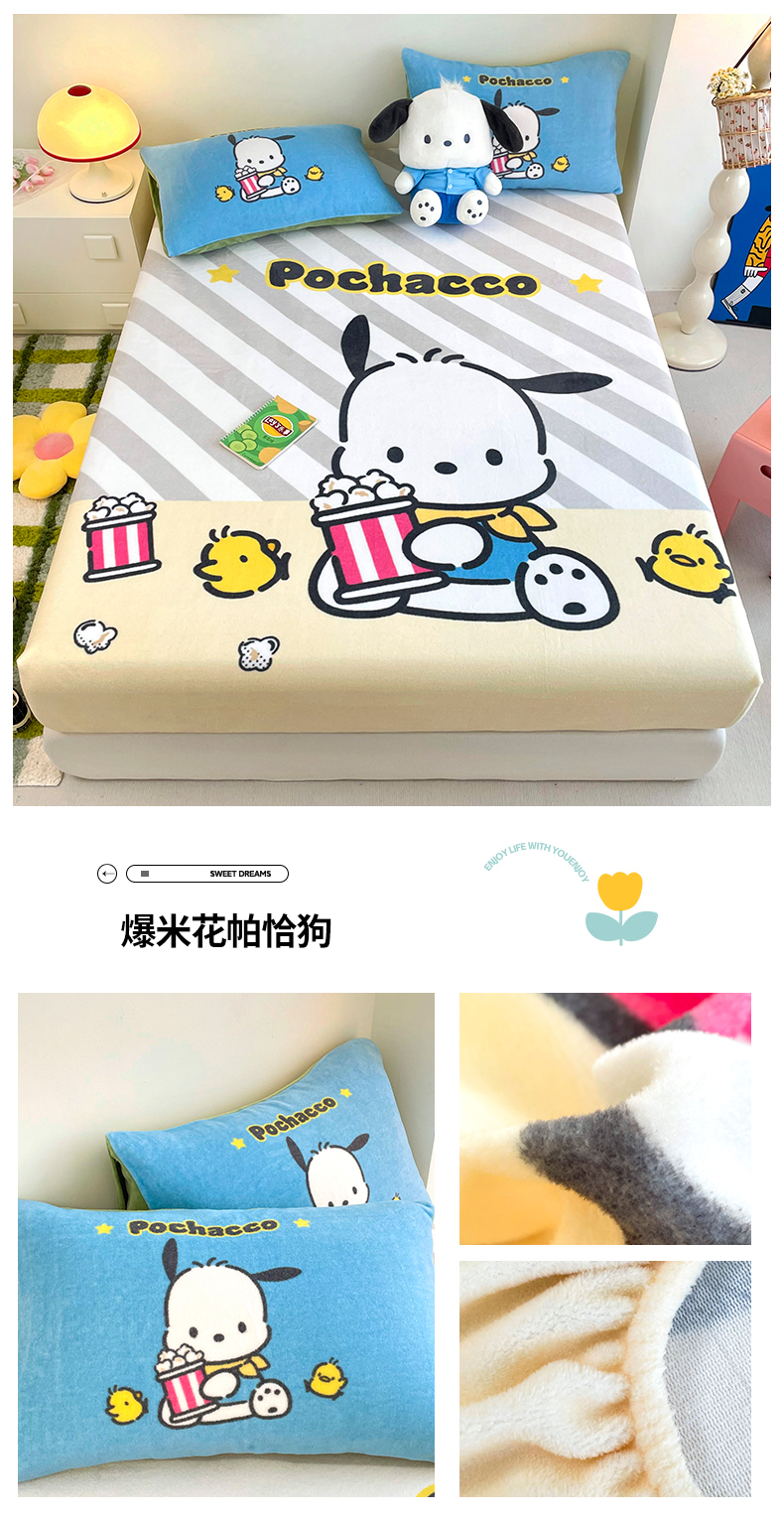 商品名称:米帛家纺 2024新款A类三丽鸥卡通床笠单件床罩冬季加厚牛奶绒床垫保护罩全包床单套 爆米花帕恰狗