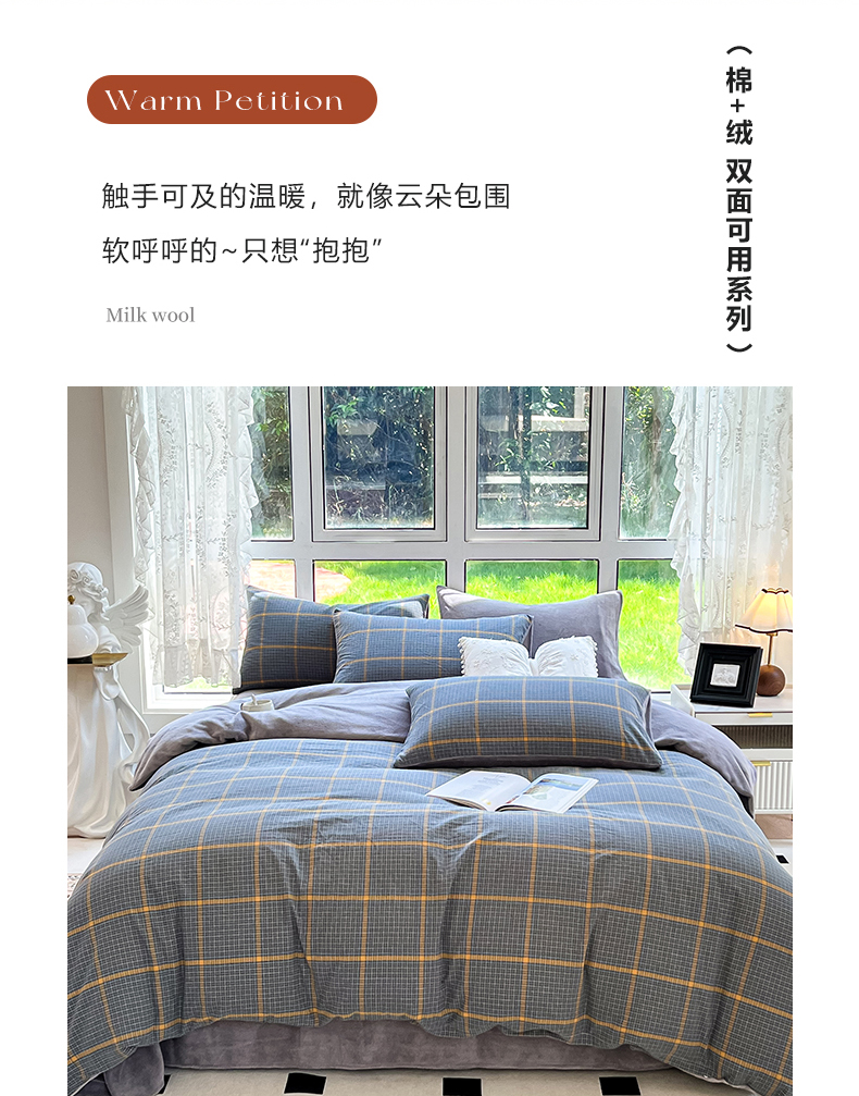当前位置: 91家纺网 > 商品网购 > 床品套件 > 四件套 > 牛奶绒四件套 > 2024最新无印良品风双拼全棉色织水洗棉加牛奶绒四件套简约全棉拼牛奶绒 棉+绒-瓦尔灰