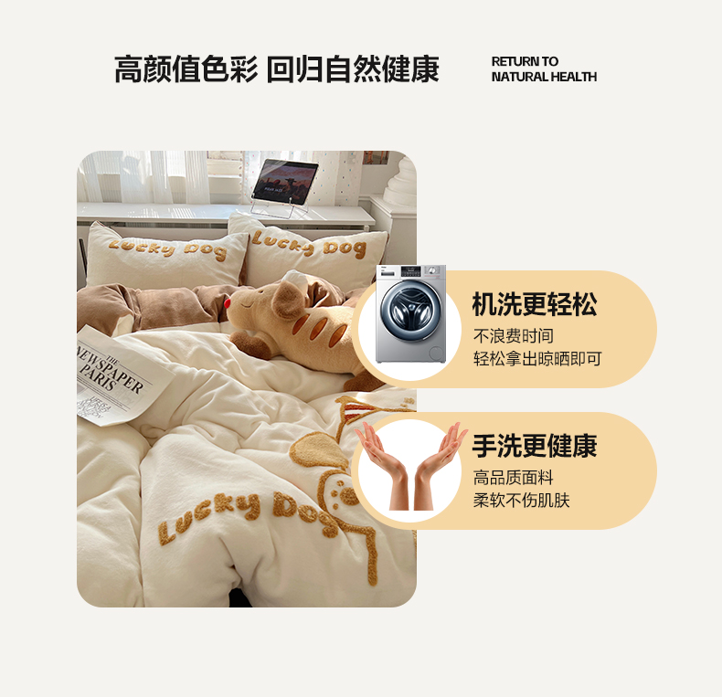 商品名称:雅居纺家纺 2024新款大版毛巾绣牛奶绒四件套 LUCK-小狗