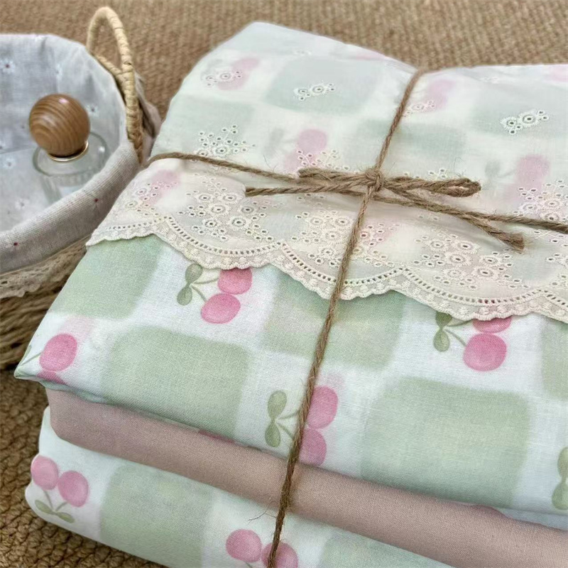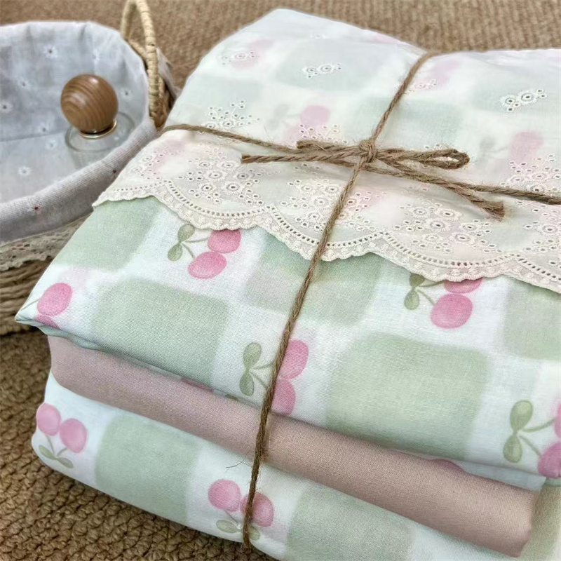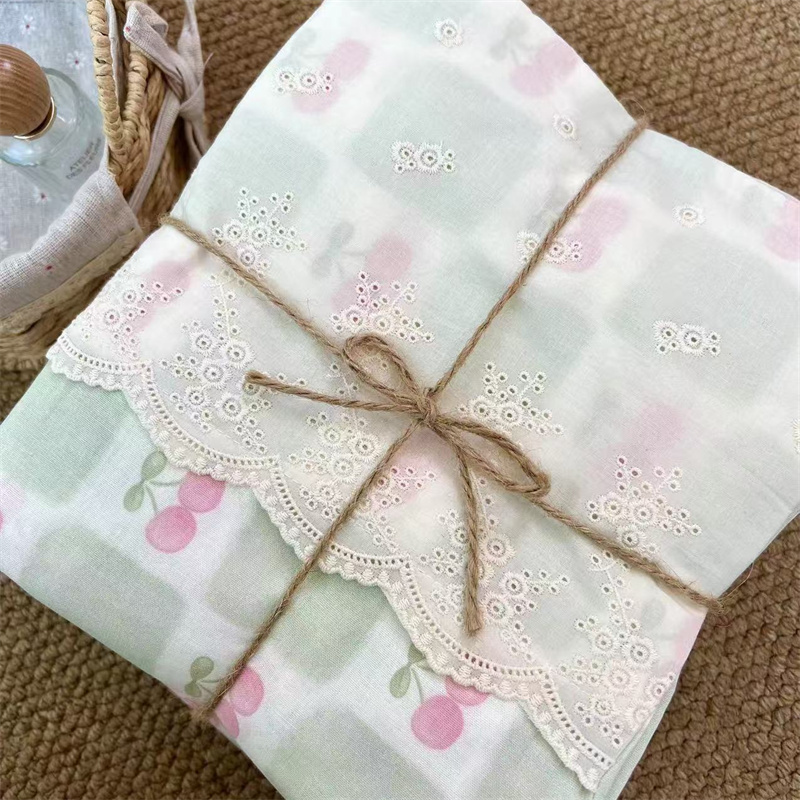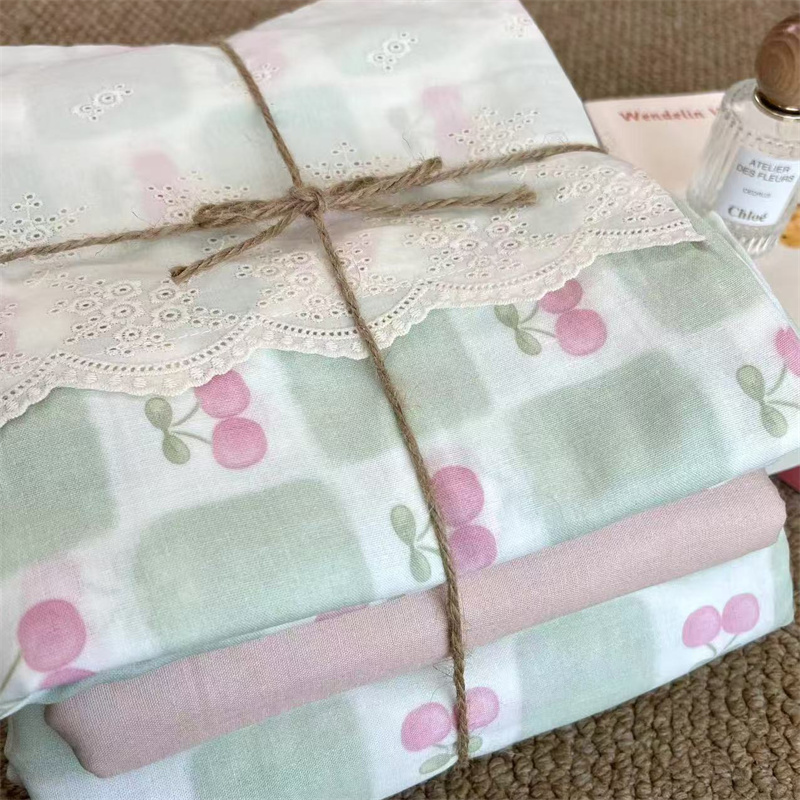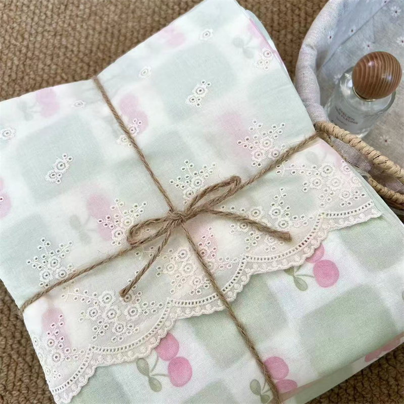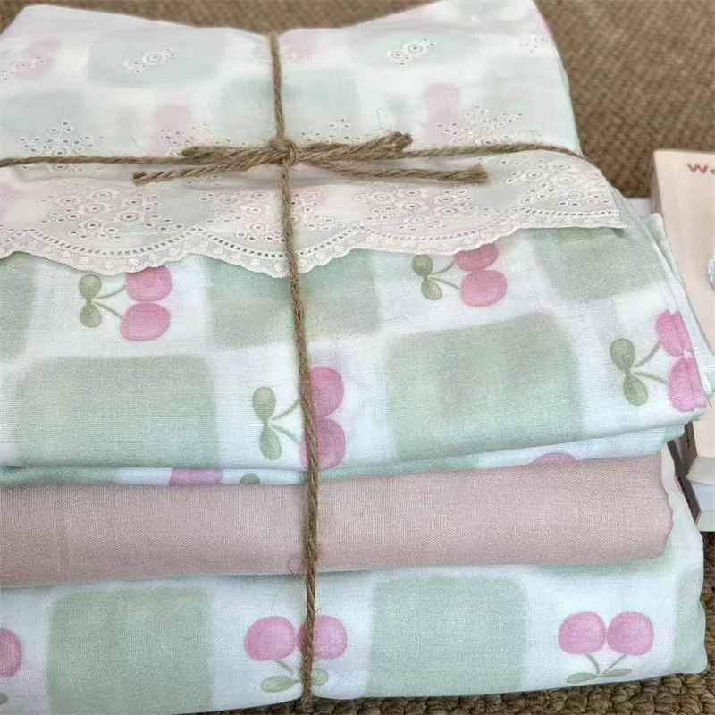 2024新款全棉印花双层纱四件套--蕾丝花边款 格子樱桃