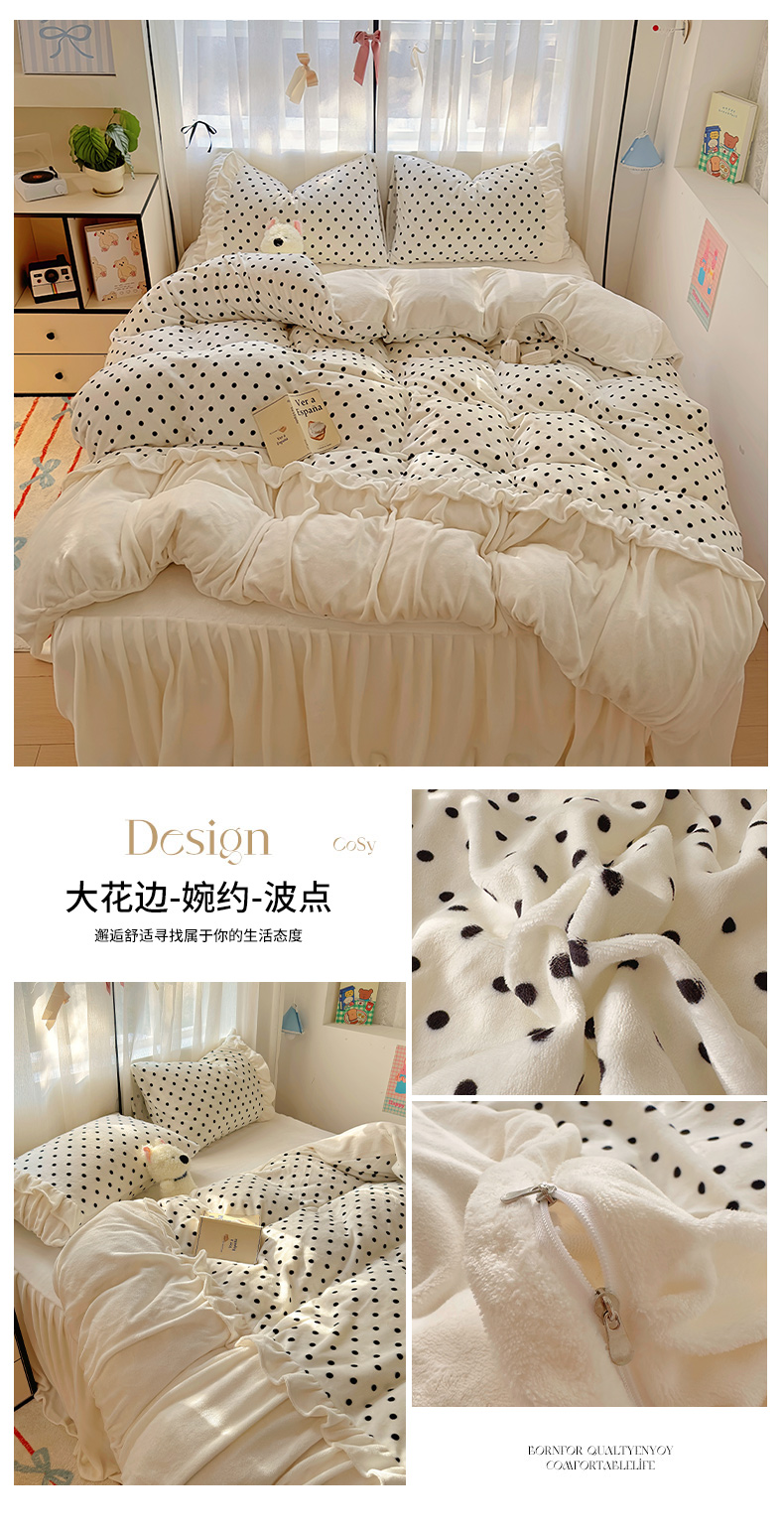 当前位置: 91家纺网 > 商品网购 > 床品套件 > 四件套 > 牛奶绒四件套 > 山茶家纺 2024新款高克重牛奶绒印花花边四件套-场景二 大花边-婉约-波点