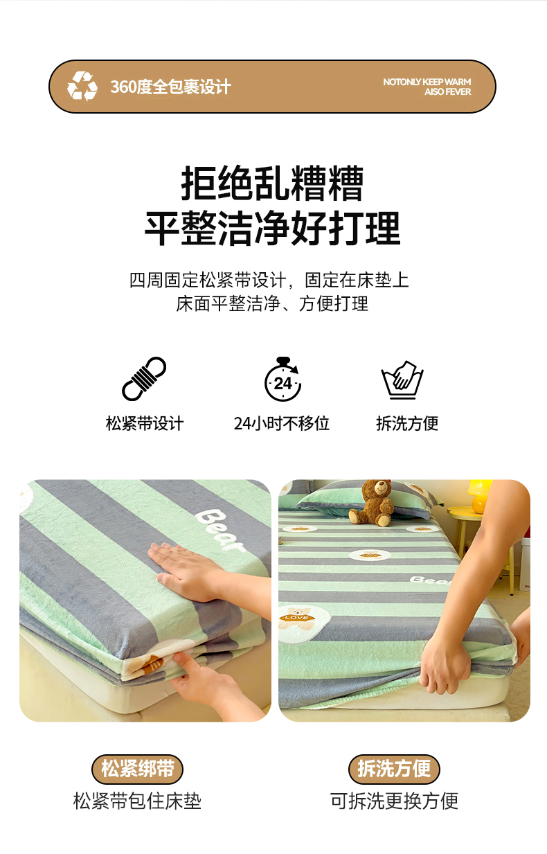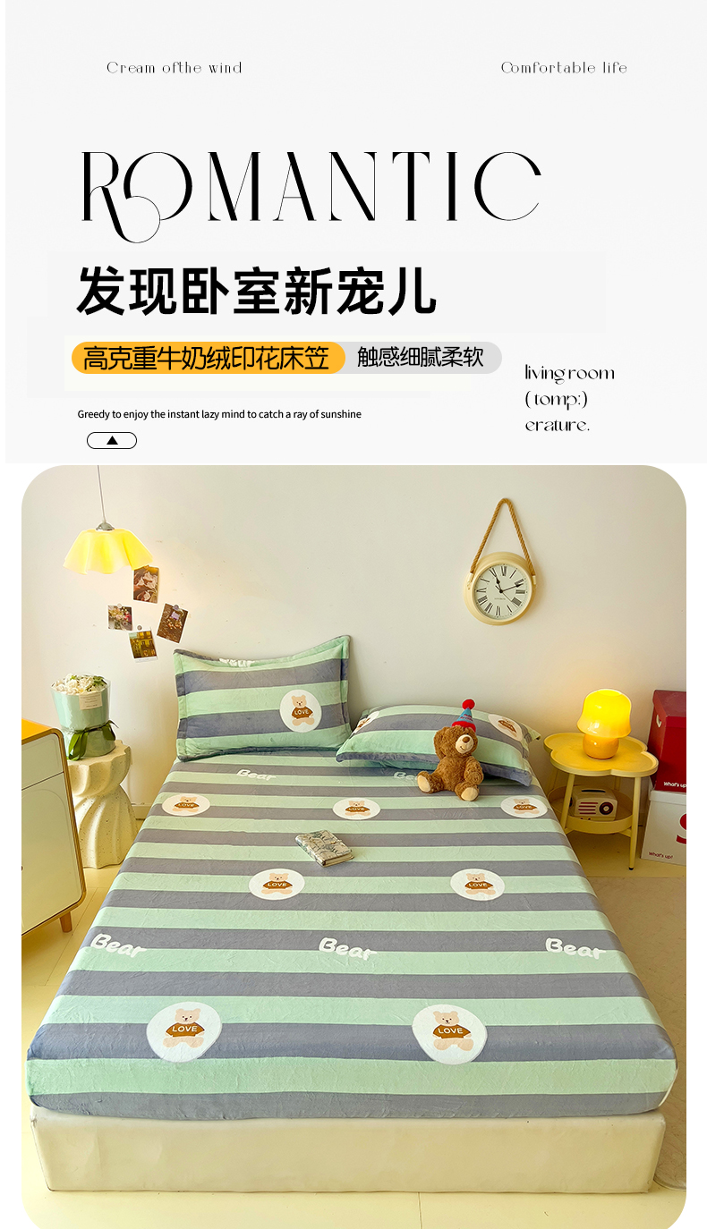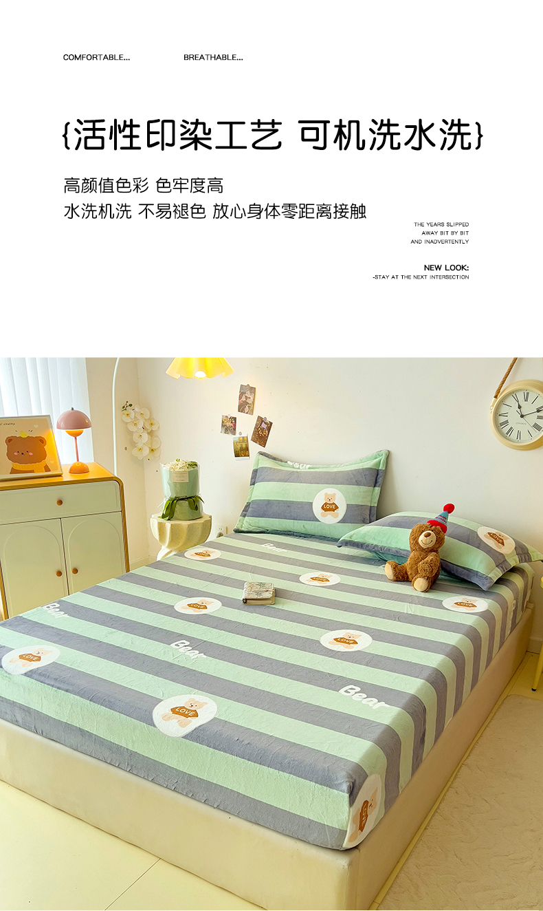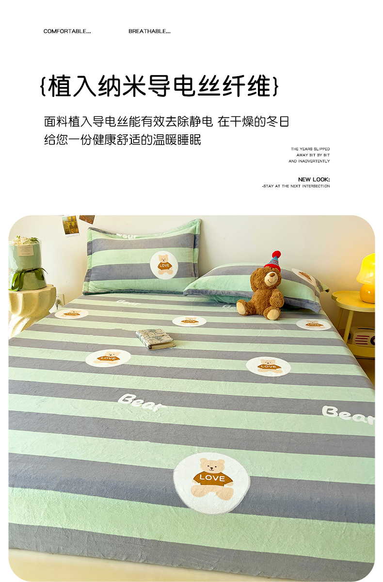 商品名称:大柏树 2025新款A类高克重亲肤舒适牛奶绒印花四件套-单床笠可定制 布琪小熊-绿