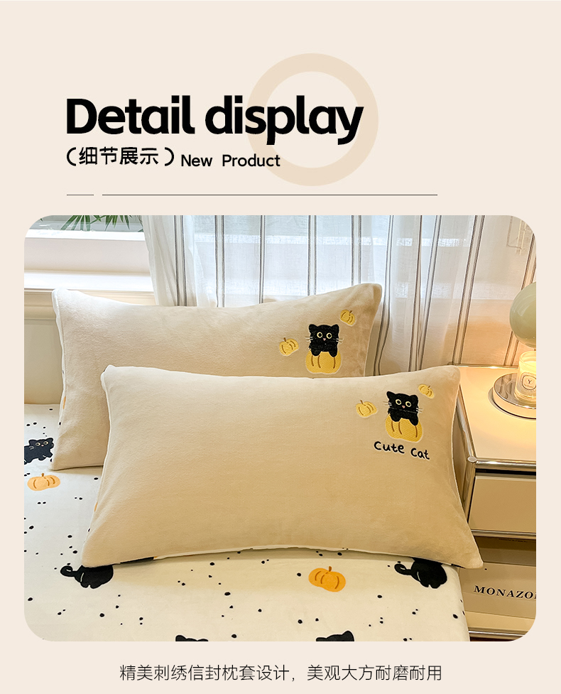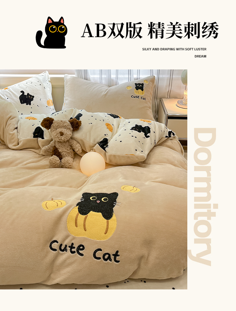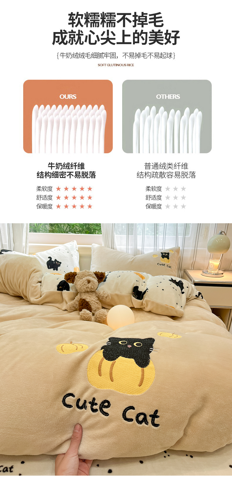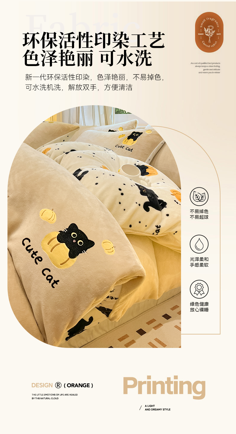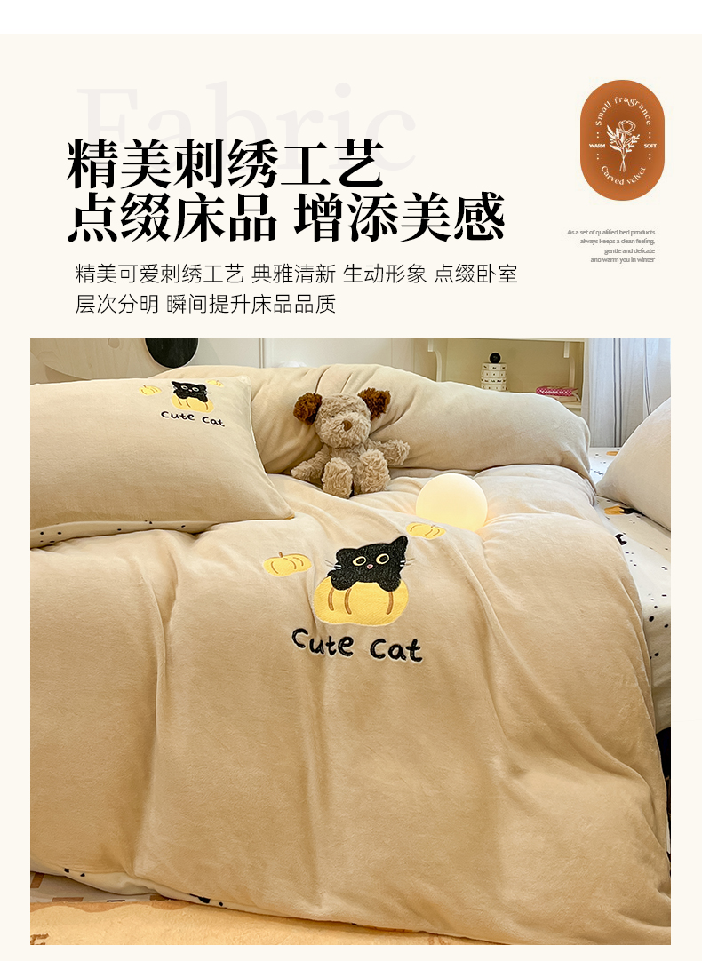 佰亿莱 2024新款简约牛奶绒刺绣四件套 南瓜猫