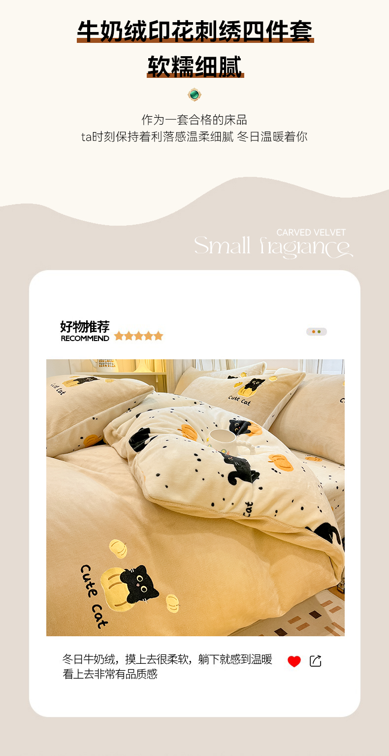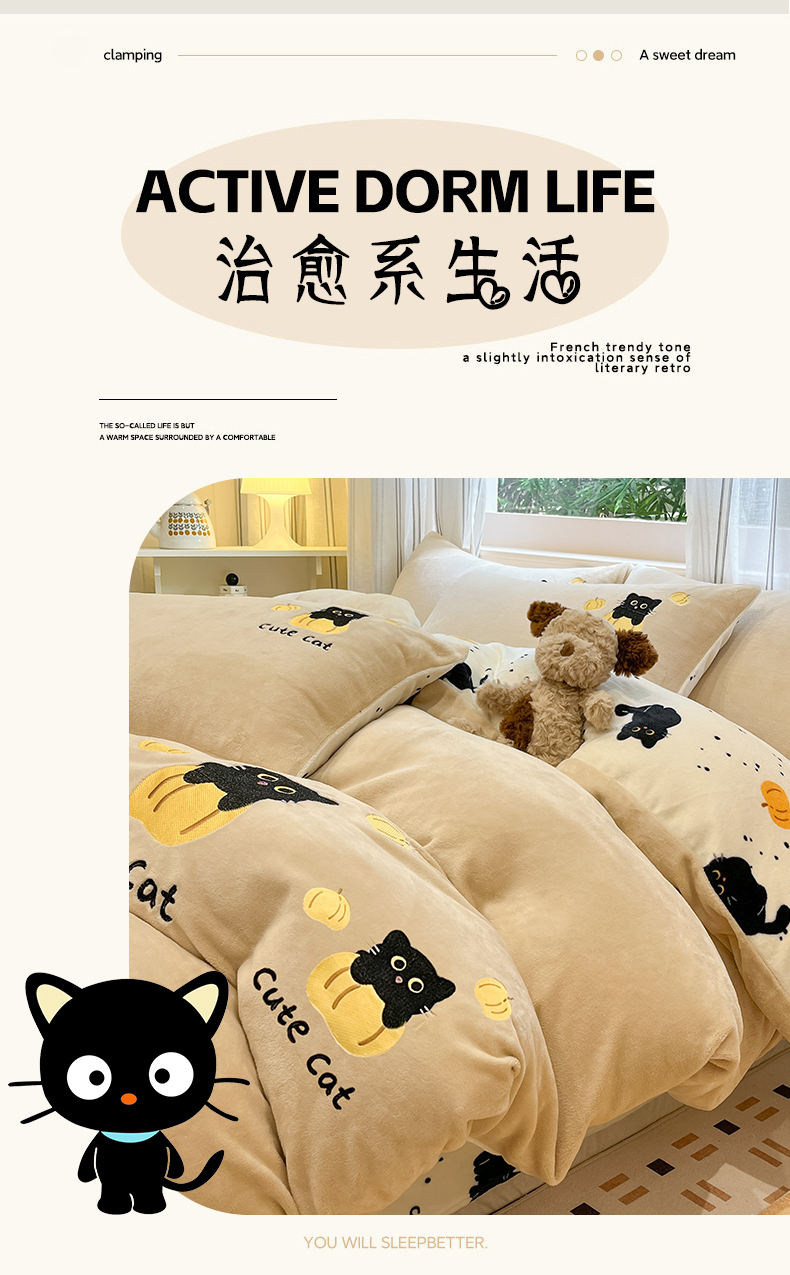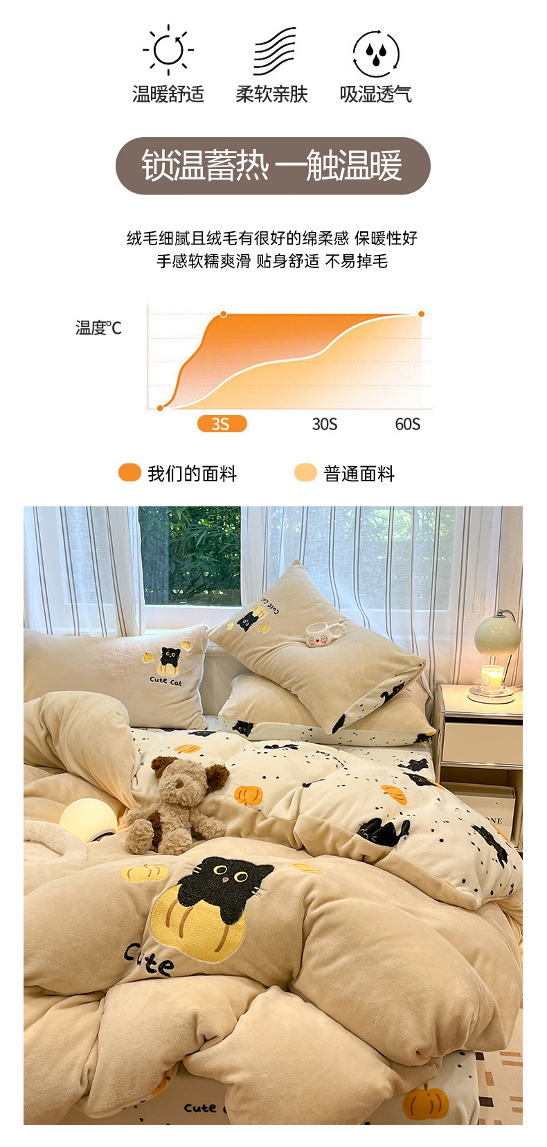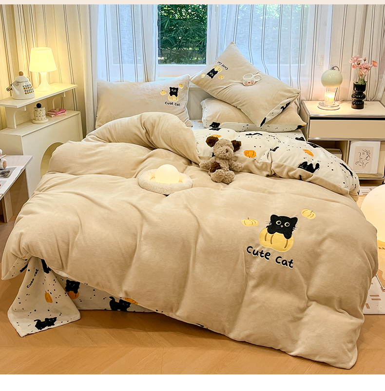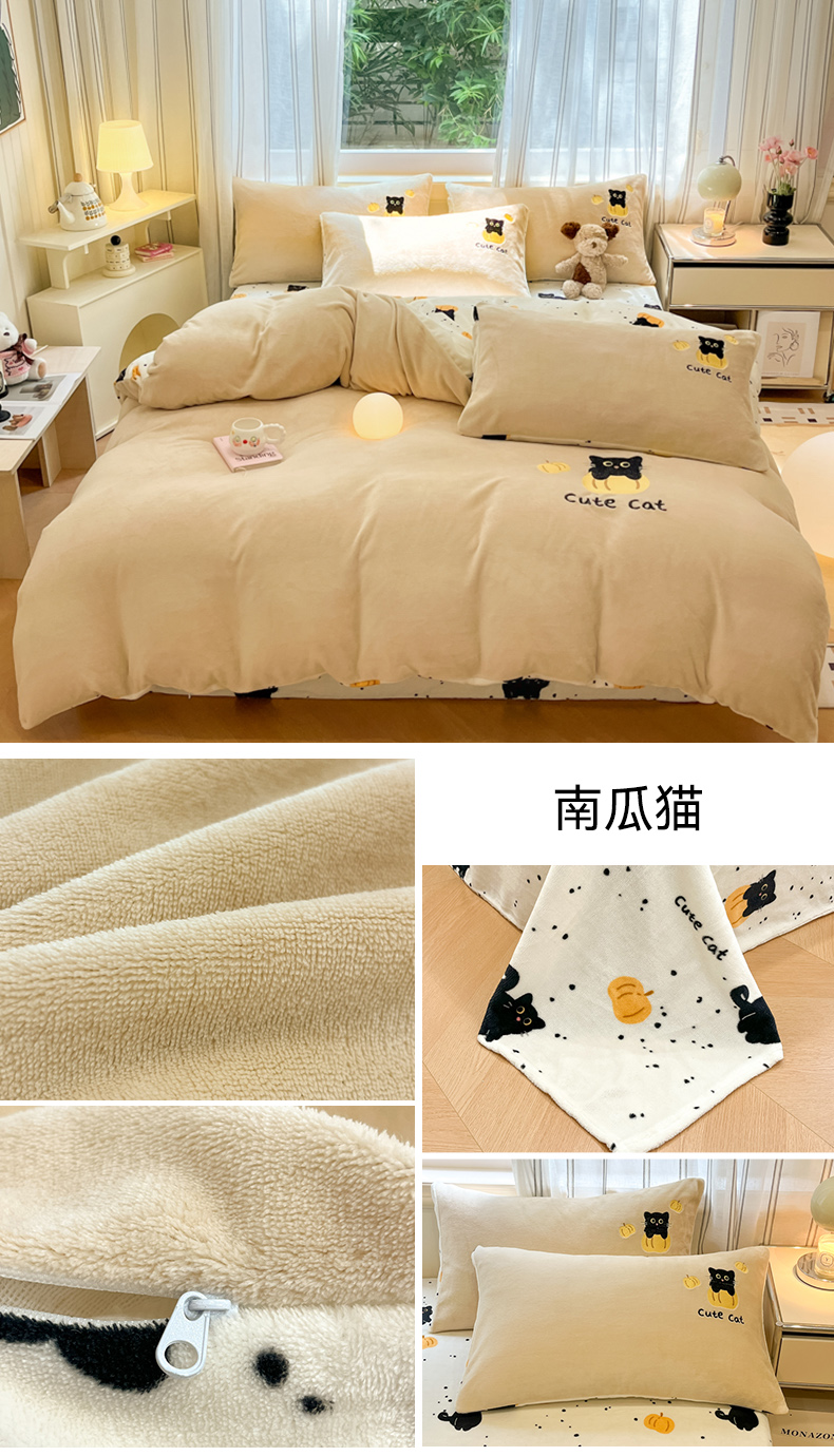 佰亿莱 2024新款简约牛奶绒刺绣四件套 南瓜猫