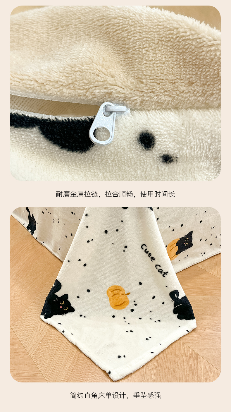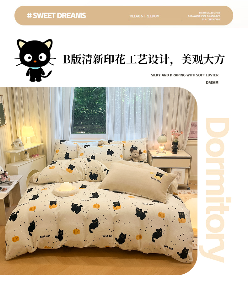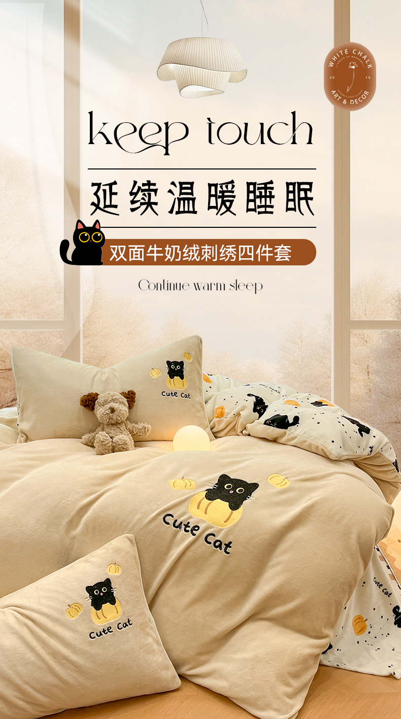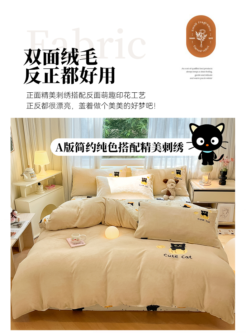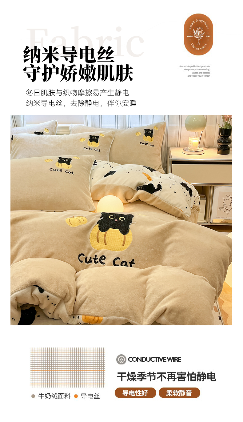佰亿莱 2024新款简约牛奶绒刺绣四件套 南瓜猫
