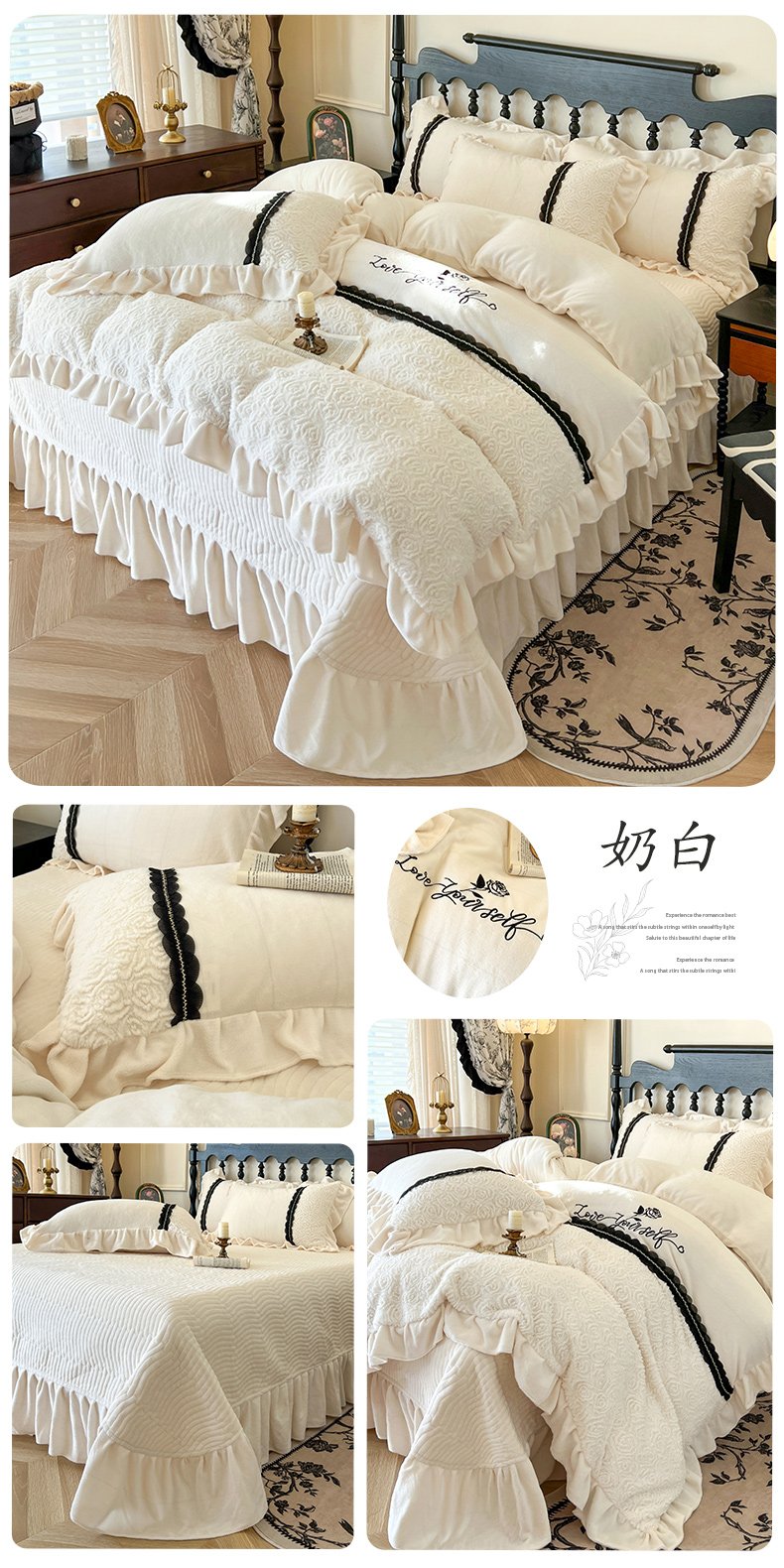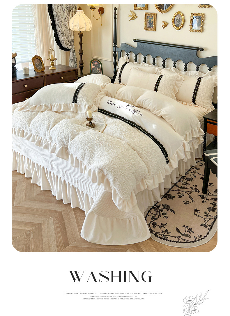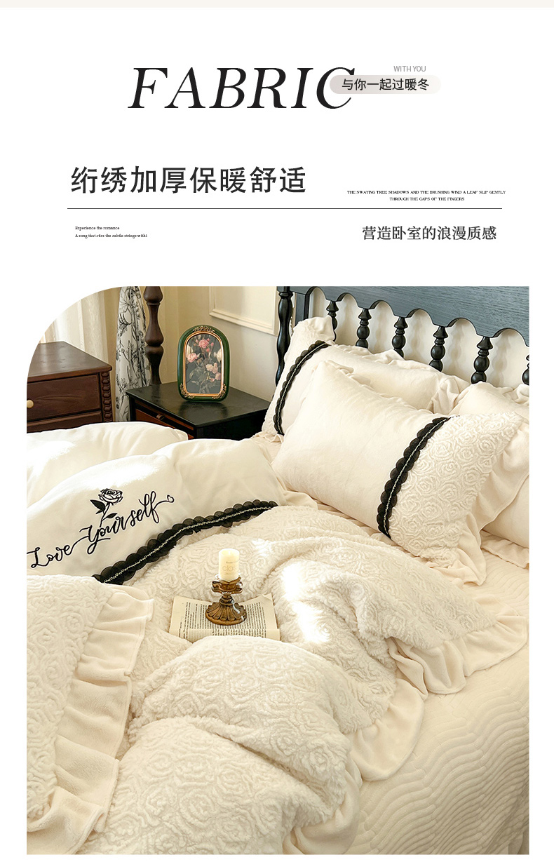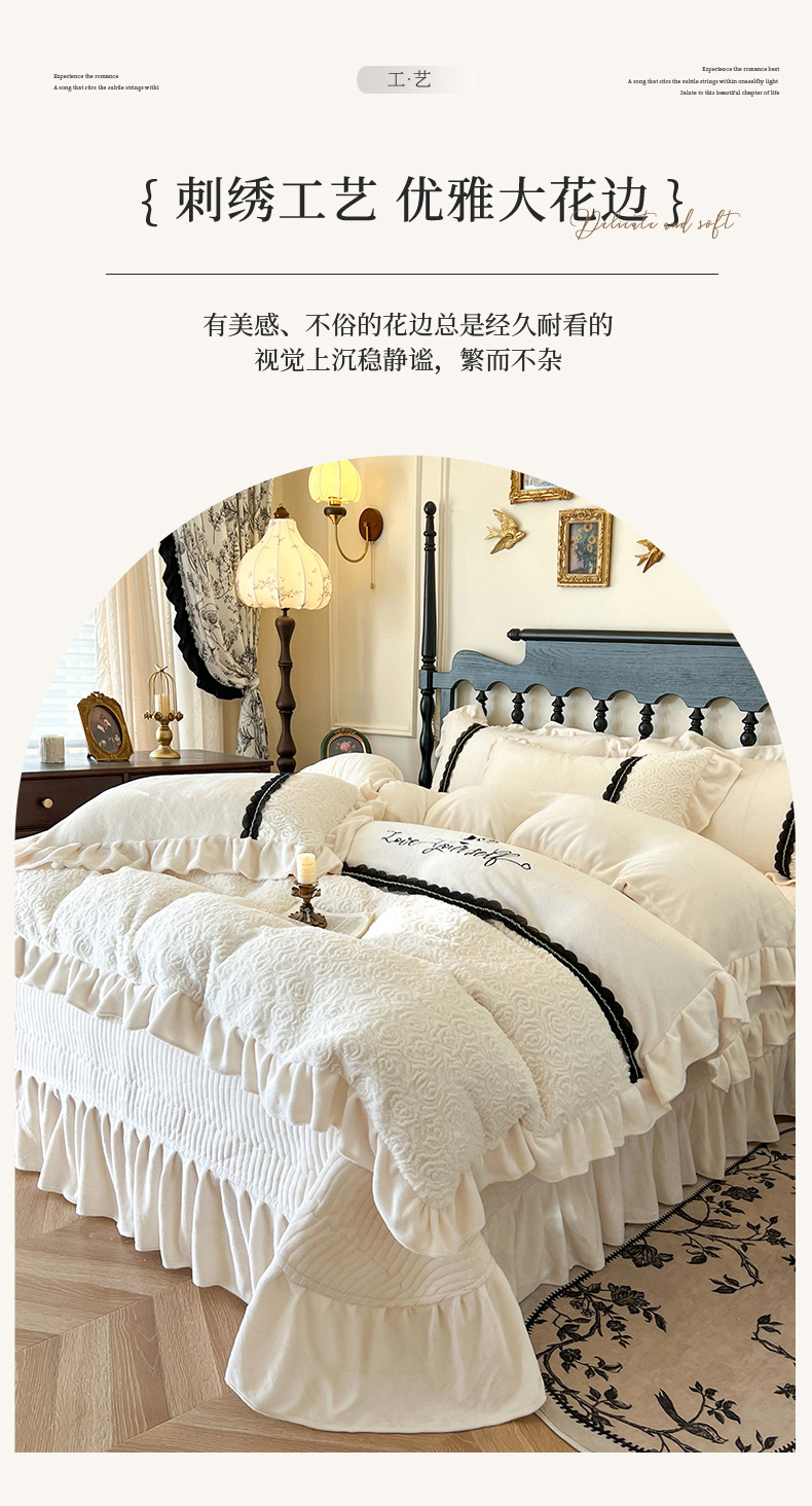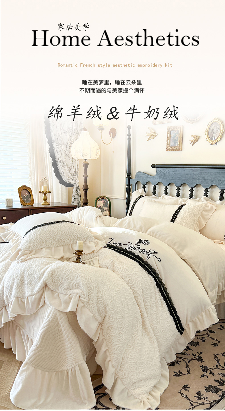 (总)乐朵家居 2025新款 南法庄园 牛奶绒 夹棉床盖四件套,粉玉,奶白