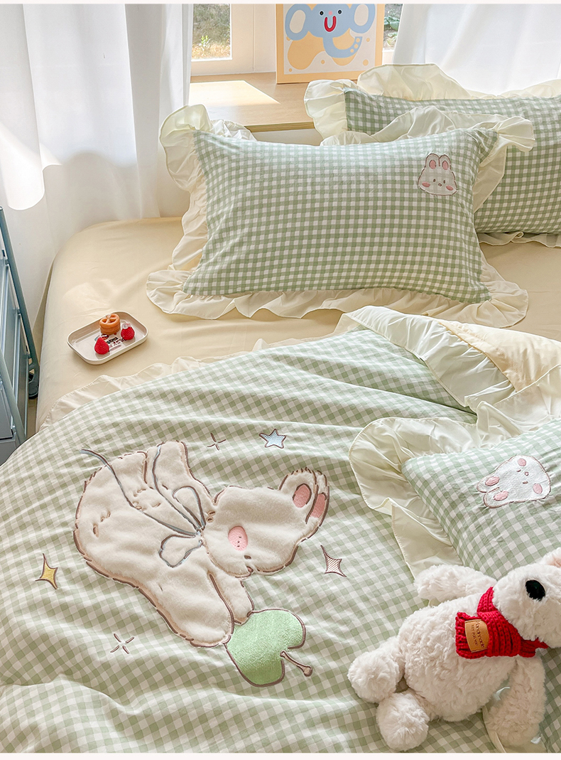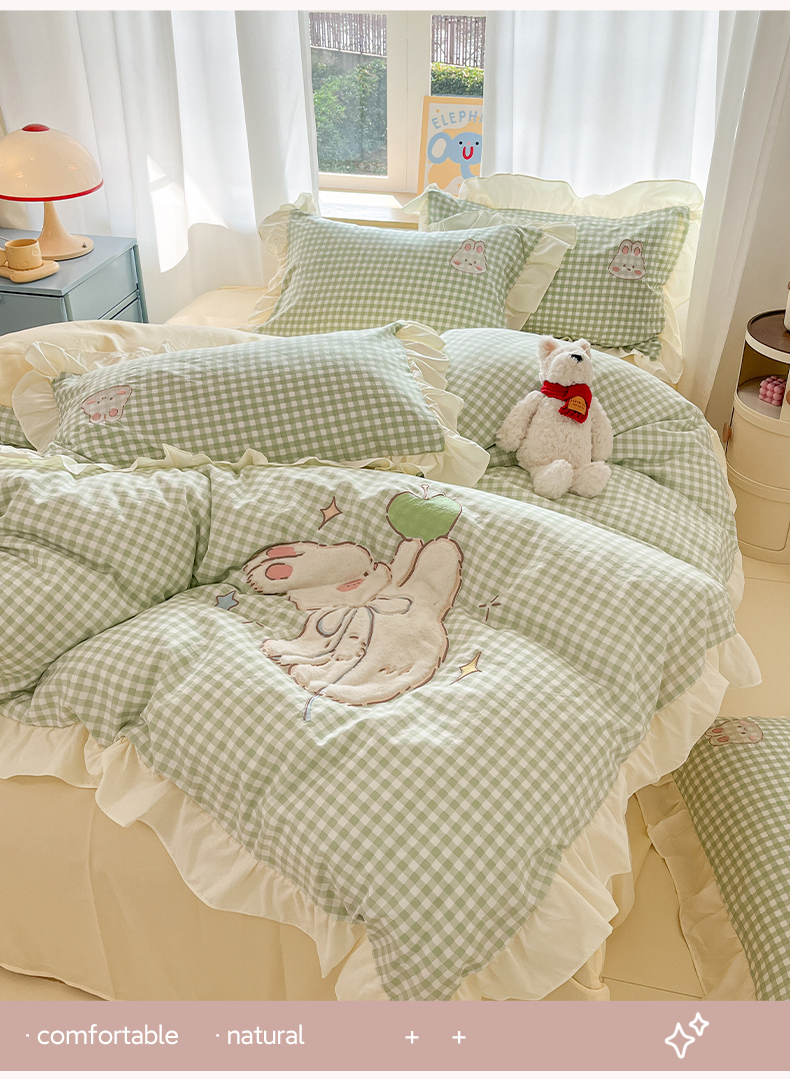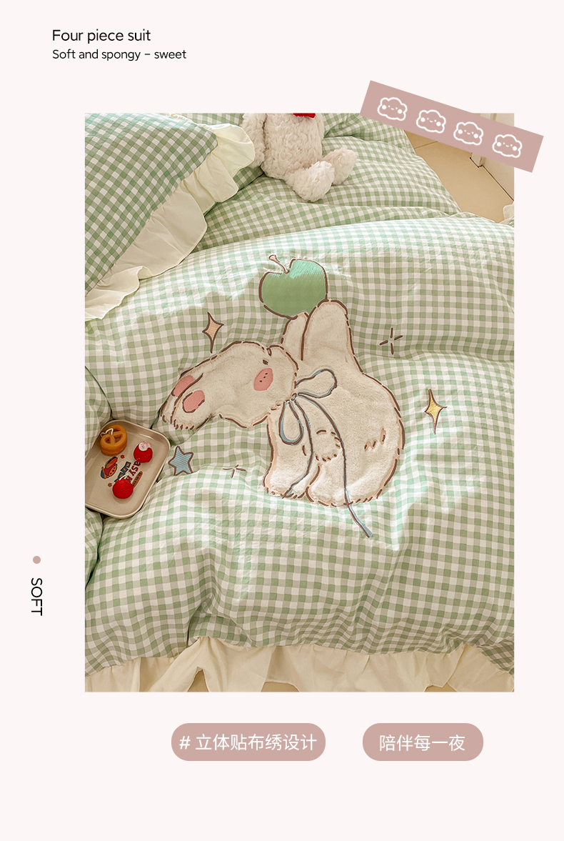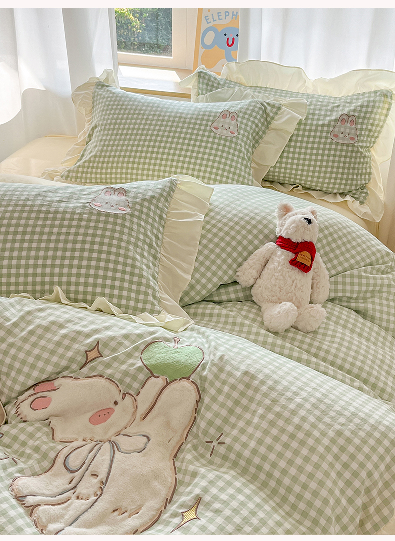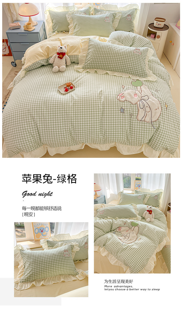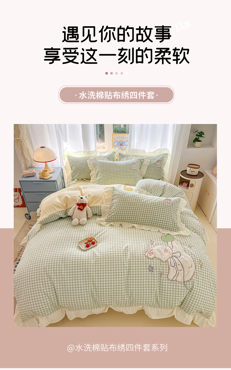 当前位置: 91家纺网 > 商品网购 > 床品套件 > 四件套 > 水洗棉四件套 > 我心家纺 2025新款水洗棉花边贴布绣四件套 苹果兔-绿格
