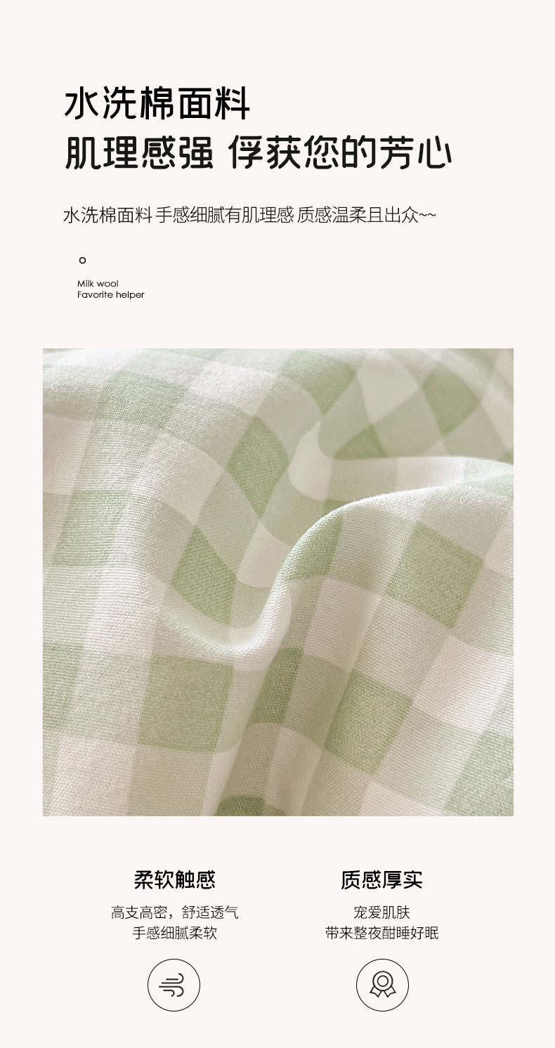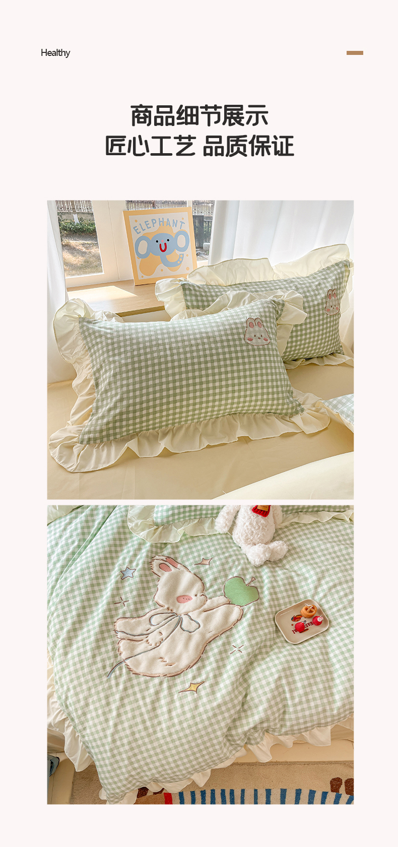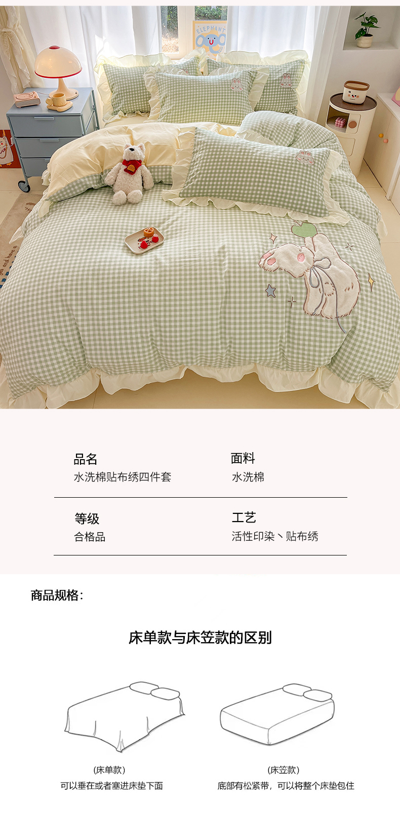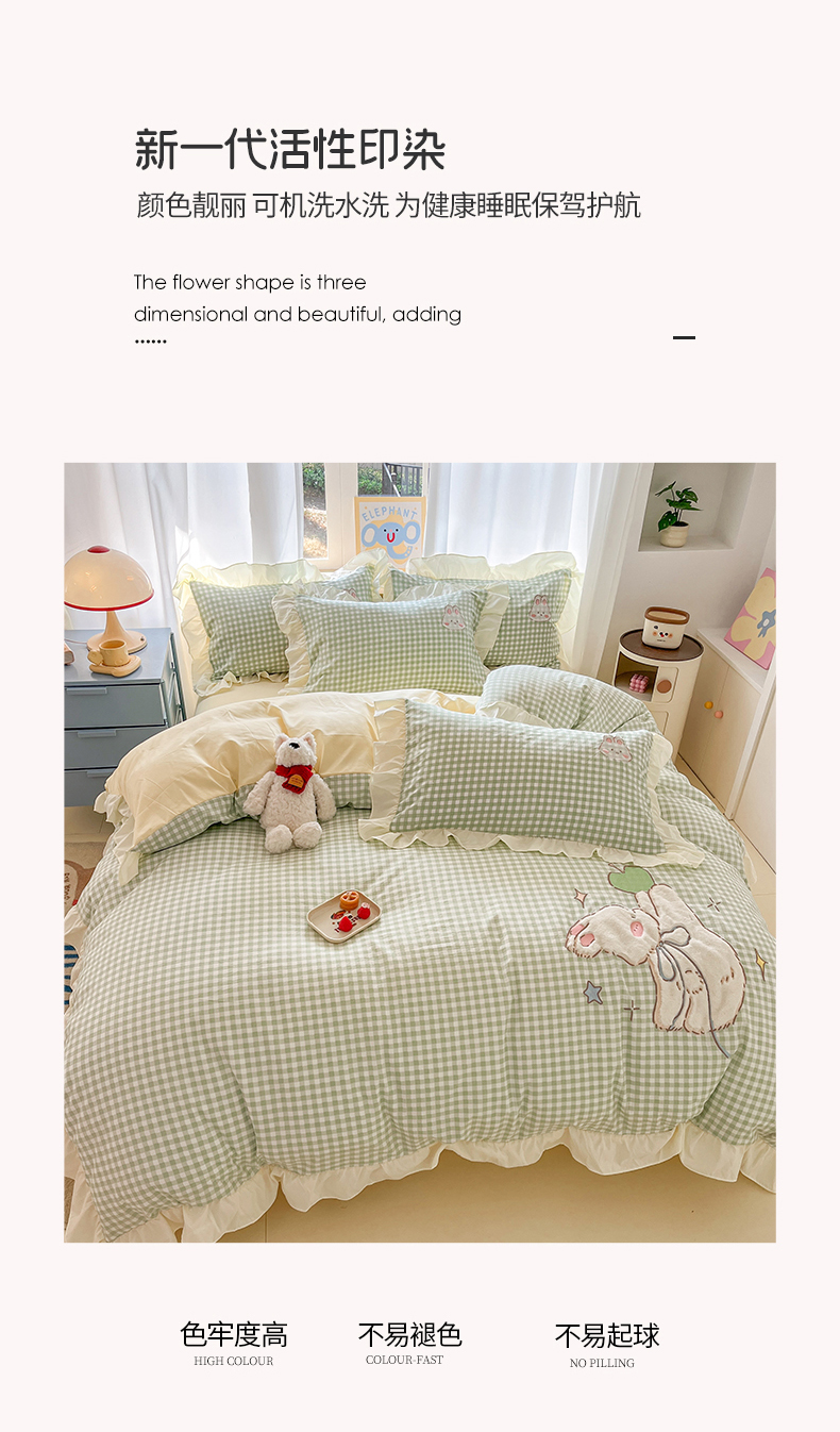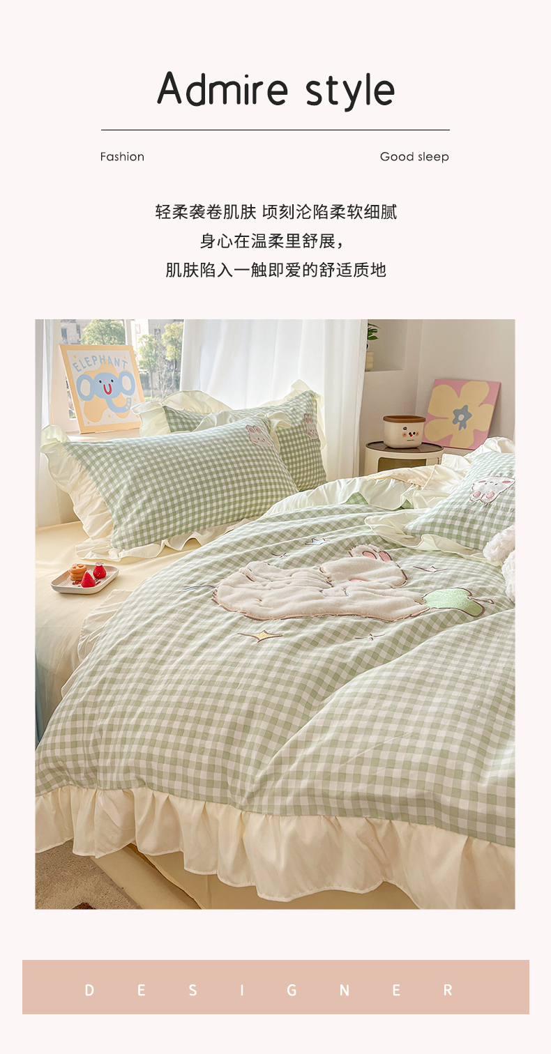 当前位置: 91家纺网 > 商品网购 > 床品套件 > 四件套 > 水洗棉四件套 > 我心家纺 2025新款水洗棉花边贴布绣四件套 苹果兔-绿格
