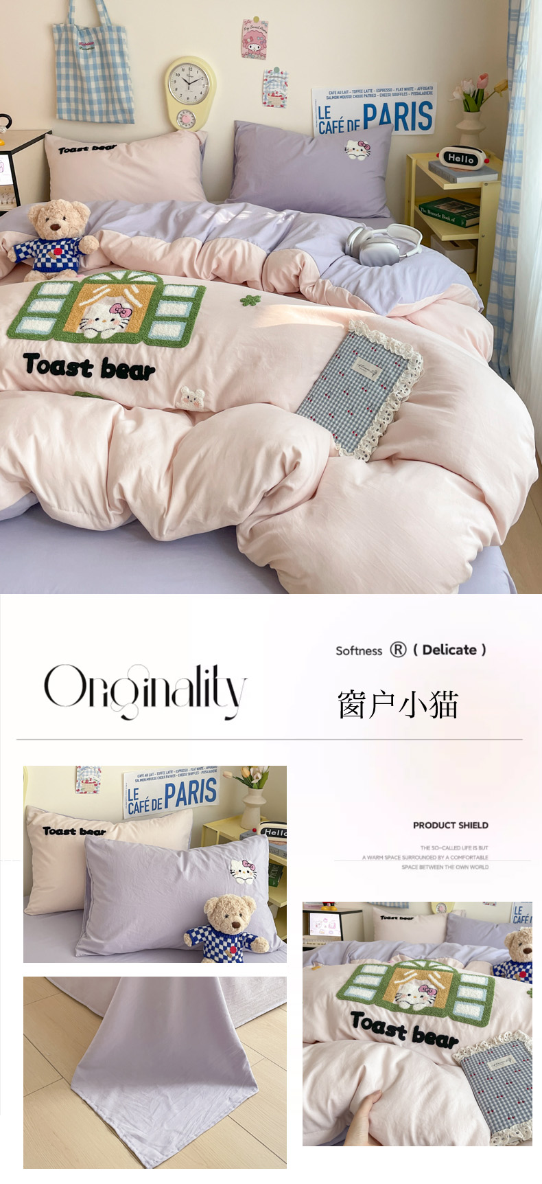 当前位置: 91家纺网 > 商品网购 > 床品套件 > 四件套 > 毛巾绣四件套 > 雨帆家纺 2025新款水洗棉卡通毛巾绣四件套 窗户小猫