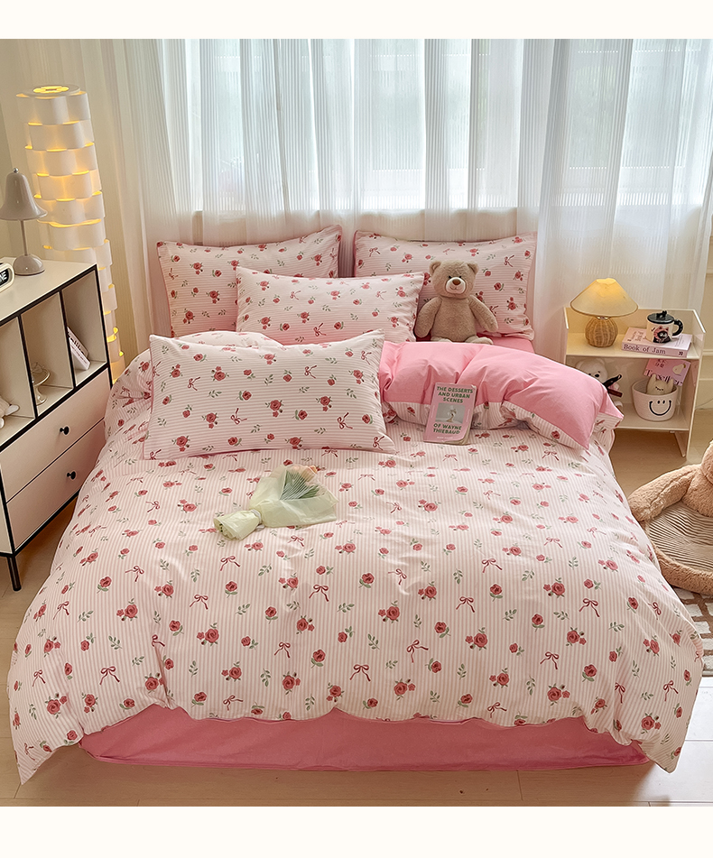 雅居纺家纺 2025新款全棉小清新四件套 粉色烂漫