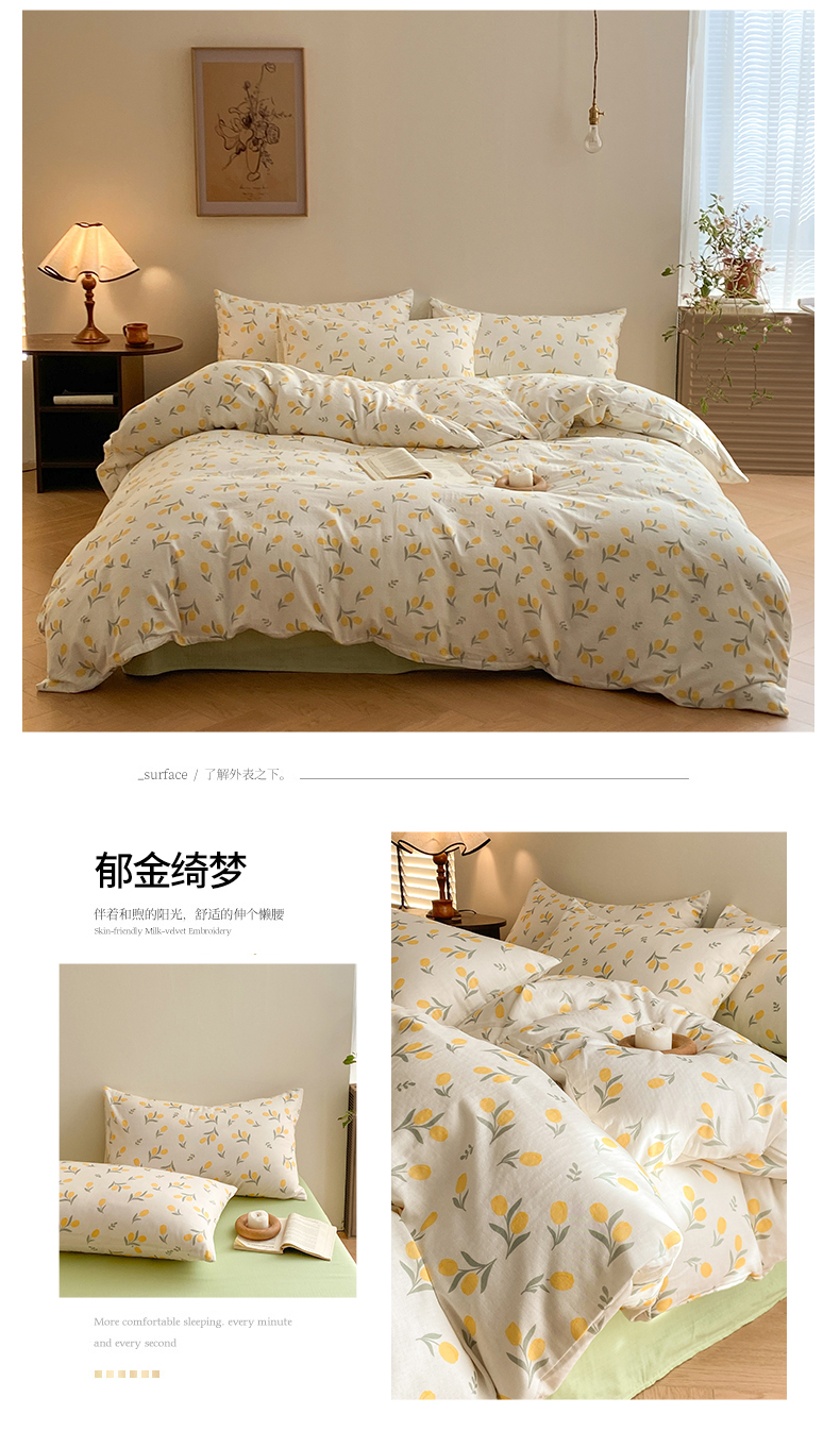 当前位置: 91家纺网 > 商品网购 > 床品套件 > 四件套 > 全棉普通四件套 > 2025新款A类母婴级有氧全棉纯棉双层纱纯棉印花四件套 场景一 郁金绮梦