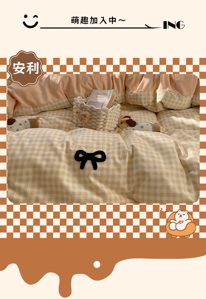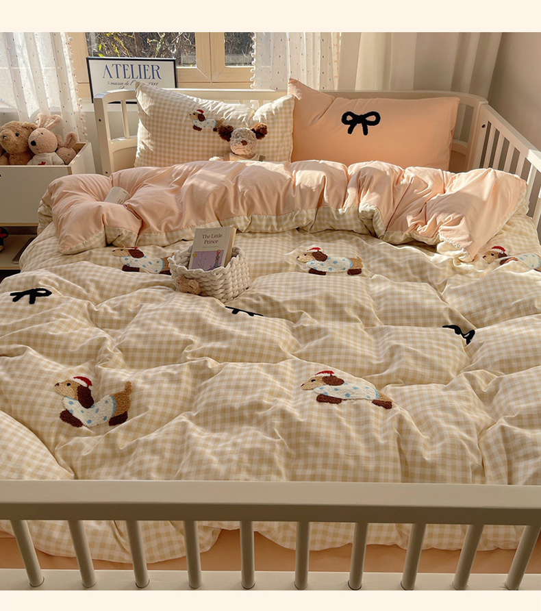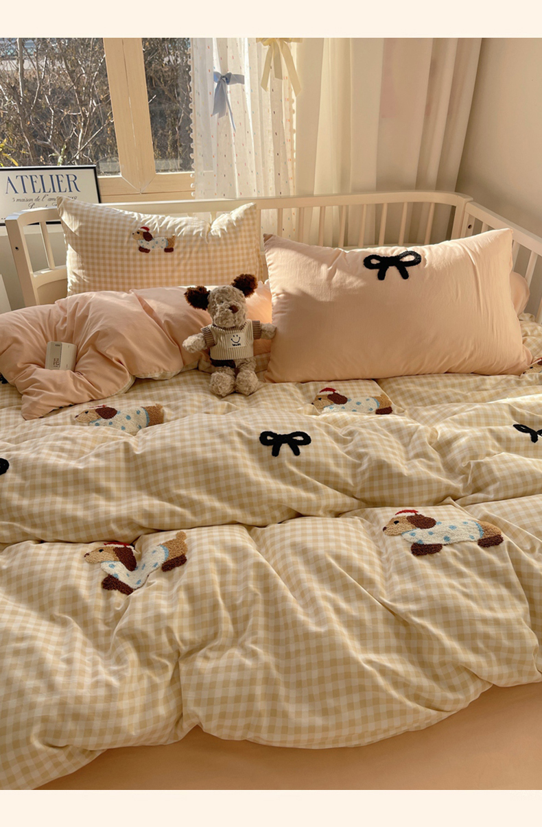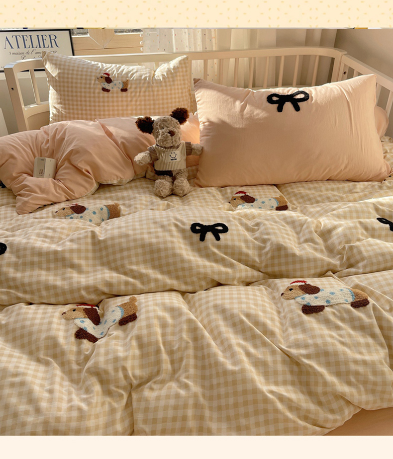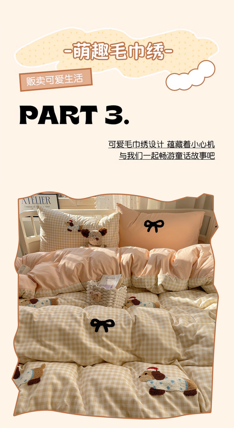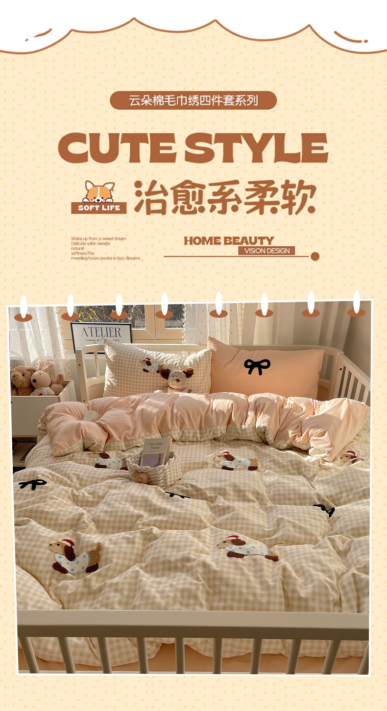 当前位置: 91家纺网 > 商品网购 > 床品套件 > 四件套 > 红嘴企鹅 2025新款水洗棉毛巾绣四件套 咖格蝴蝶结狗狗