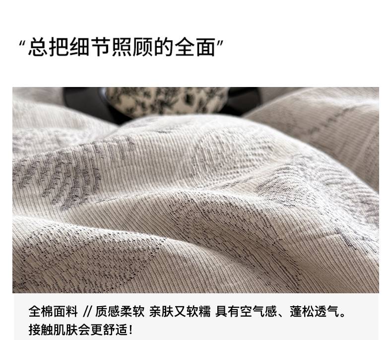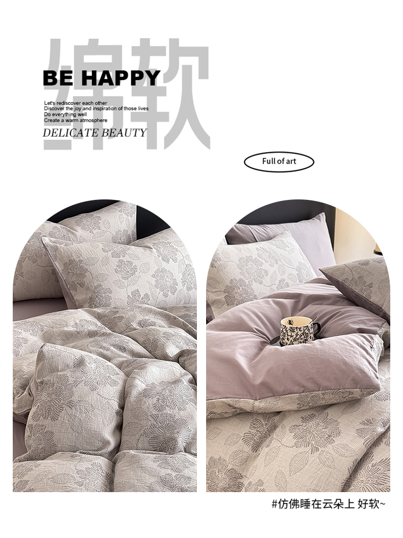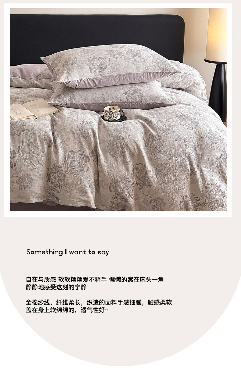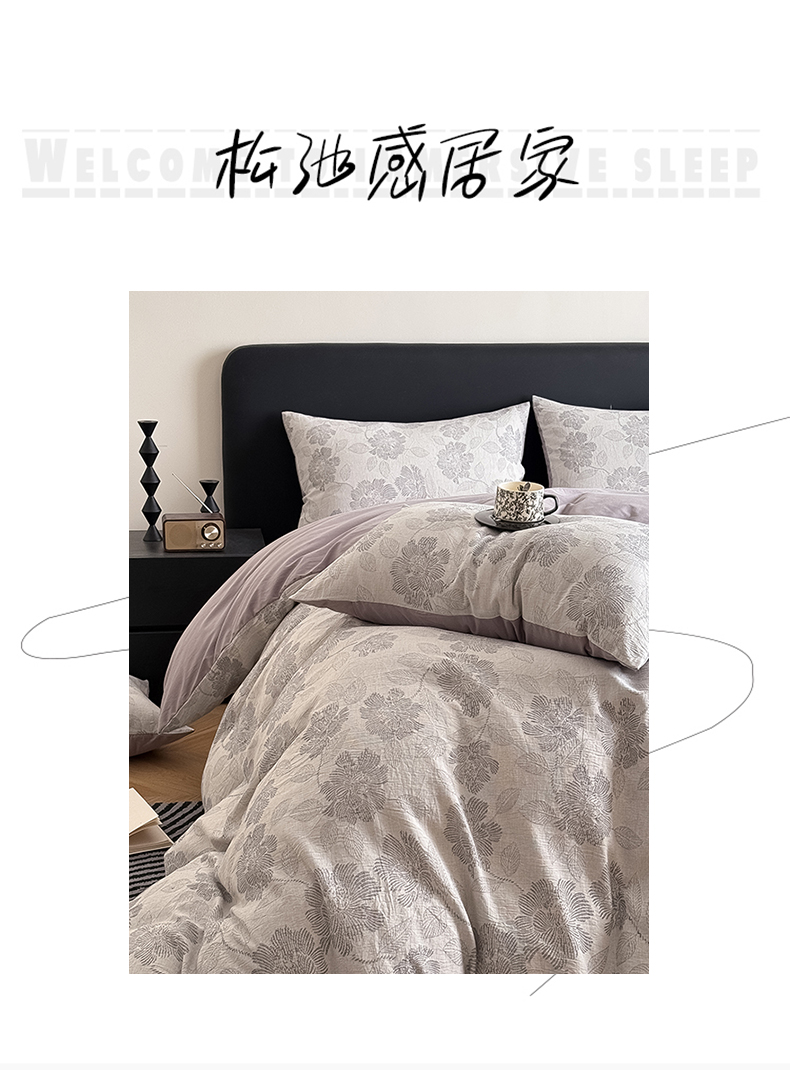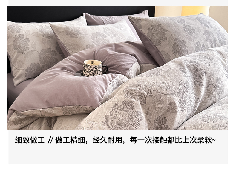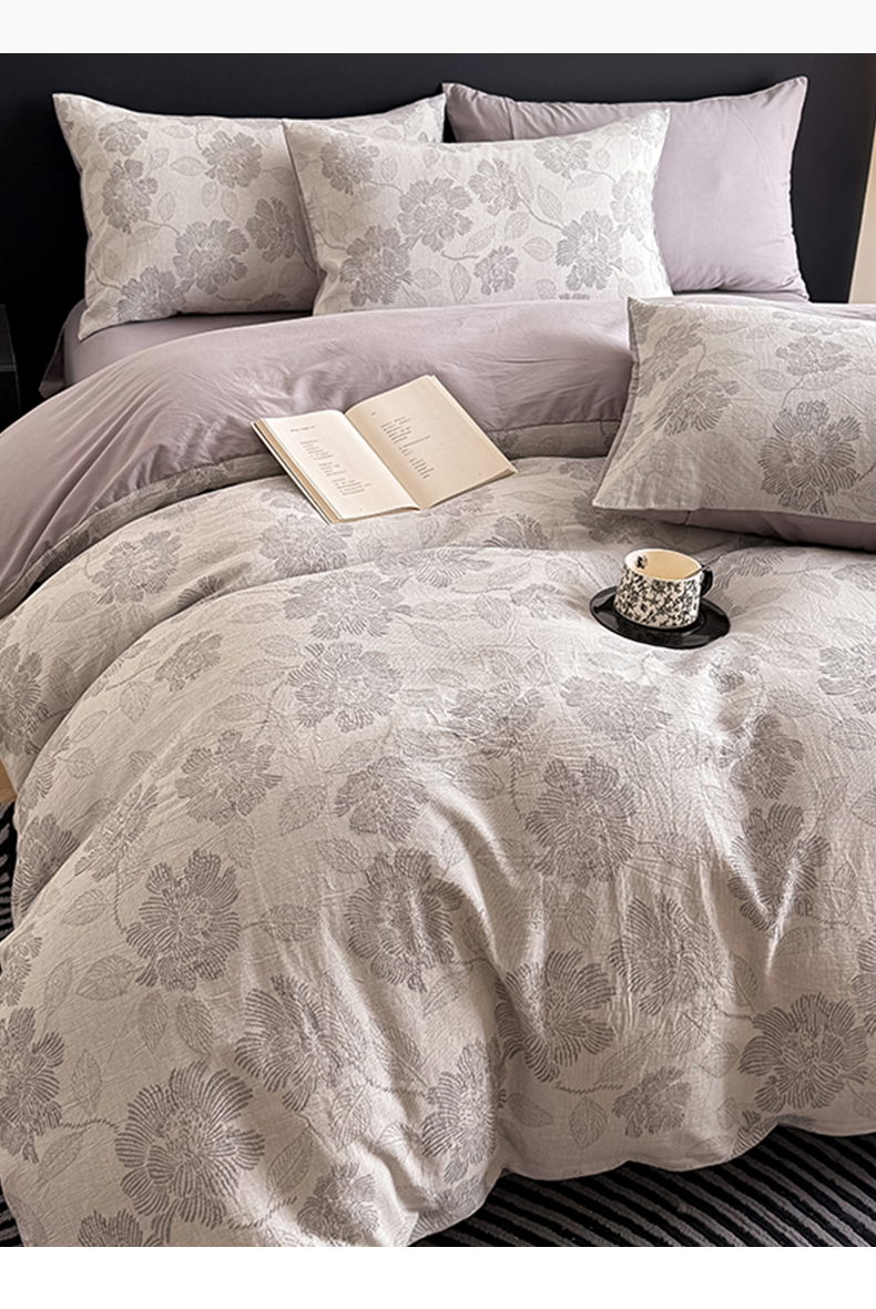 商品名称:水云缦 2025新款水云缦全棉三层纱色织大提花四件套 花影悦动-灰