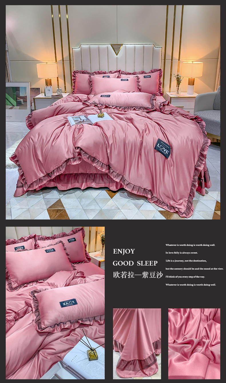 商品名称:(买家秀不断货)A类高端皇室贵族韩版水洗真丝四件套轻奢四件套轻奢水洗蕾丝四件套高级感丝滑裸睡床上用品 欧若拉-紫豆沙