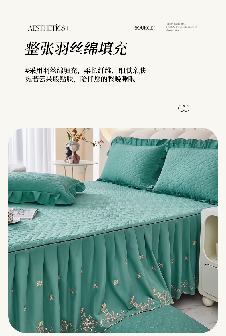 家之硕家纺 2025新款云朵棉刺绣床裙四件套单床裙 湖绿