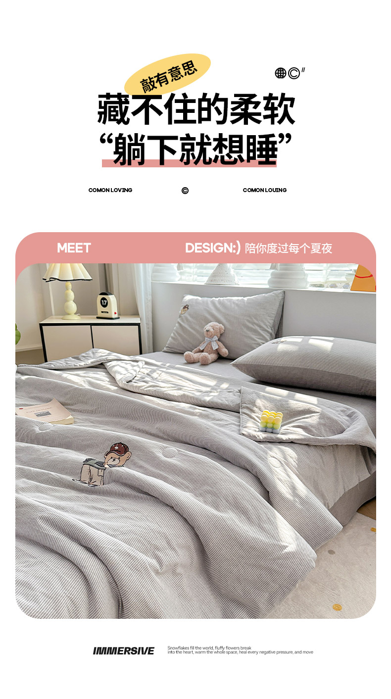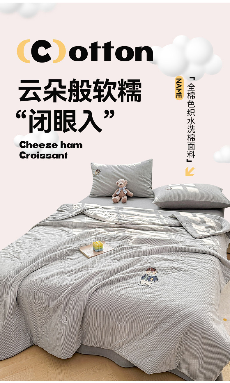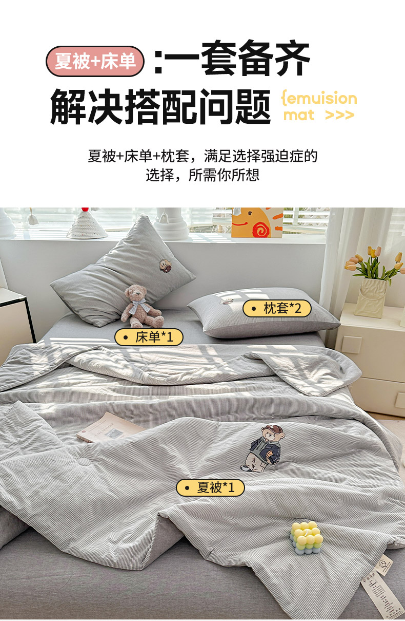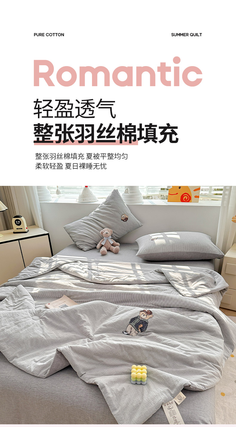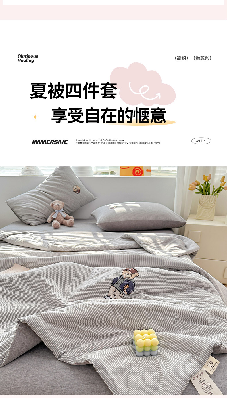 商品名称:大境 2025新款专版纯棉色织水洗棉刺绣全棉夏被四件套 篮球小熊-细条灰