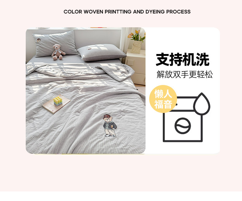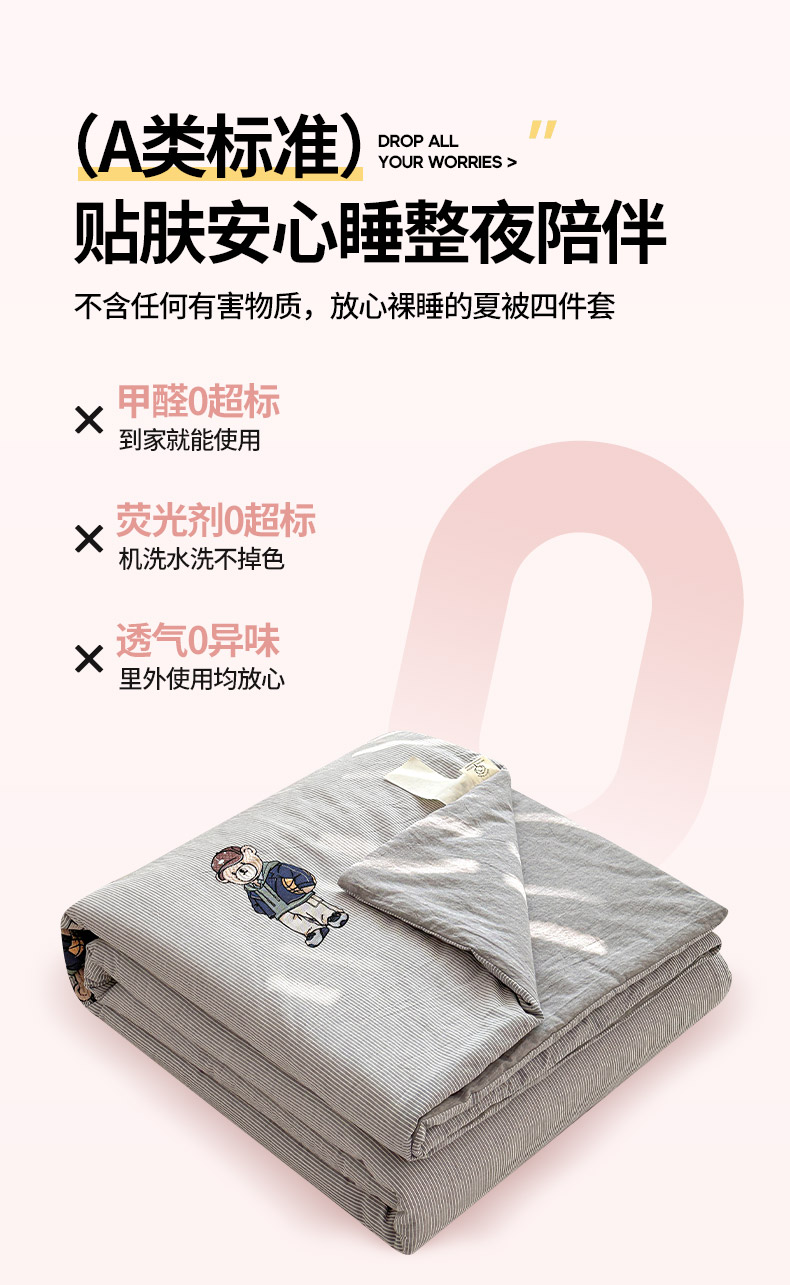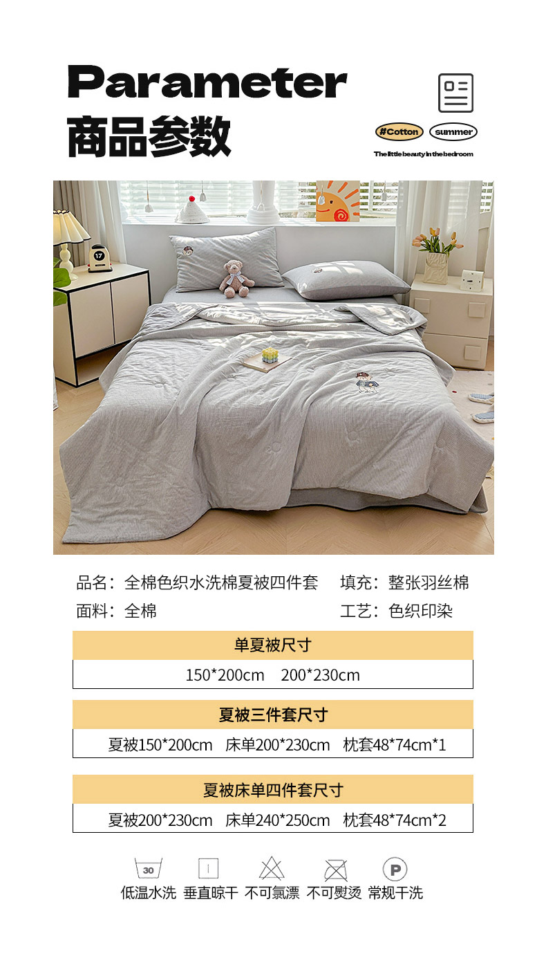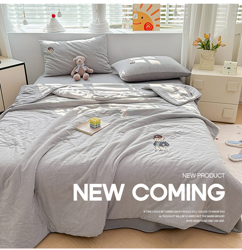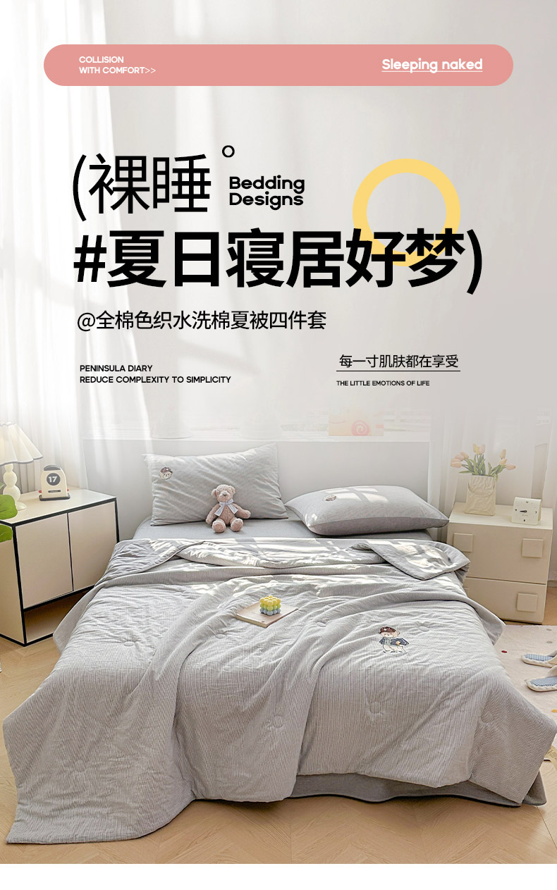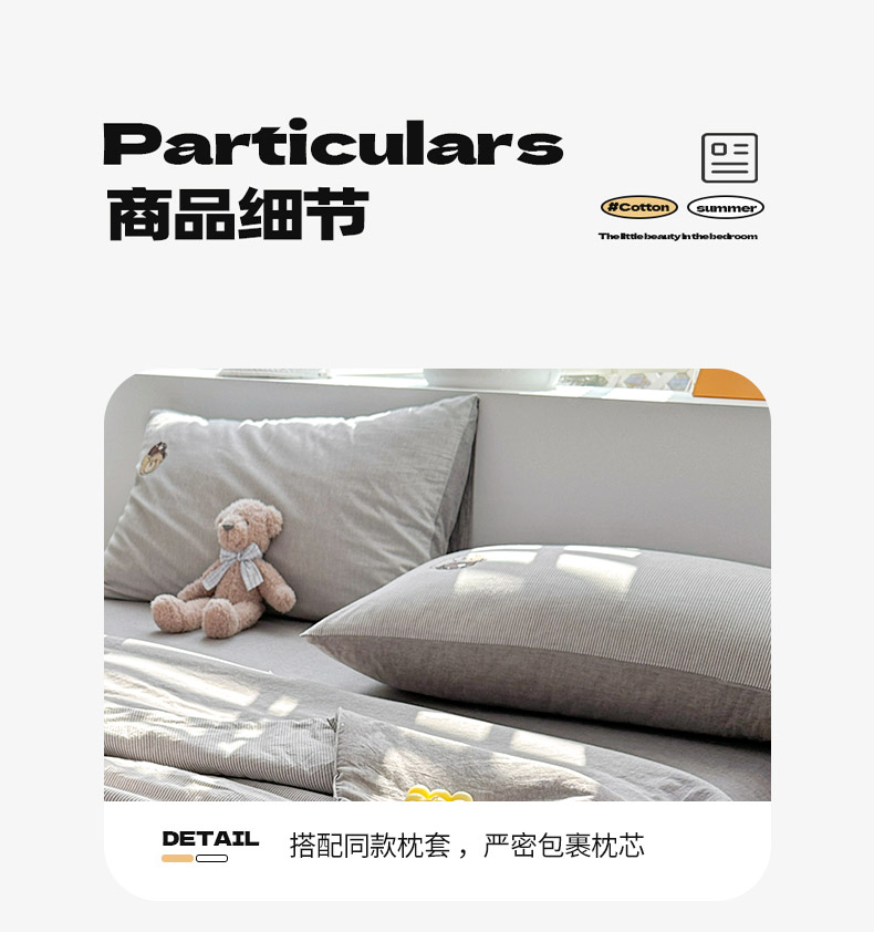 商品名称:大境 2025新款专版纯棉色织水洗棉刺绣全棉夏被四件套 篮球小熊-细条灰