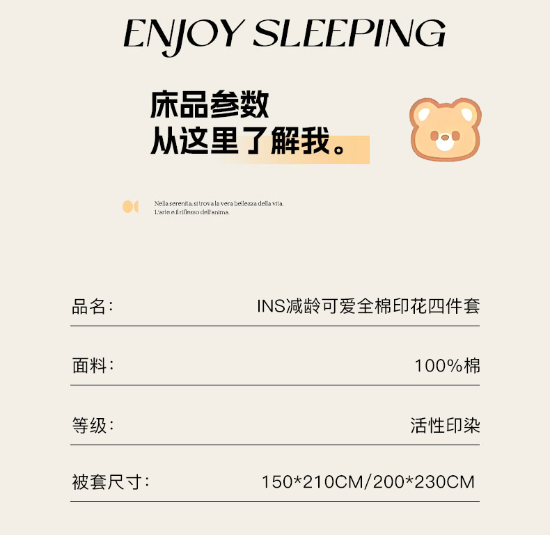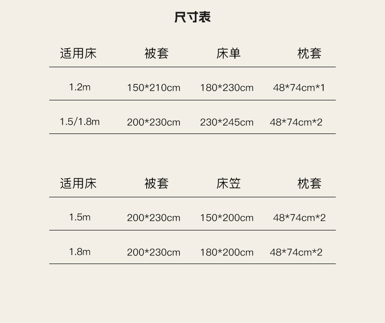1.5/1.8米床四件套:被套200*230cm 床单230*245cm 枕套48*74cm | ¥90.00 |