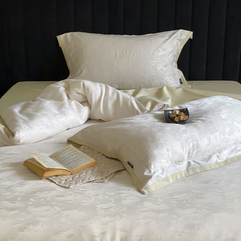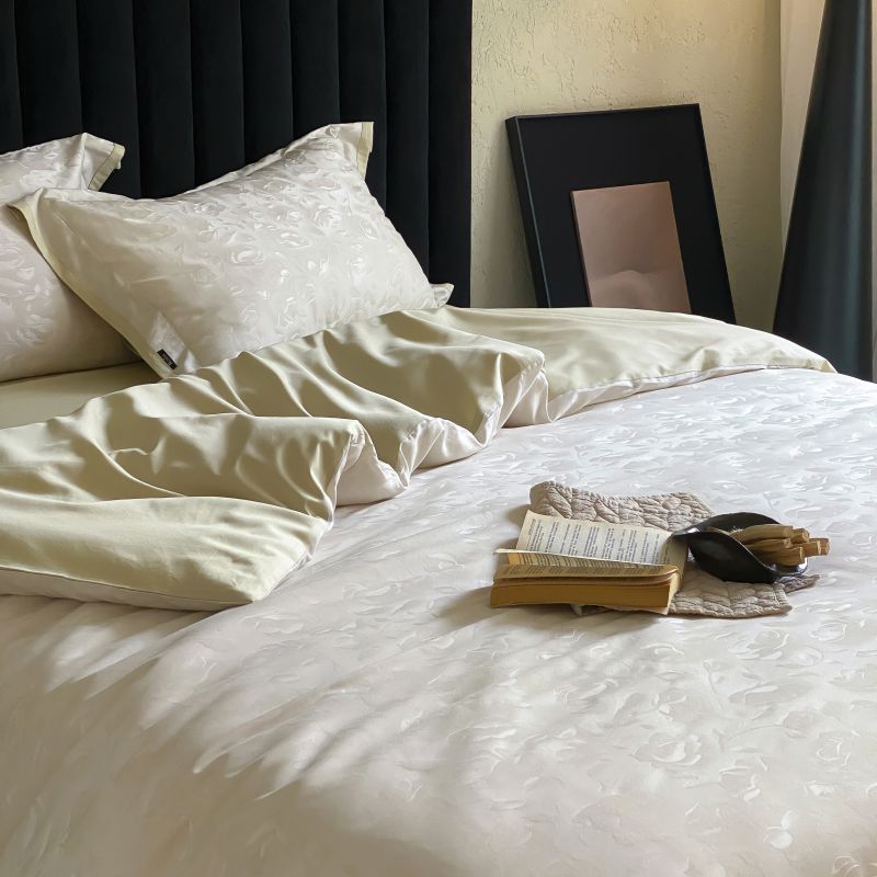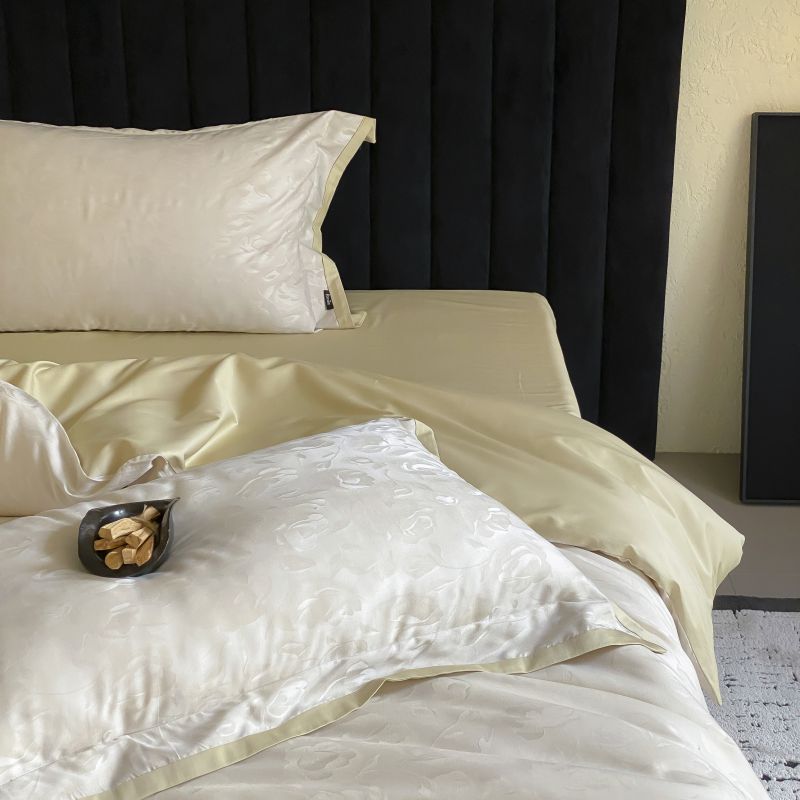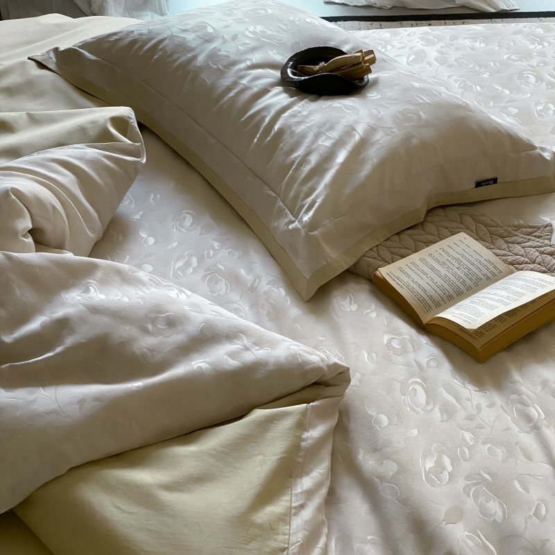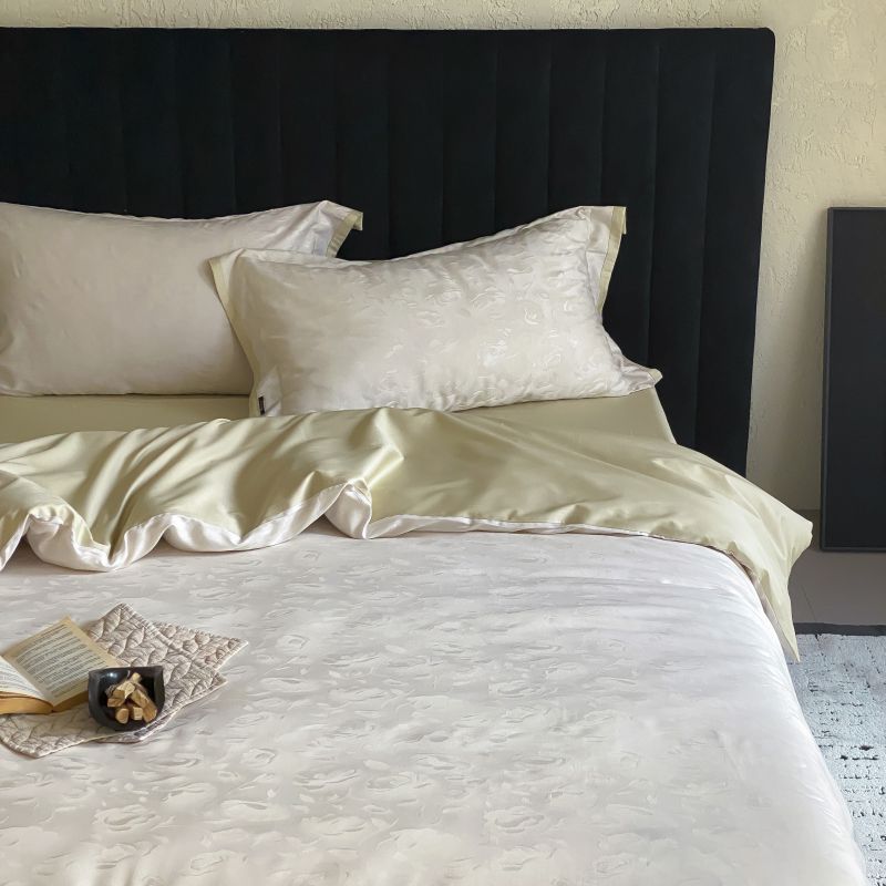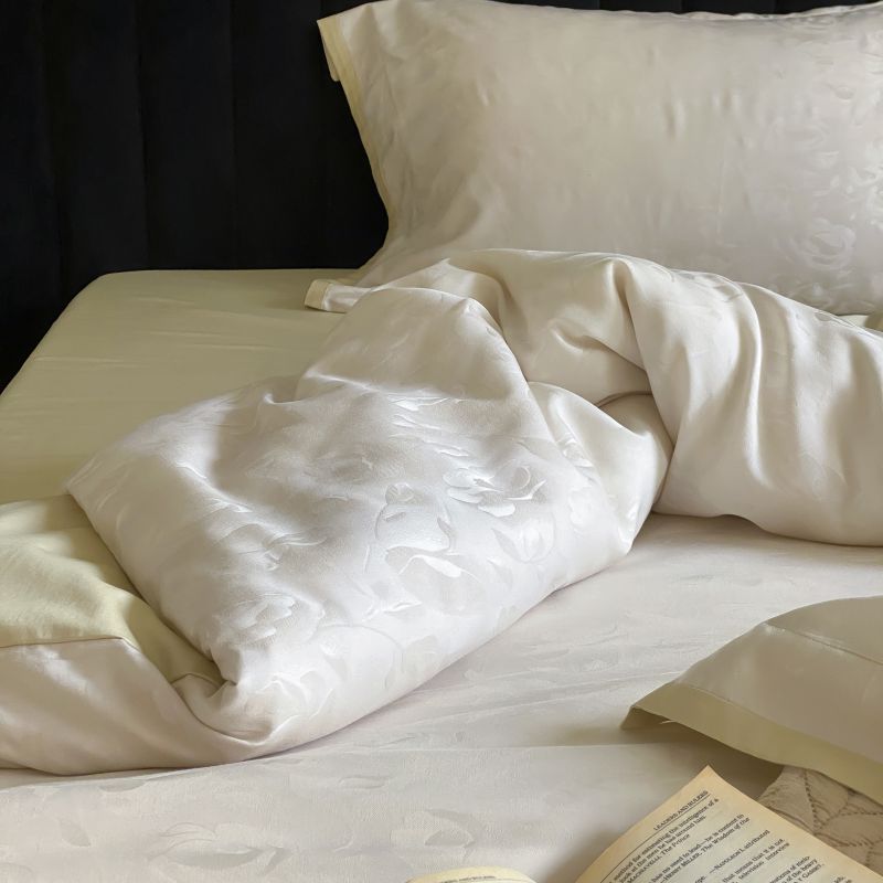 商品名称:玉宇阁2025新款100S色织天丝棉大提花四件套-山茶漫漫 山茶漫漫薄雾清晨
