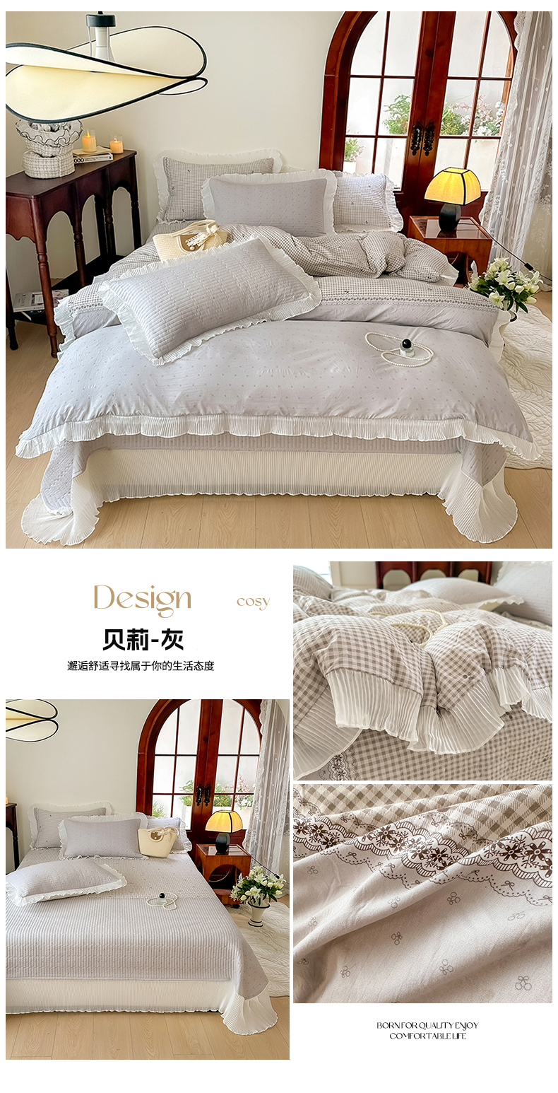 商品名称:赫本家纺 2025新款水洗棉花边款夹棉床盖三件套四件套 贝莉-灰