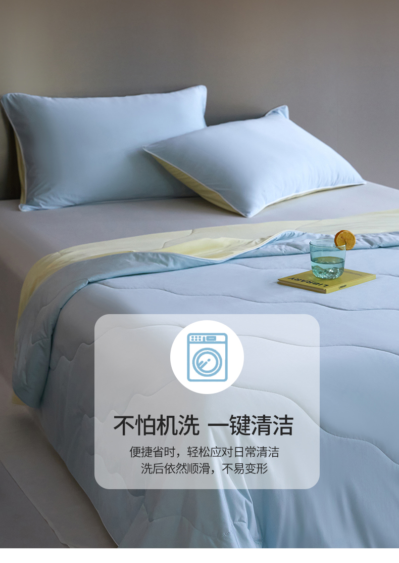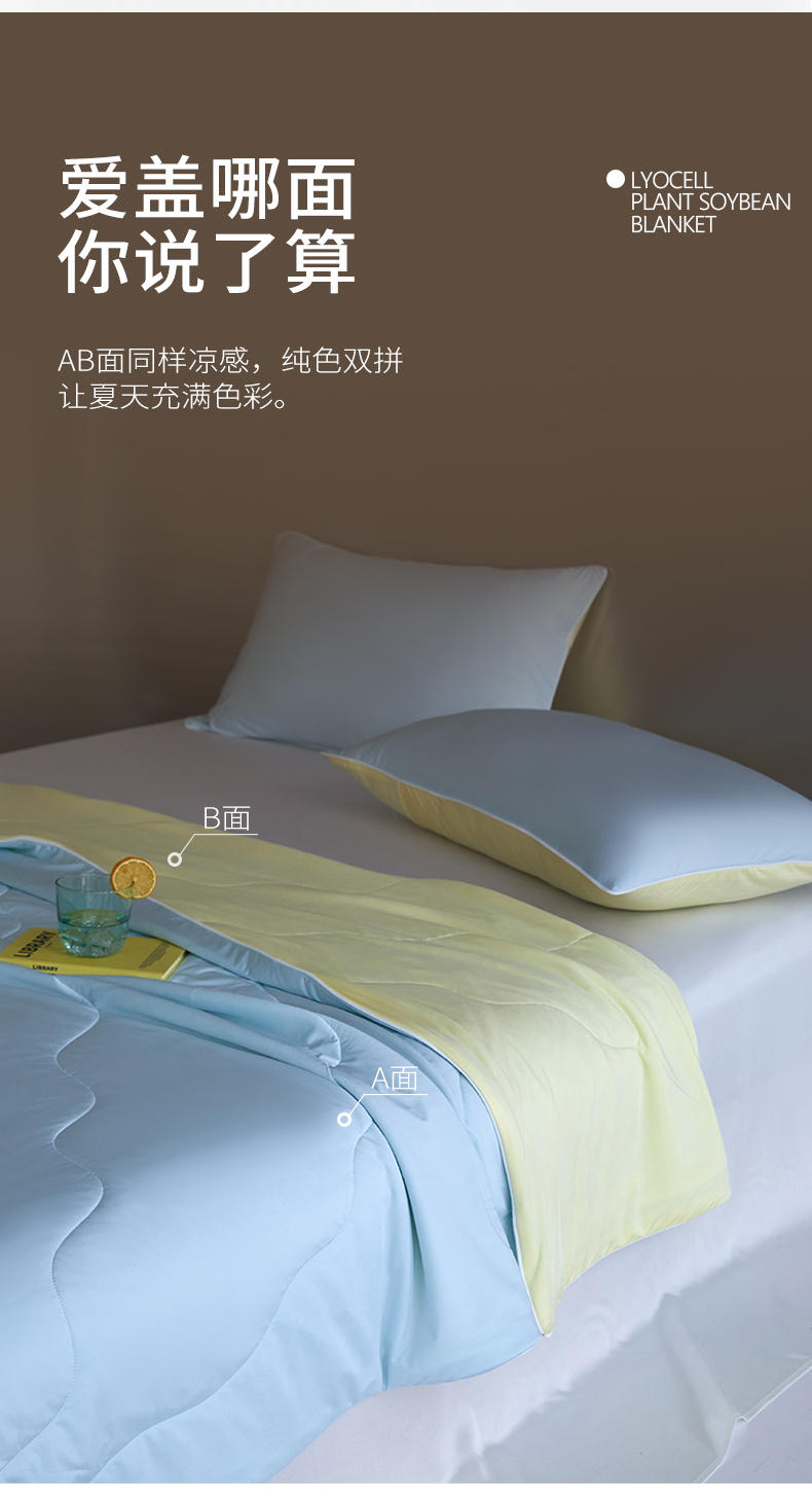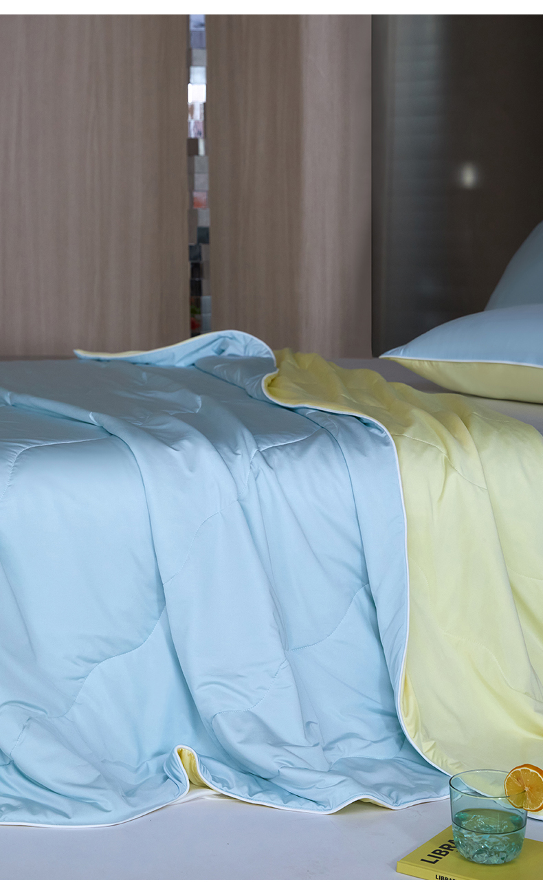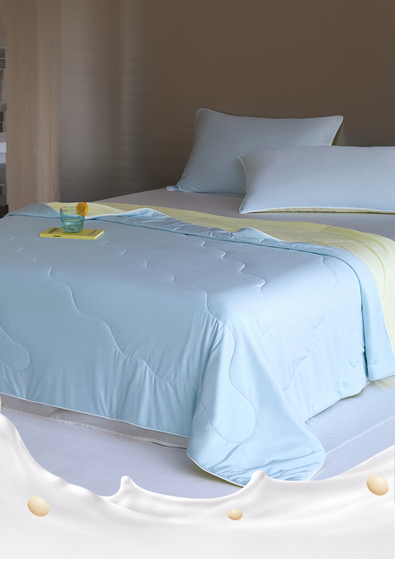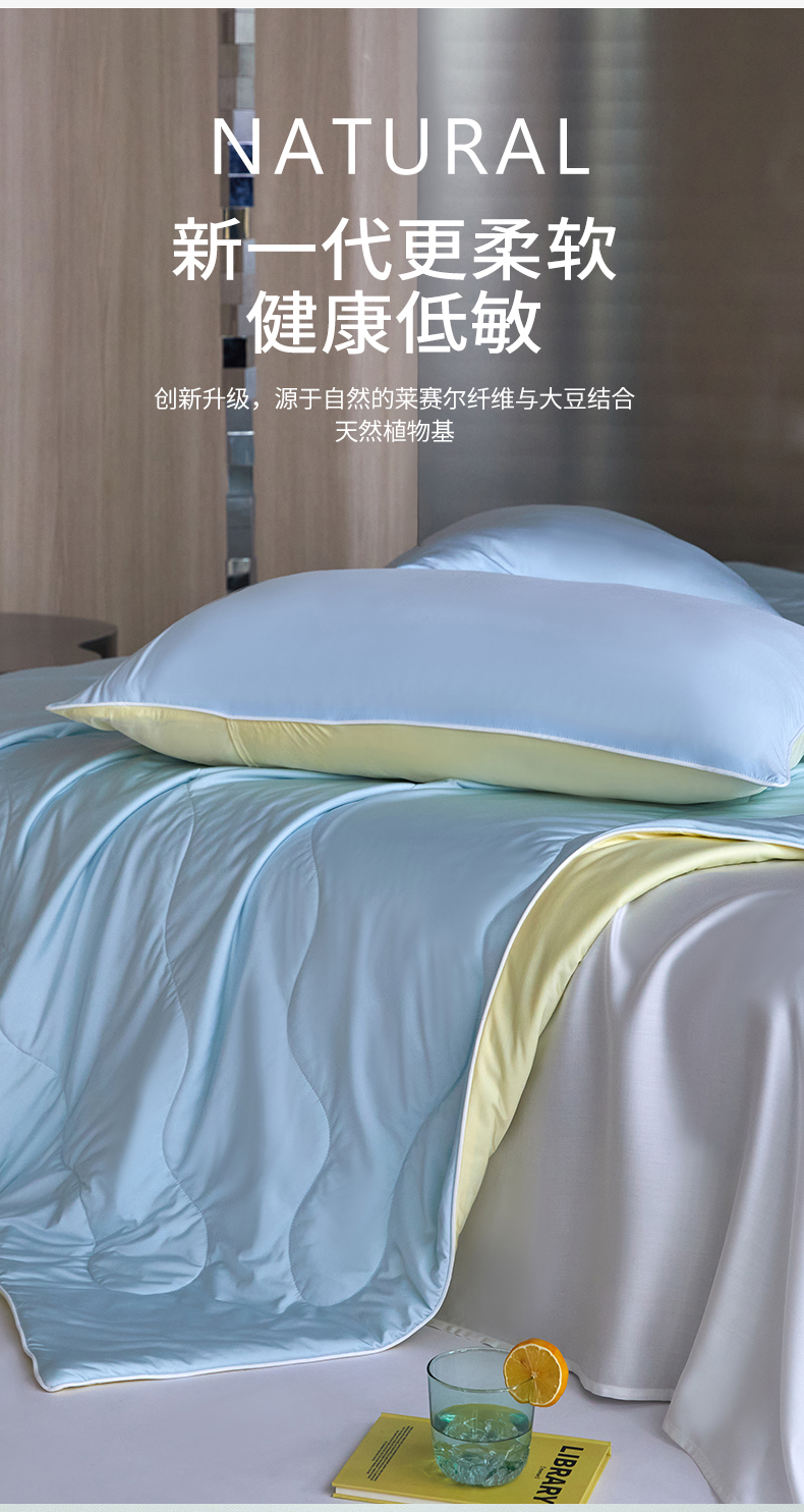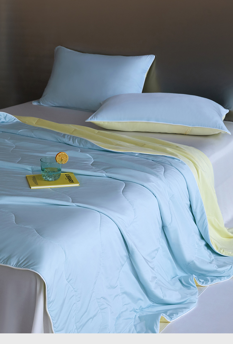 被子 > 夏被 > 头等舱 2025新款锦氨(165克)水光亮面锦A类55莱赛尔植物大豆7A抗菌夏凉被夏被-配礼盒(空镜图) 浅天兰+奶黄