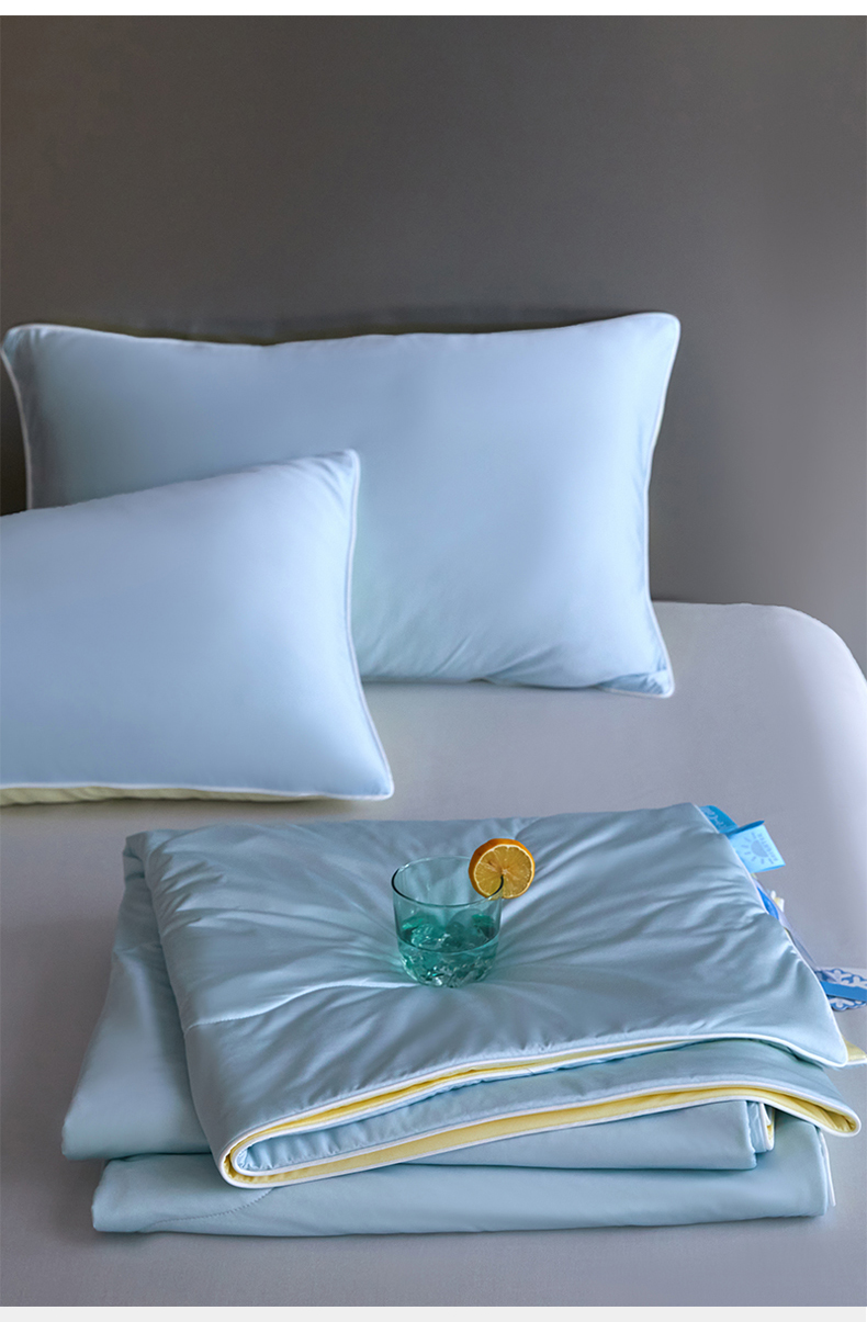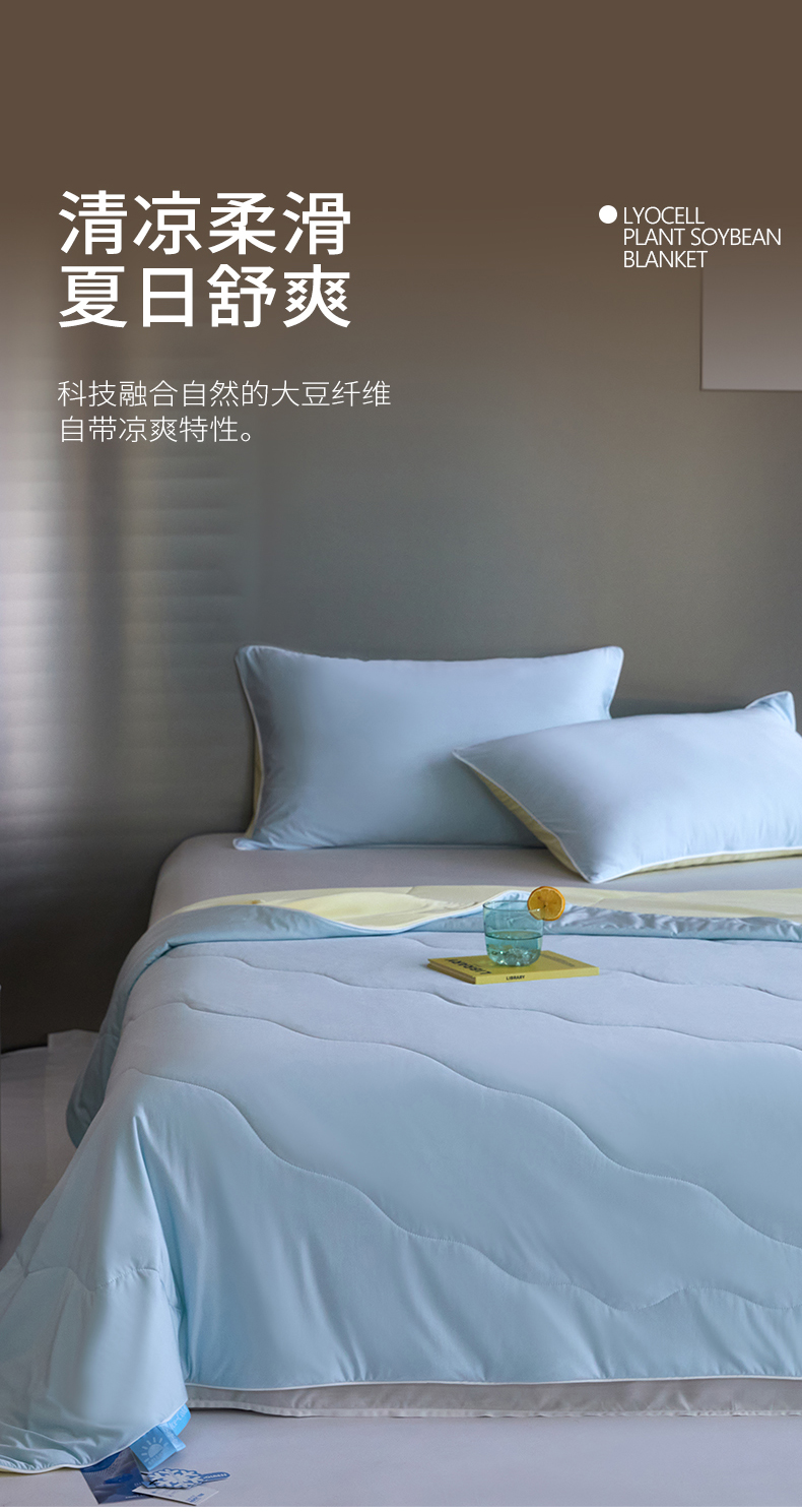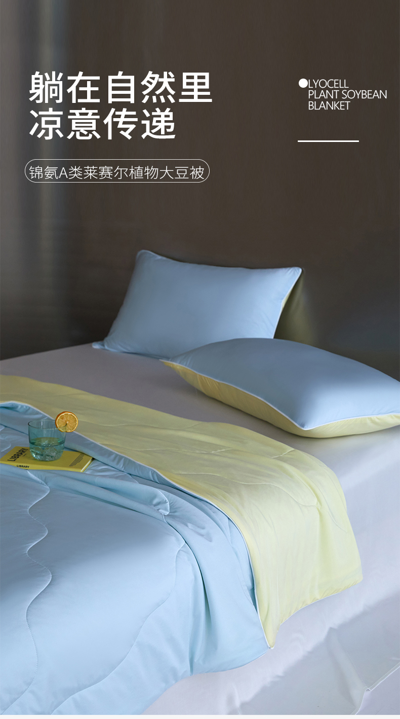 商品名称:头等舱 2025新款锦氨(165克)水光亮面锦A类55莱赛尔植物大豆7A抗菌夏凉被夏被-配礼盒(空镜图) 浅天兰+奶黄