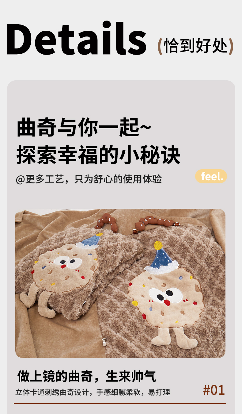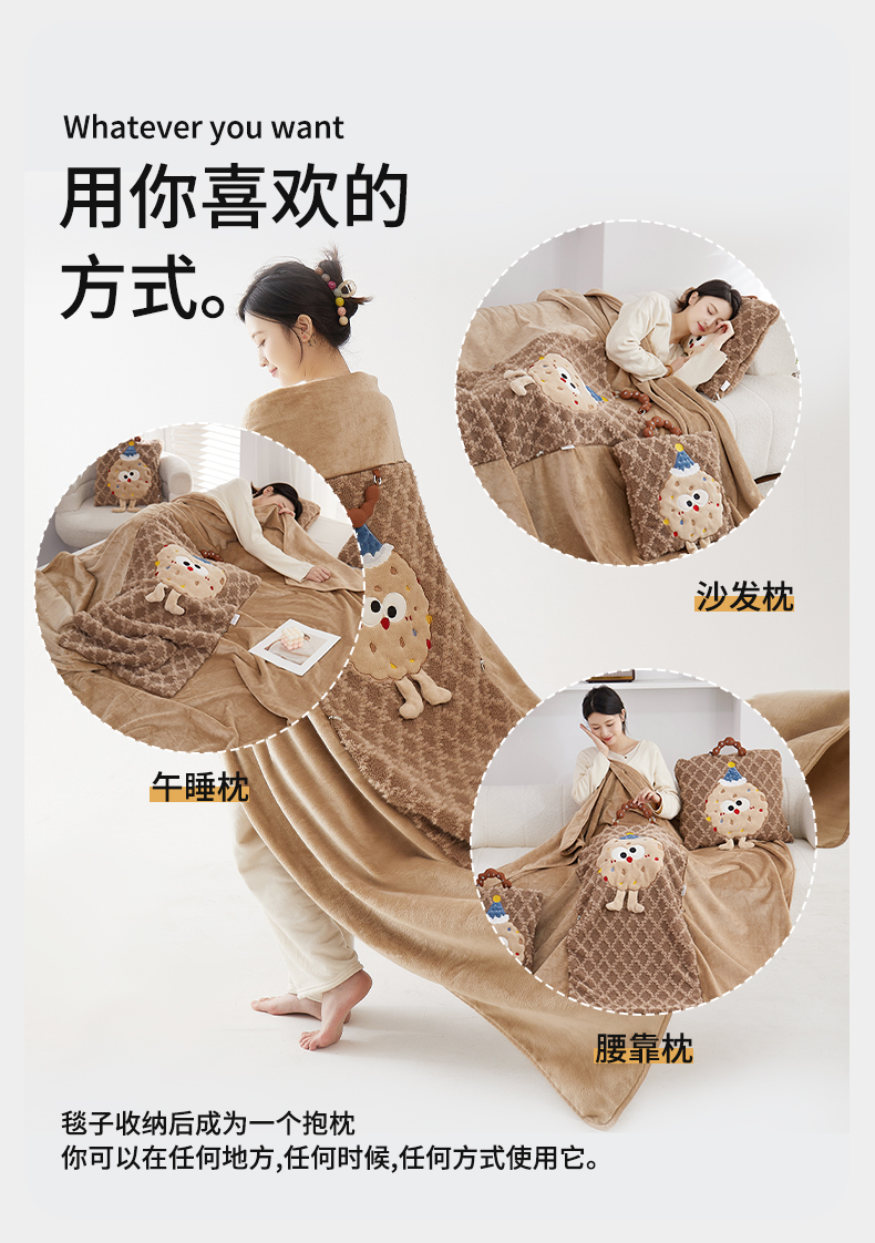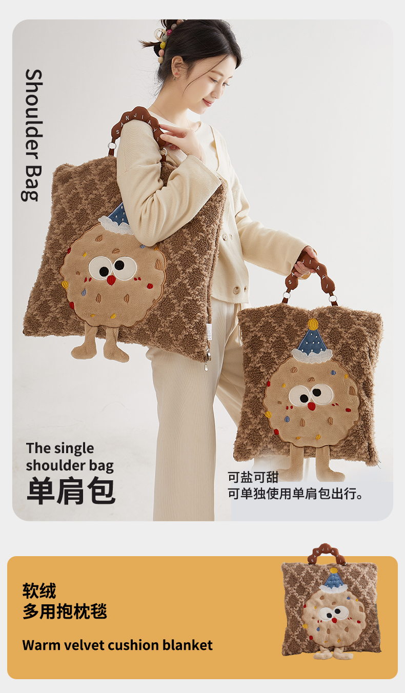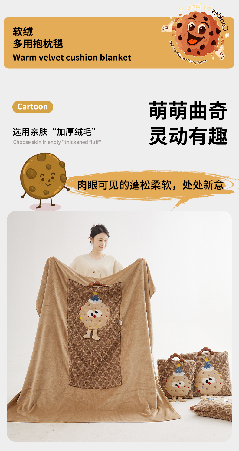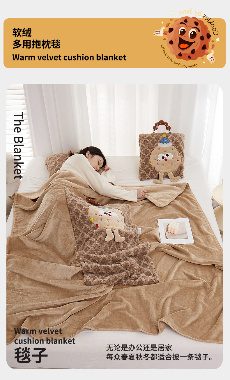 商品名称:古本家居 2025新款贴布立体卡通刺绣曲奇抱枕毯抱枕被 曲奇毛毯-咖色