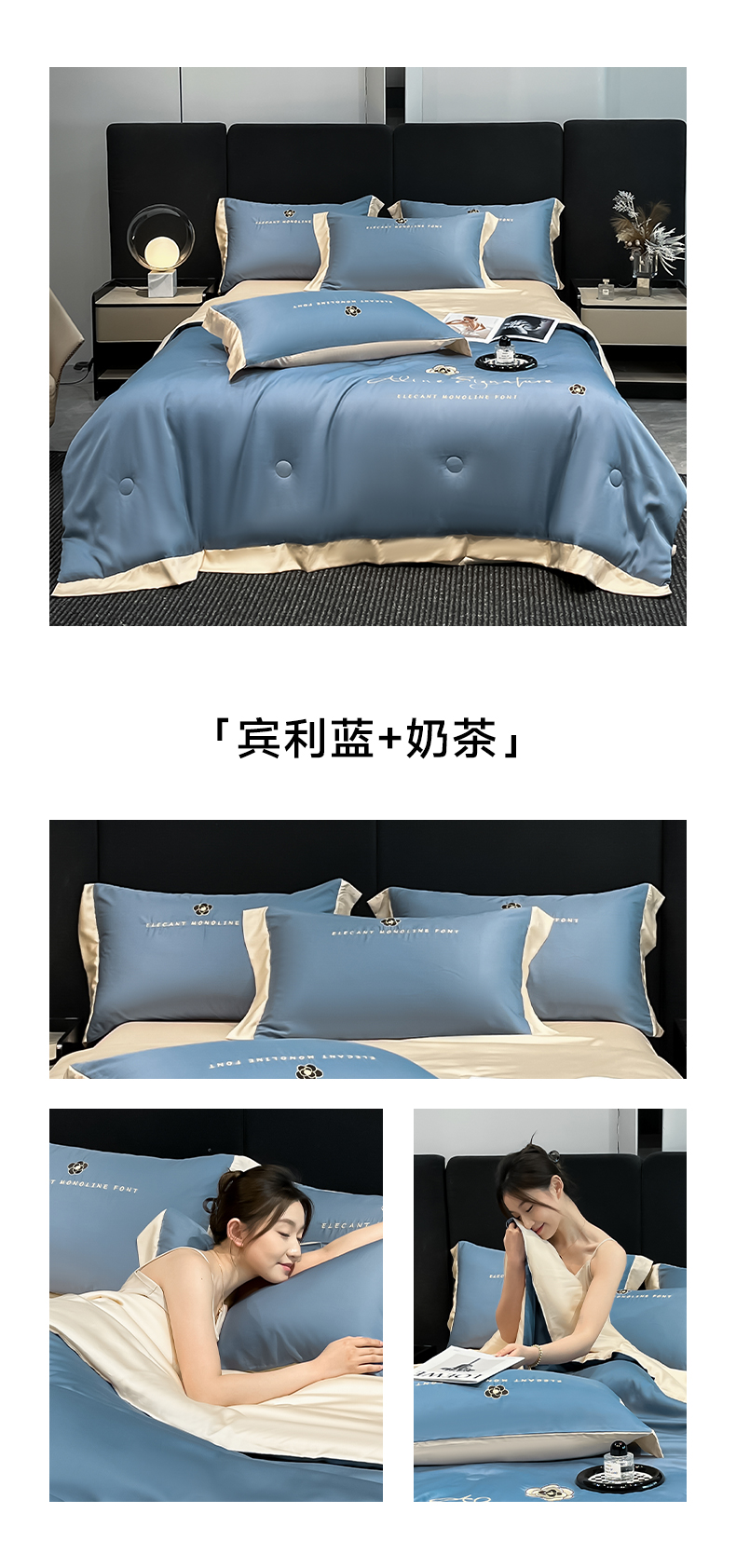 仔仔熊 2025新款水洗真丝夏凉被空调被四件套-春暖花开 宾利蓝-奶茶