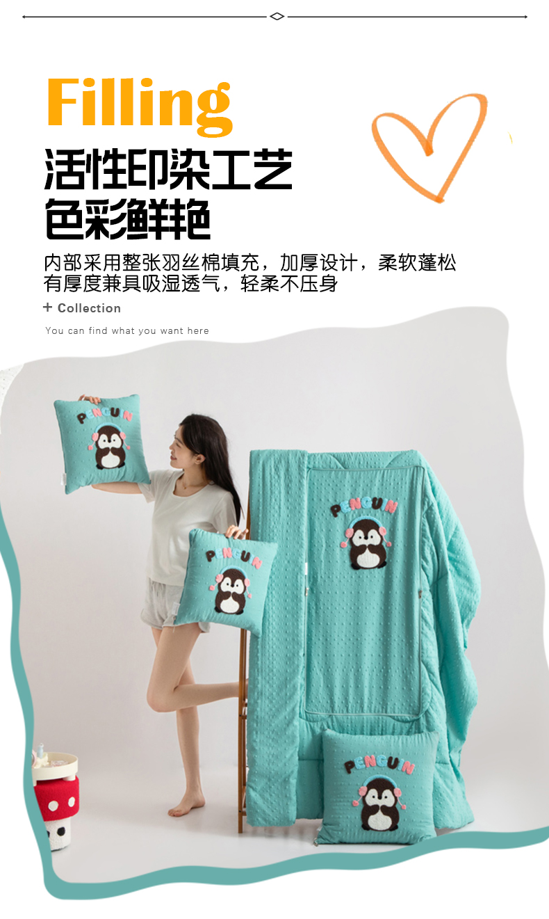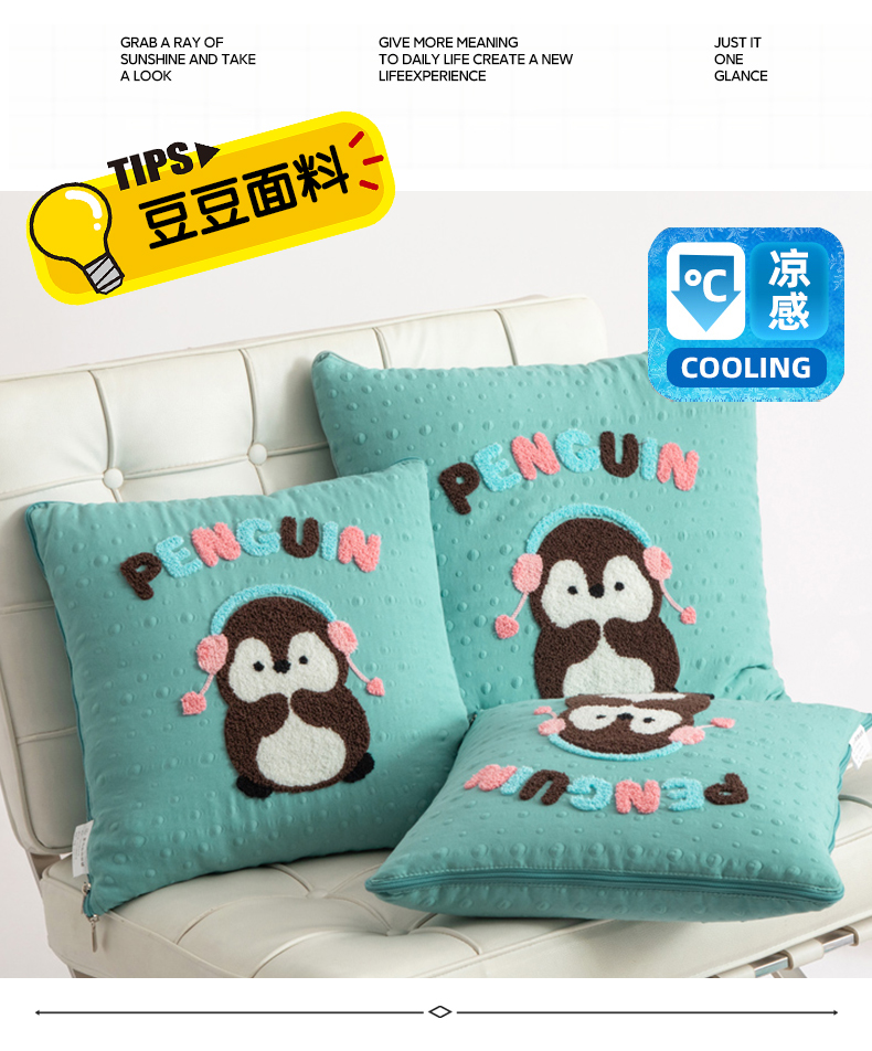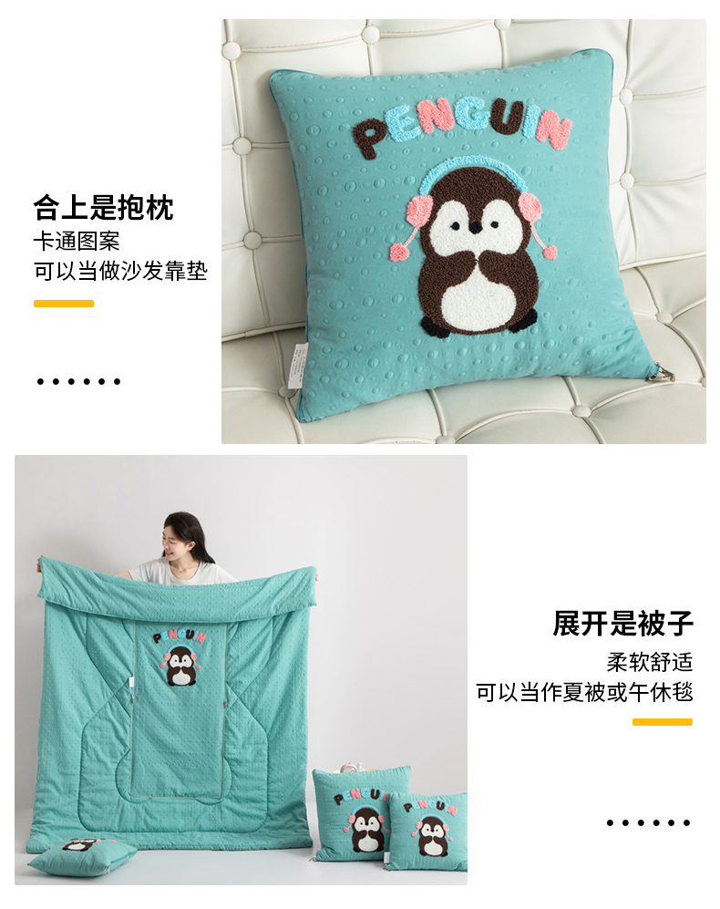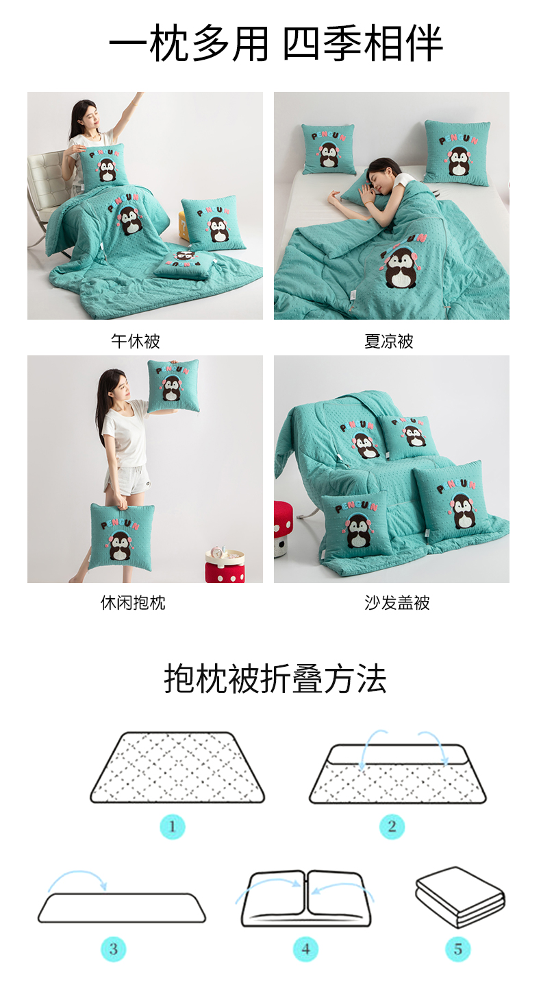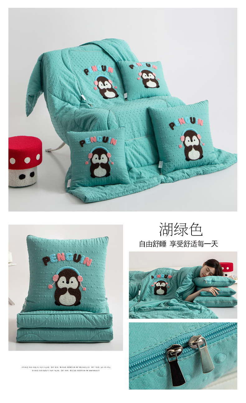 商品名称:雷娜家居 2025新款针织双层纱系列豆豆抱枕被-音乐企鹅 湖绿色