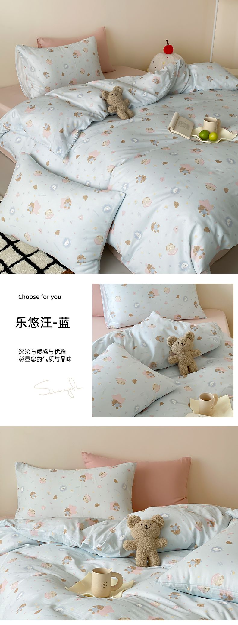 (总)时光里 2025新款230克全消光印花10色专版花型四件套,缤纷熊,狗狗乐园-蓝,花兔兔,花漾,开心腊肠,猫咪日记,木槿,森林兔,线团小咪,小雏菊
