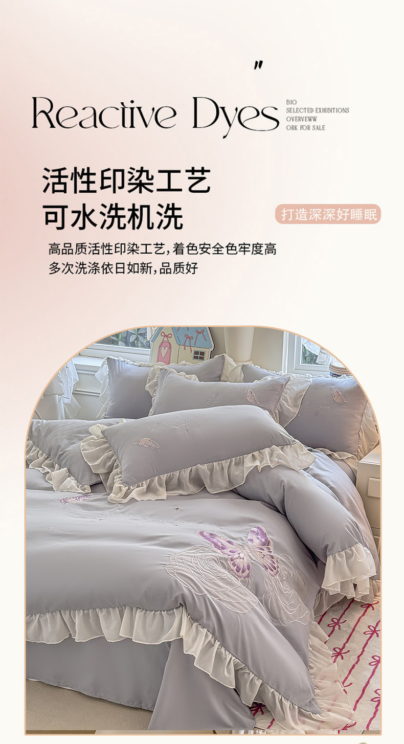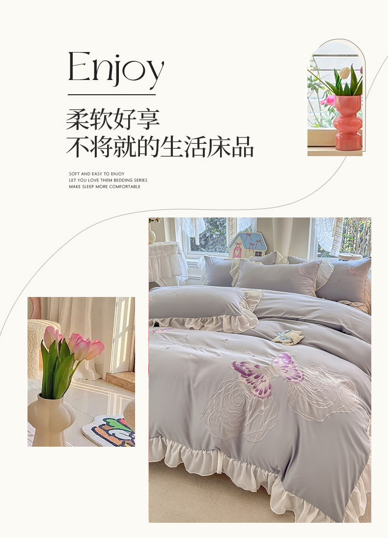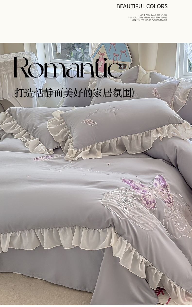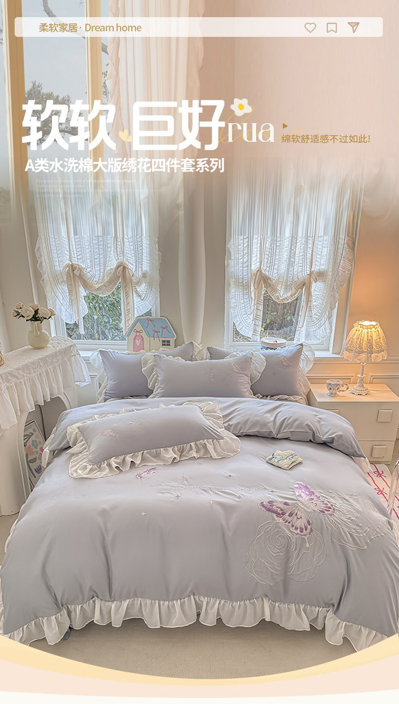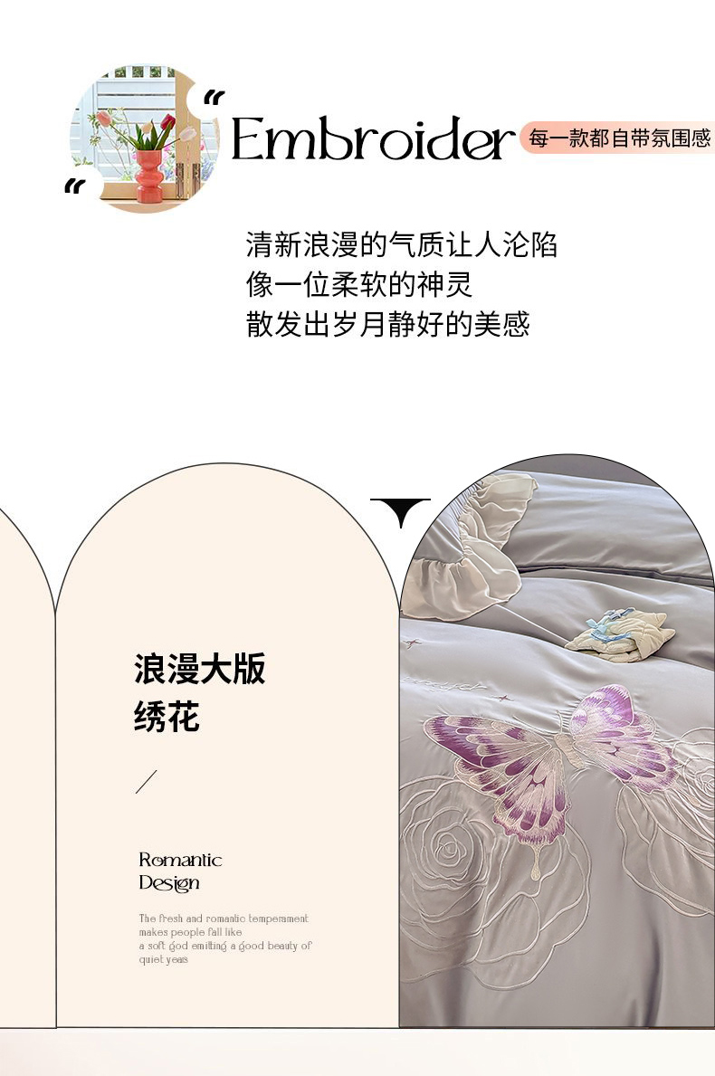 当前位置: 91家纺网 > 商品网购 > 床品套件 > 四件套 > 其它四件套 > 凯美家居 2025新款A类水洗棉大版绣花四件套系列-蝶恋花 蝶恋花 浅灰