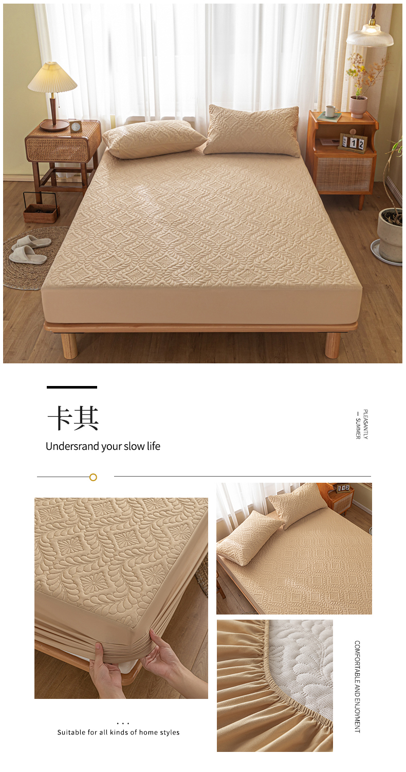 缦绣阁家纺 2025新款简约纯色水洗棉防水夹棉床笠三件套立体压花床垫保护套跨镜外贸可定制 卡其