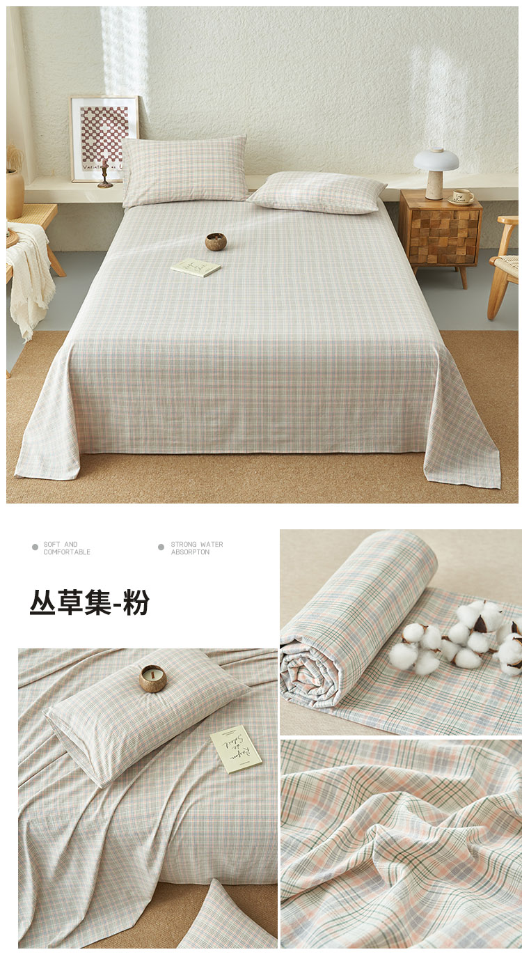 • 91家纺网 家纺一手货源 找家纺 早晨家纺 2025新款色织纯棉水洗棉床单 丛草集-粉