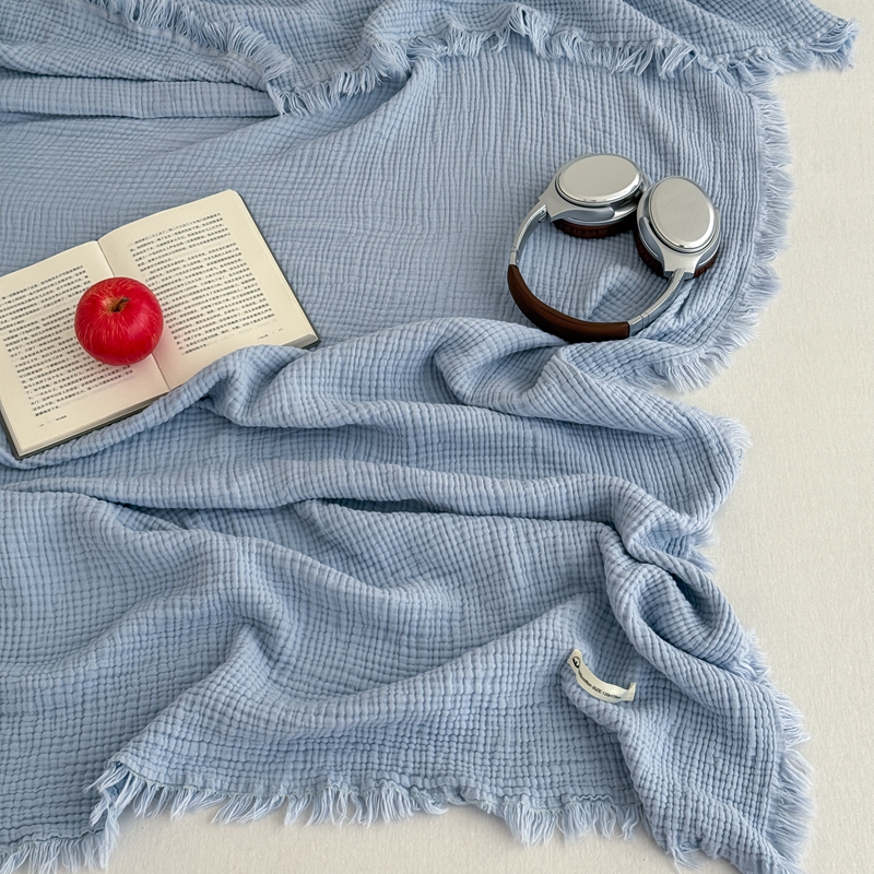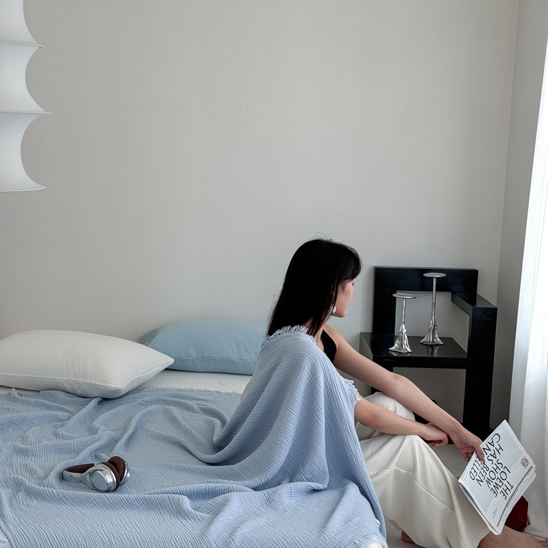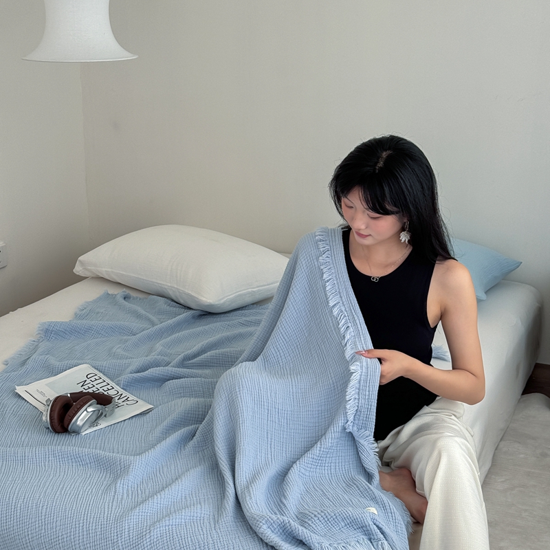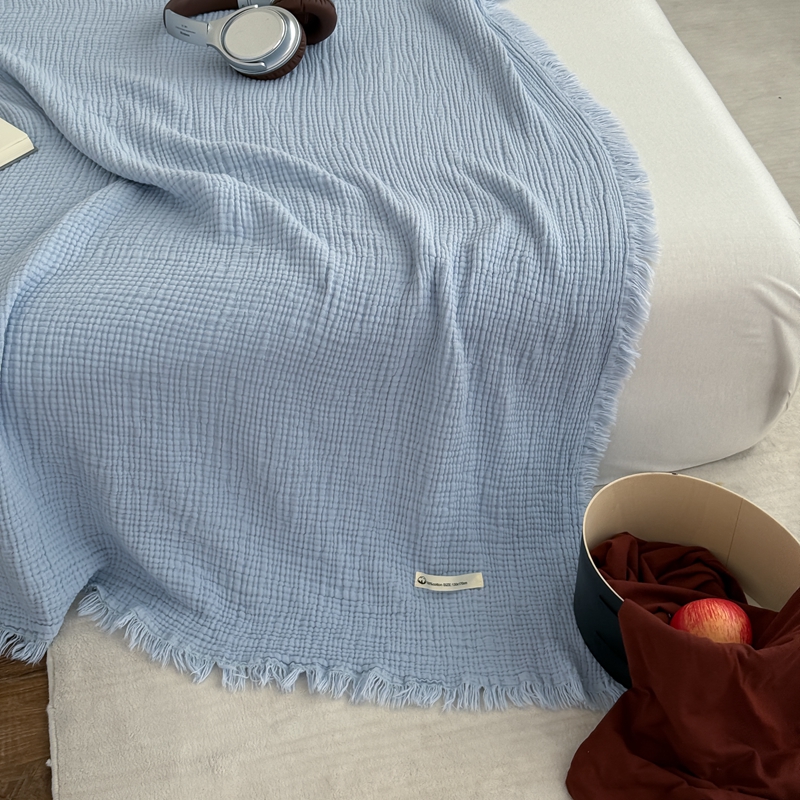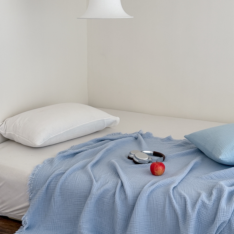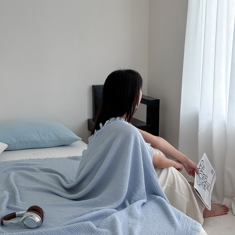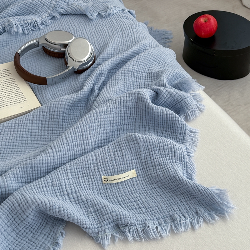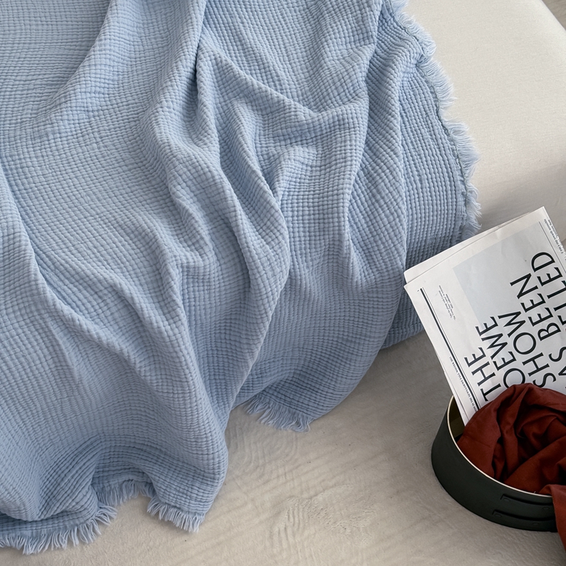 山舍家居 2025新款全棉四层纱流苏盖毯第三批 床拍图 冰川蓝