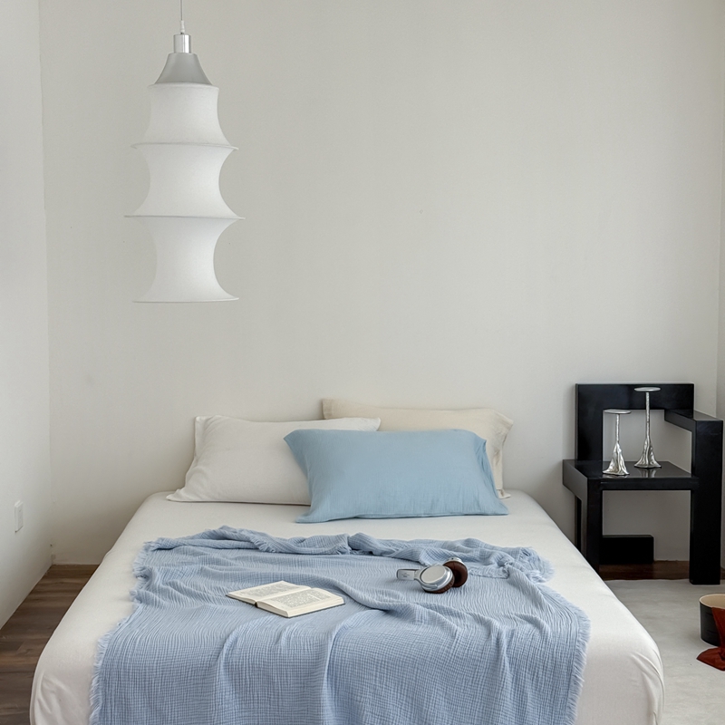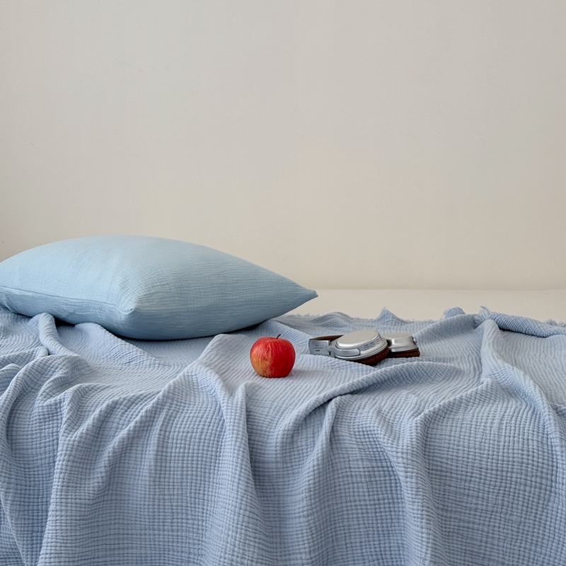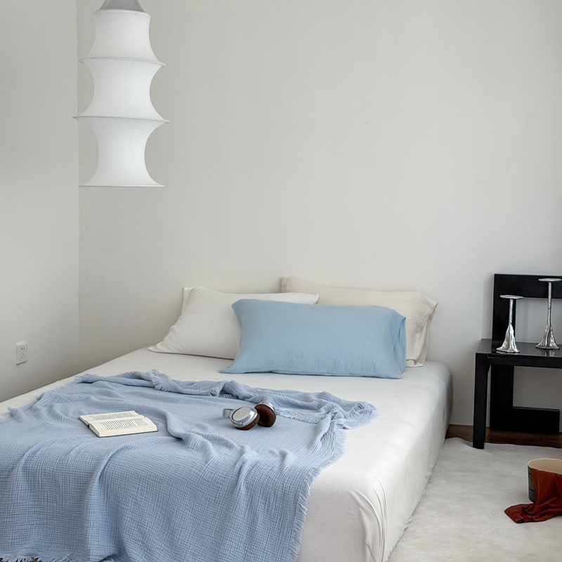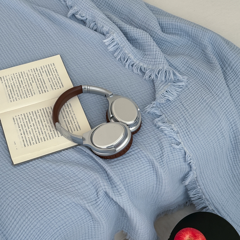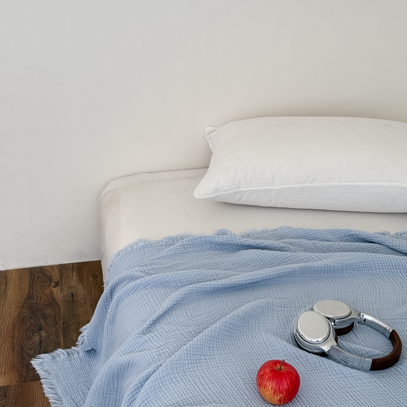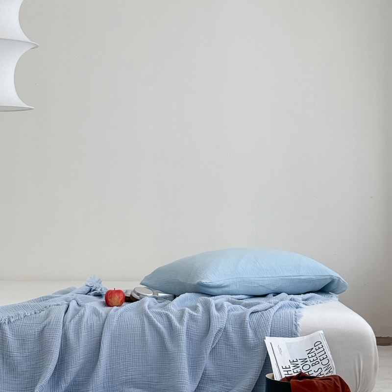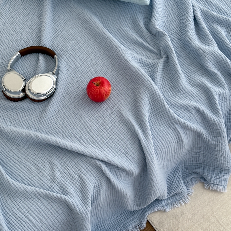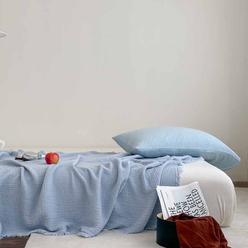 山舍家居 2025新款全棉四层纱流苏盖毯第三批 床拍图 冰川蓝