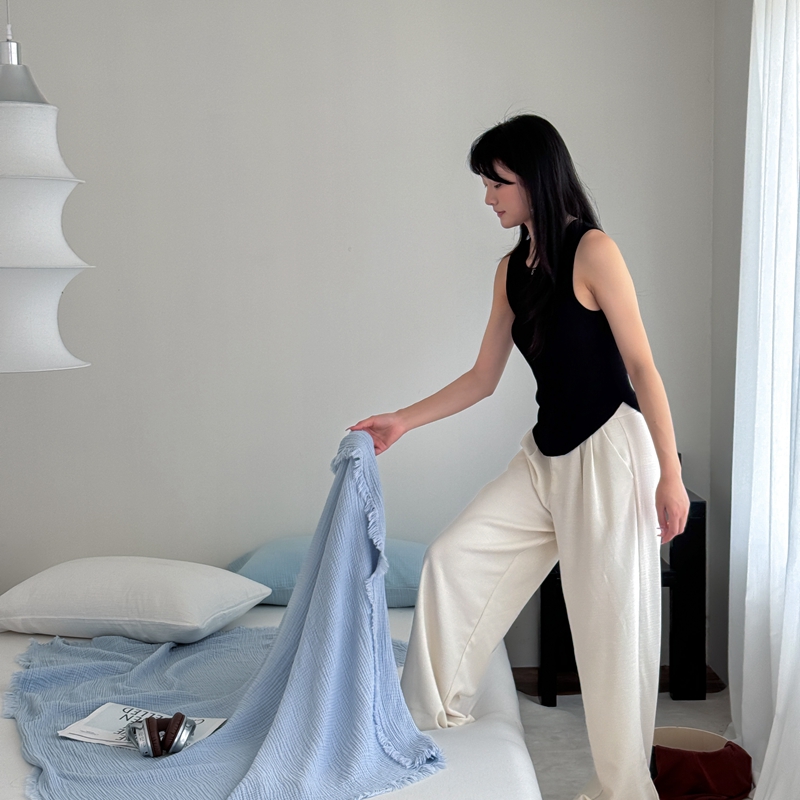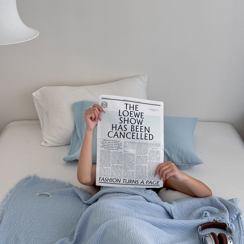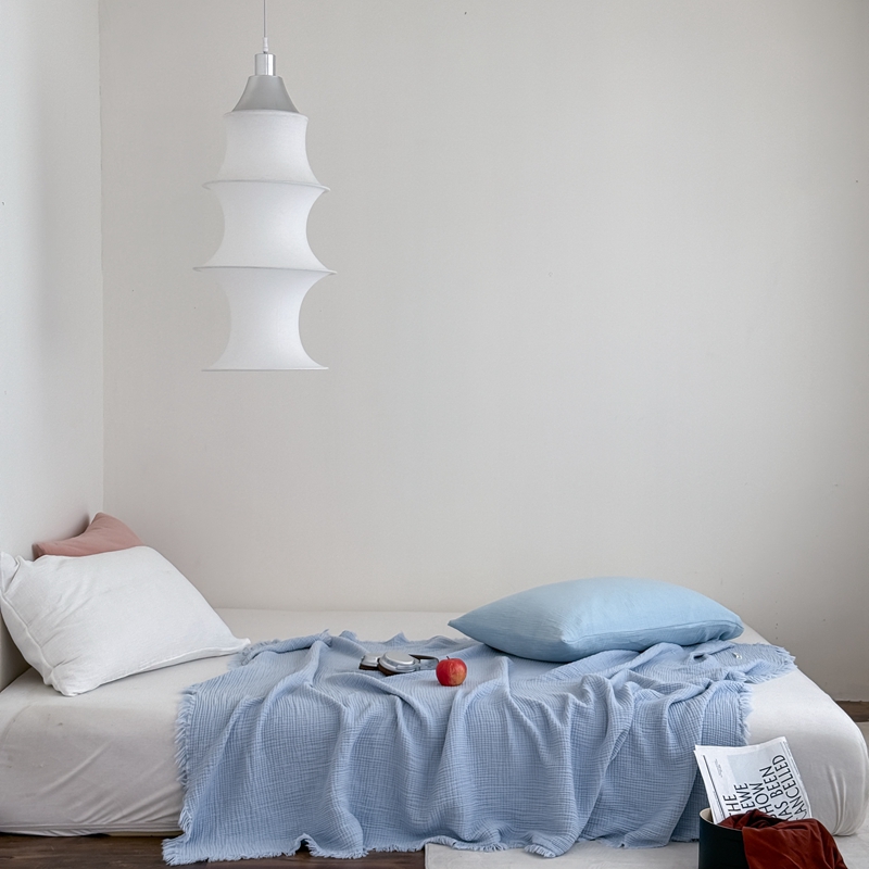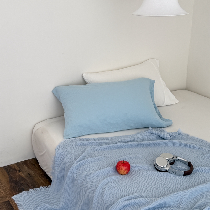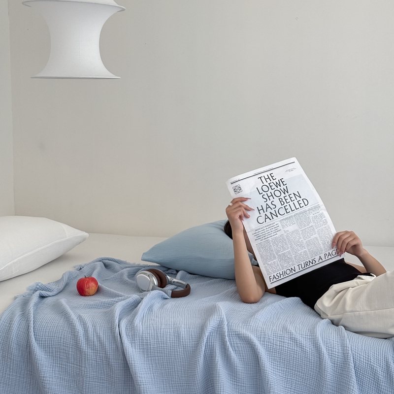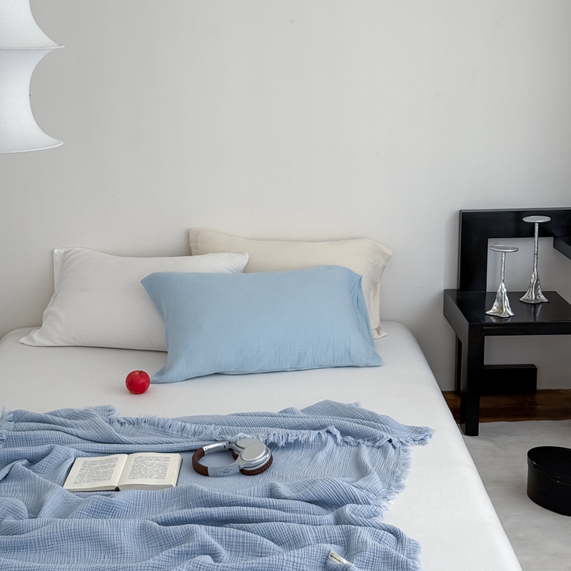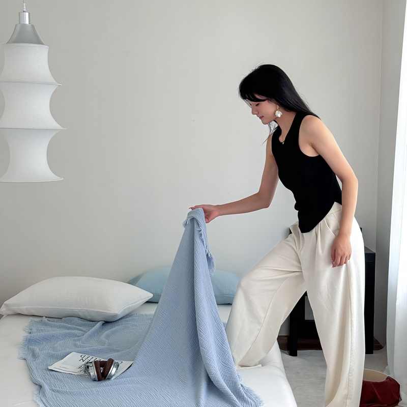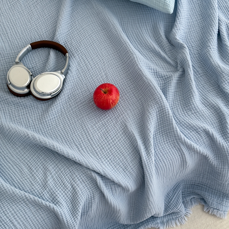 山舍家居 2025新款全棉四层纱流苏盖毯第三批 床拍图 冰川蓝