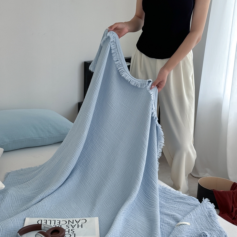 商品名称:山舍家居 2025新款全棉四层纱流苏盖毯第三批 床拍图 冰川蓝
