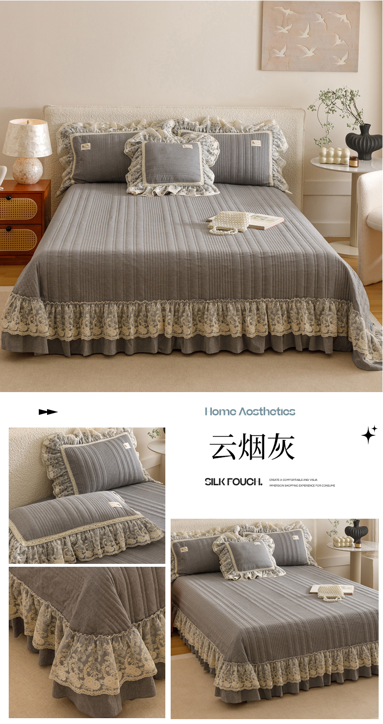 • 91家纺网 家纺一手货源 找家纺 菊上家纺 2025新款全棉色织水洗棉洛丽塔公主系列单床盖 云烟灰