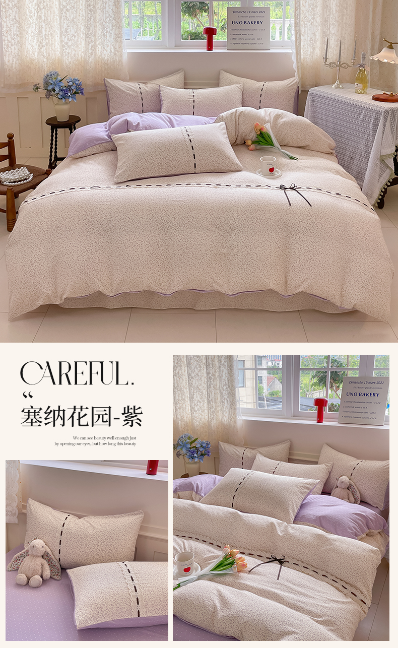 当前位置: 91家纺网 > 商品网购 > 床品套件 > 四件套 > 其它四件套 > 韩后家纺 2025新款木棉印花四件套 塞纳花园-紫