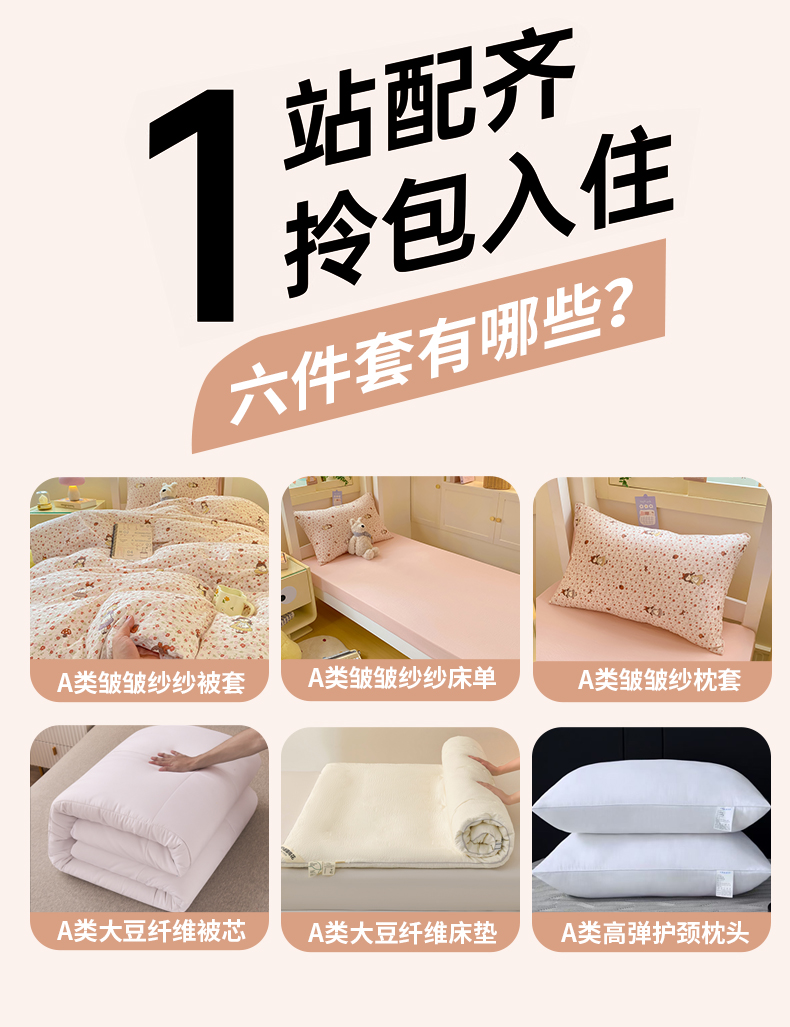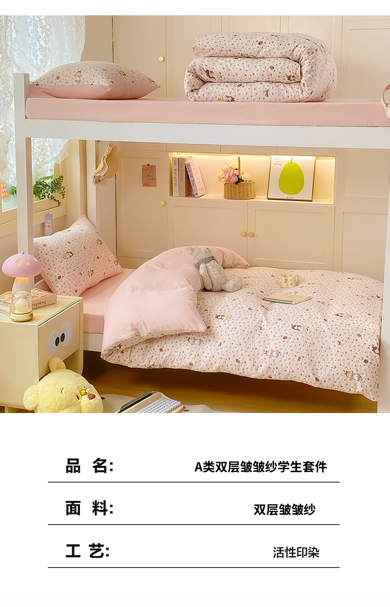 当前位置: 91家纺网 > 商品网购 > 床品套件 > 六件套 > 丽美人家纺 2025新款A类皱皱纱学生宿舍三件套上下铺三件套六件套 QB玛丽