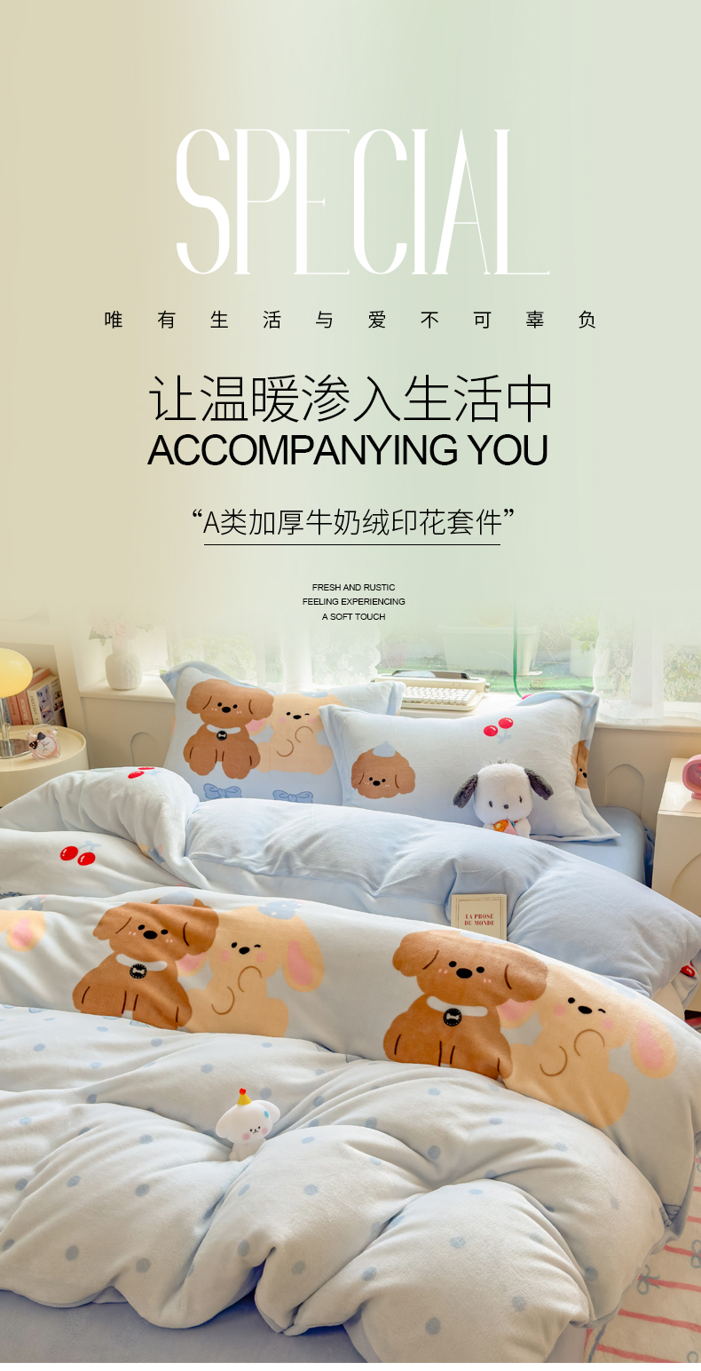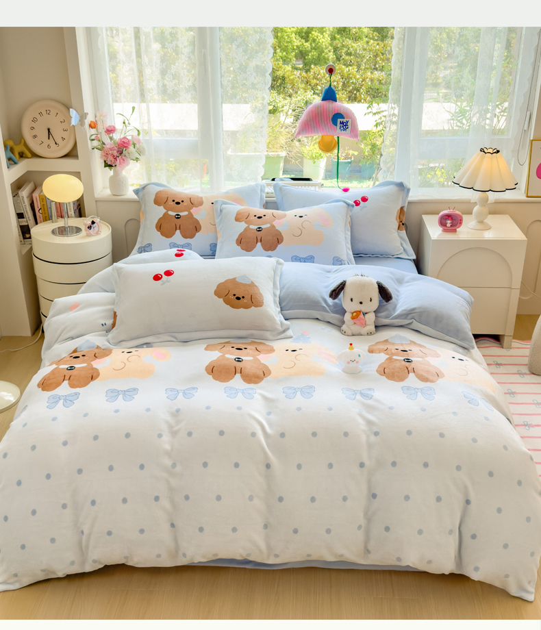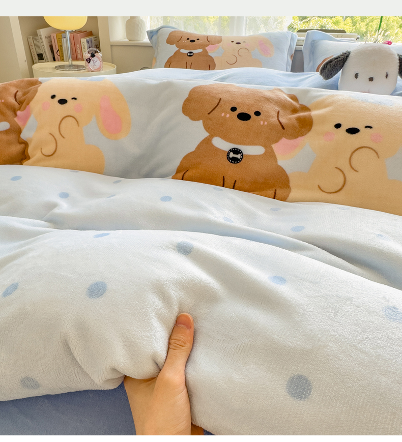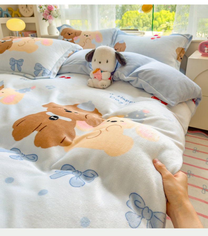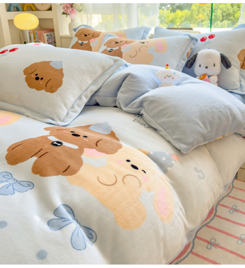 当前位置: 91家纺网 > 商品网购 > 床品套件 > 四件套 > 牛奶绒四件套 > 丝羽坊 2025新款200克加厚小清新牛奶绒床单款 床笠款四件套 被套 宠物派对