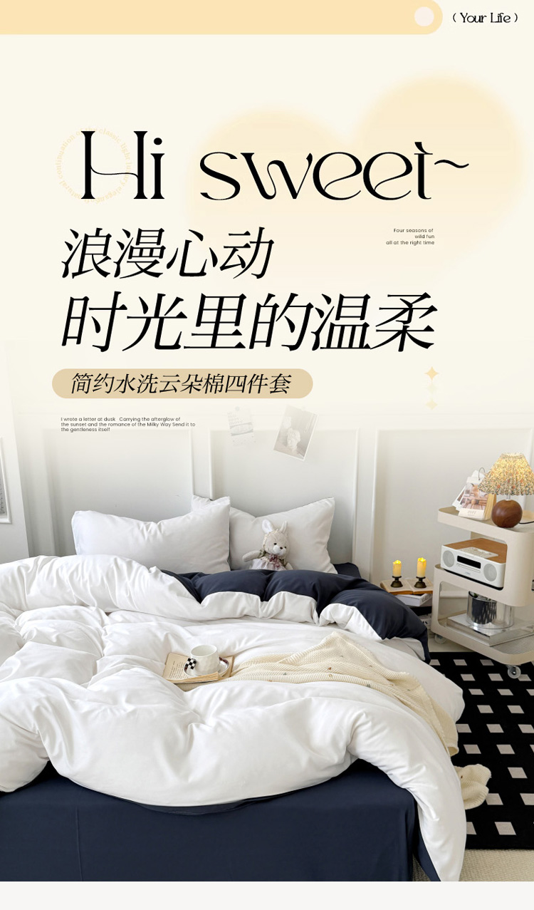 纽维斯 2025新款水洗棉云朵棉纯色双拼磨毛四件套 奶白蓝灰