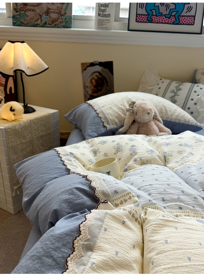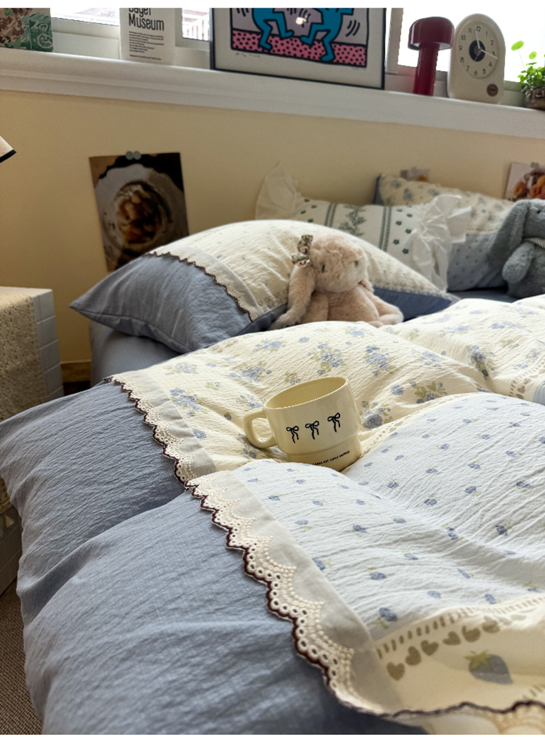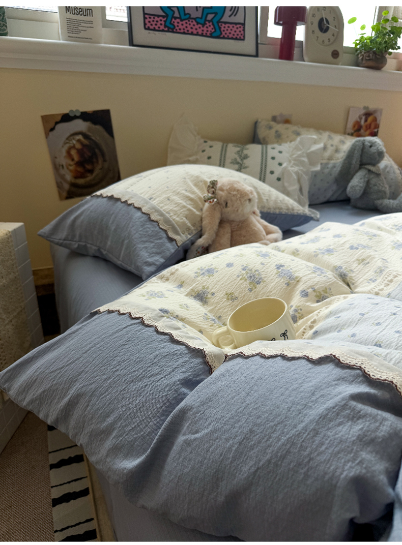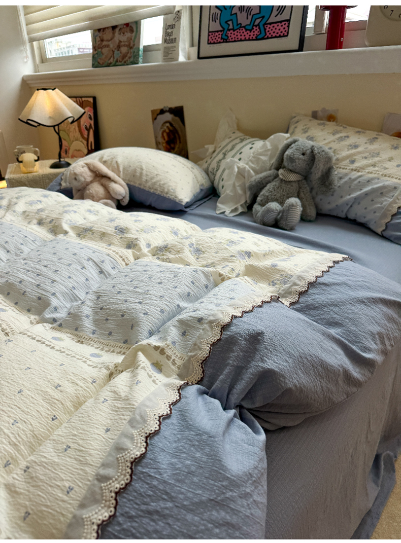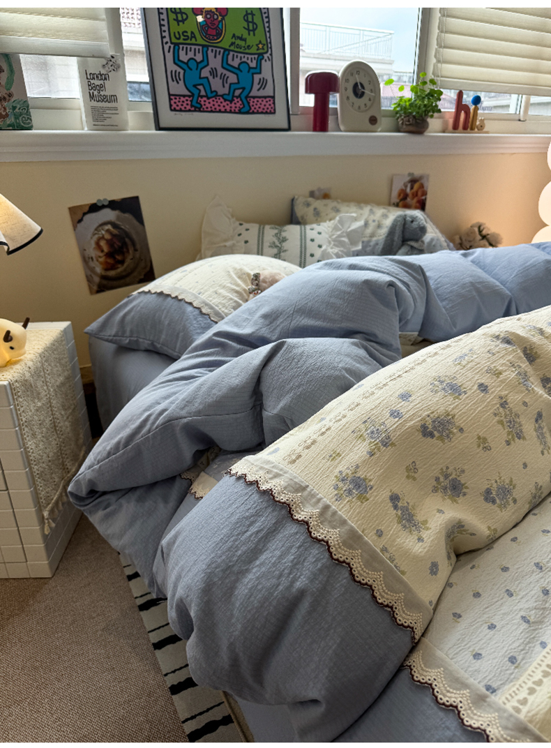 当前位置: 91家纺网 > 商品网购 > 床品套件 > 四件套 > 全棉普通四件套 > 水墨江南 2025新款云感皱皱纱全棉花边四件套-场景二 花边款-春天里蓝