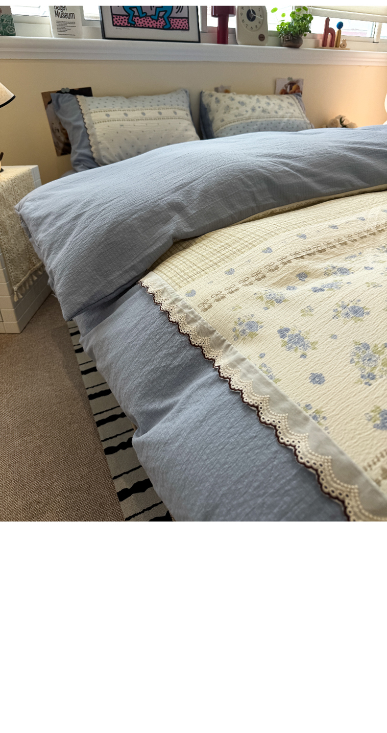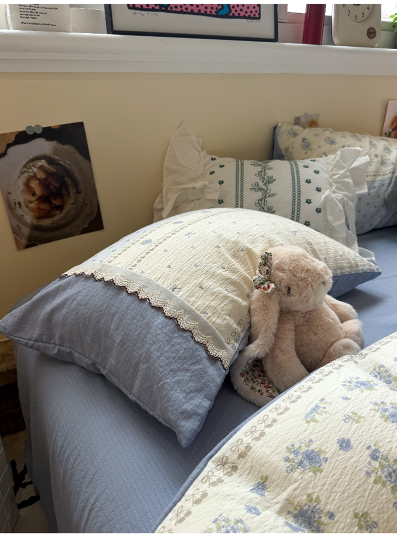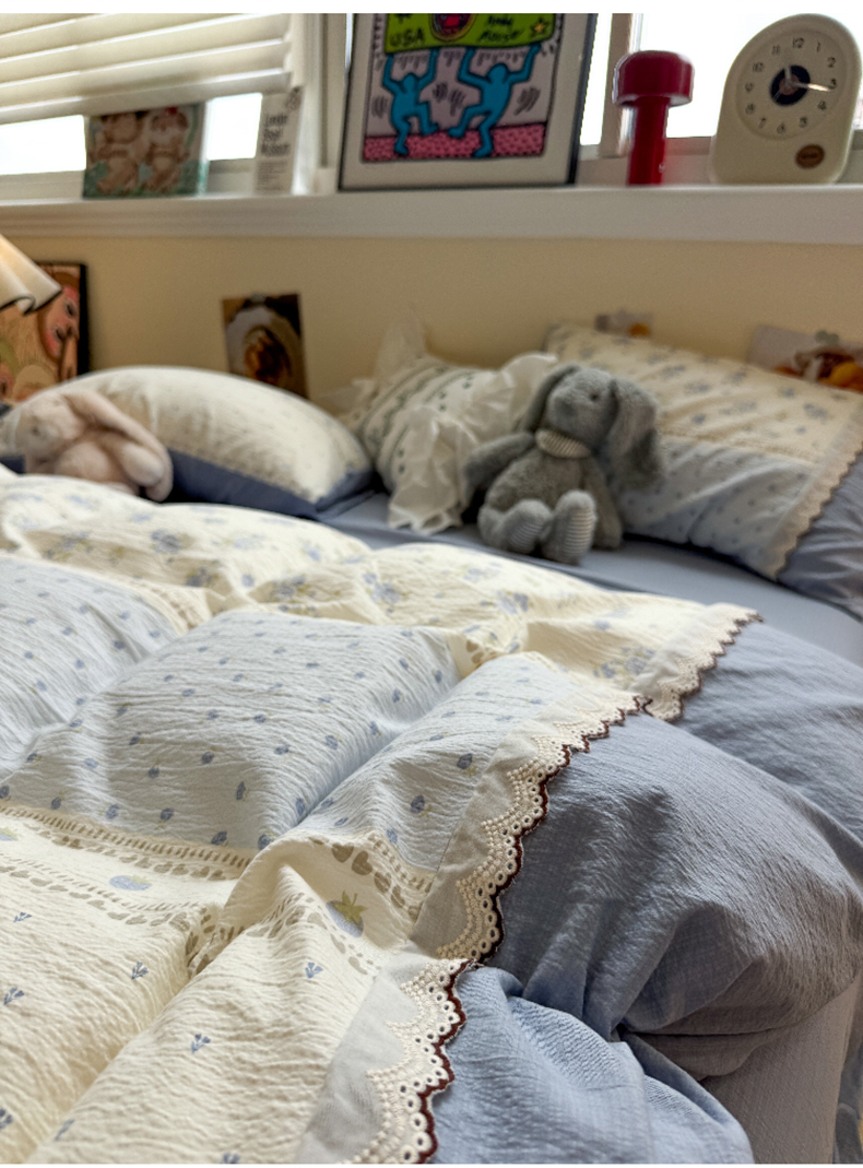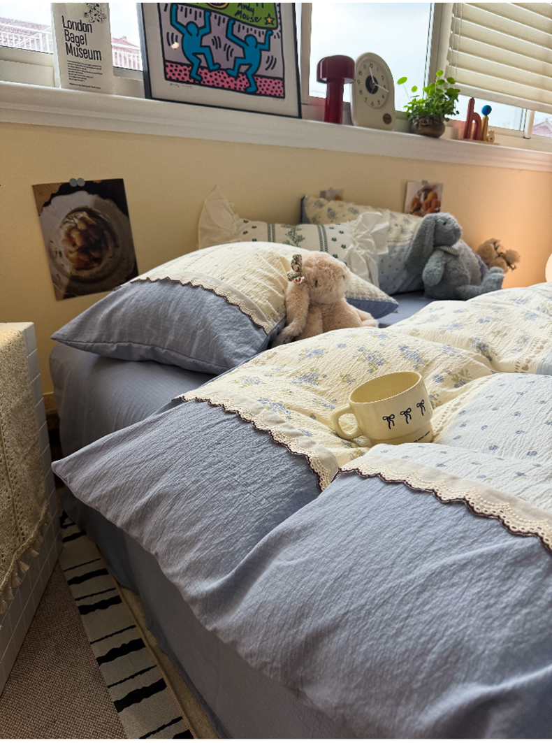 当前位置: 91家纺网 > 商品网购 > 床品套件 > 四件套 > 全棉普通四件套 > 水墨江南 2025新款云感皱皱纱全棉花边四件套-场景二 花边款-春天里蓝