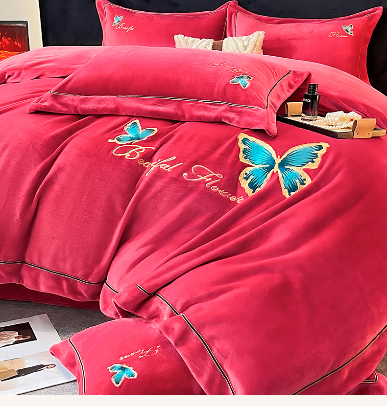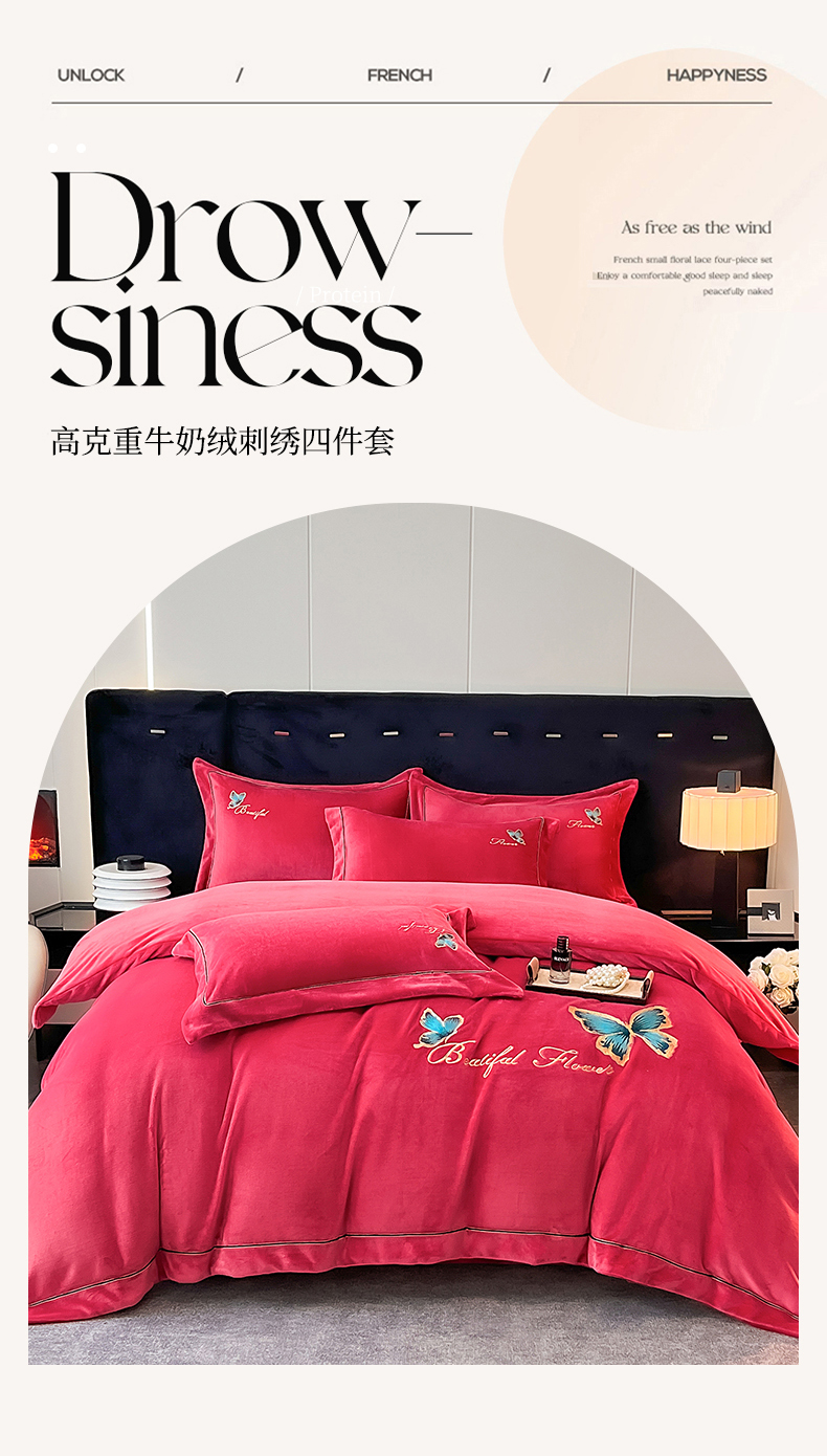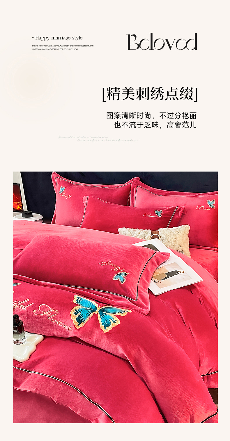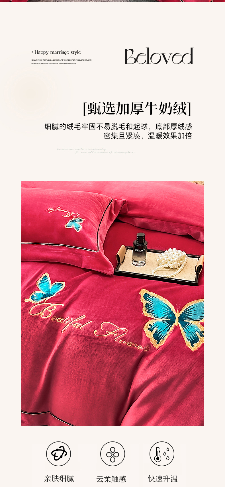 妮恒美家纺 2025新款牛奶绒刺绣四件套唯美蝴蝶结系列 唯美-富世红