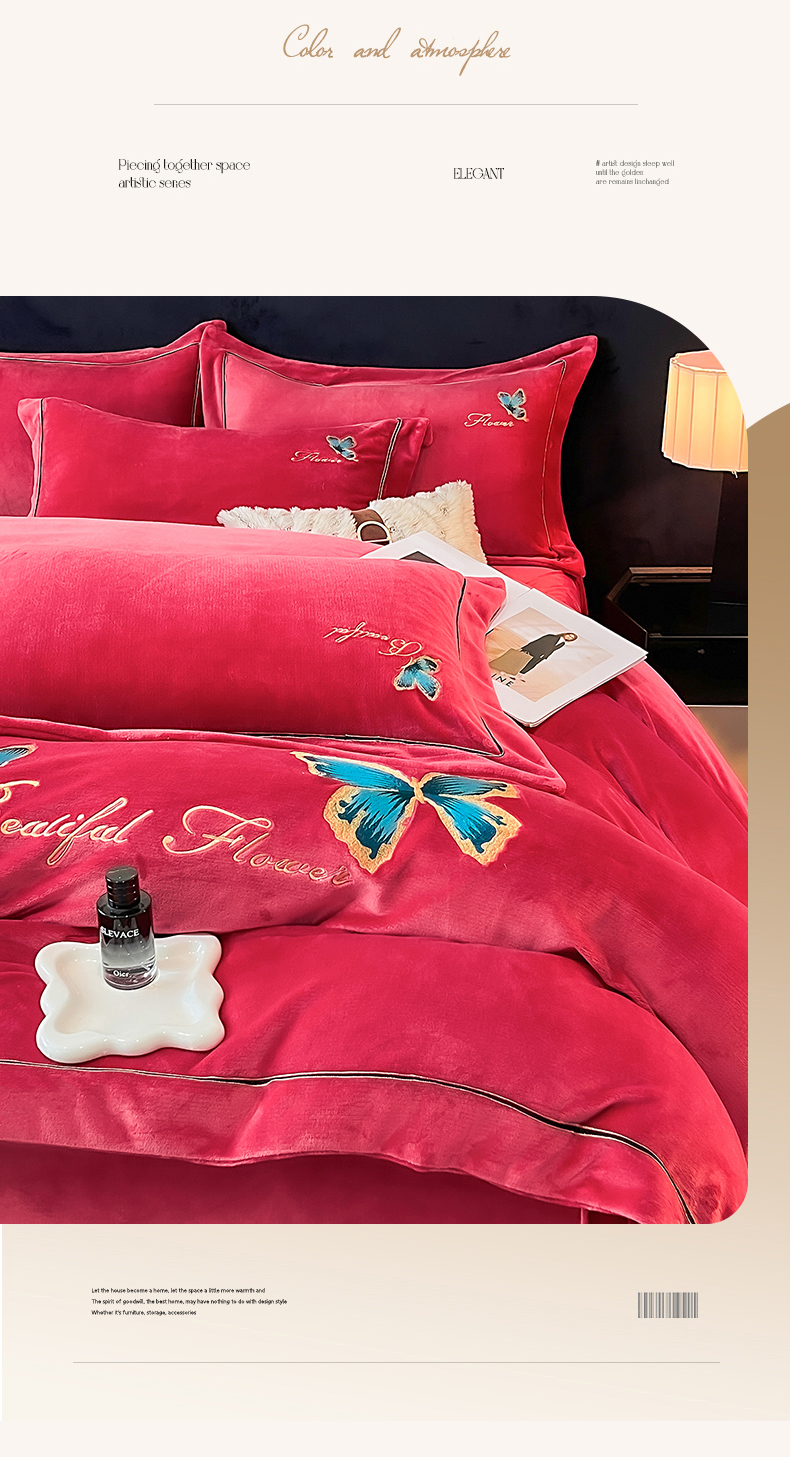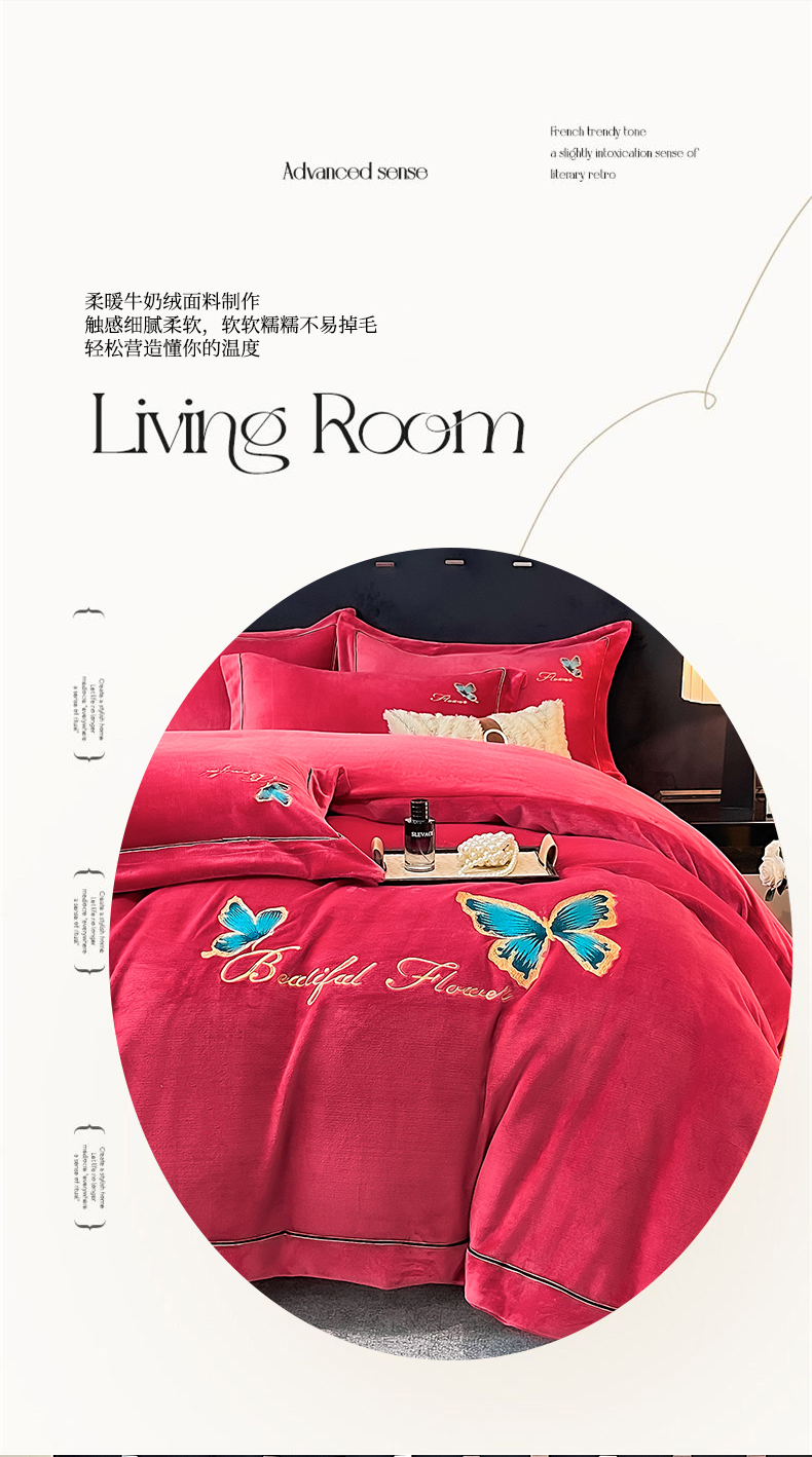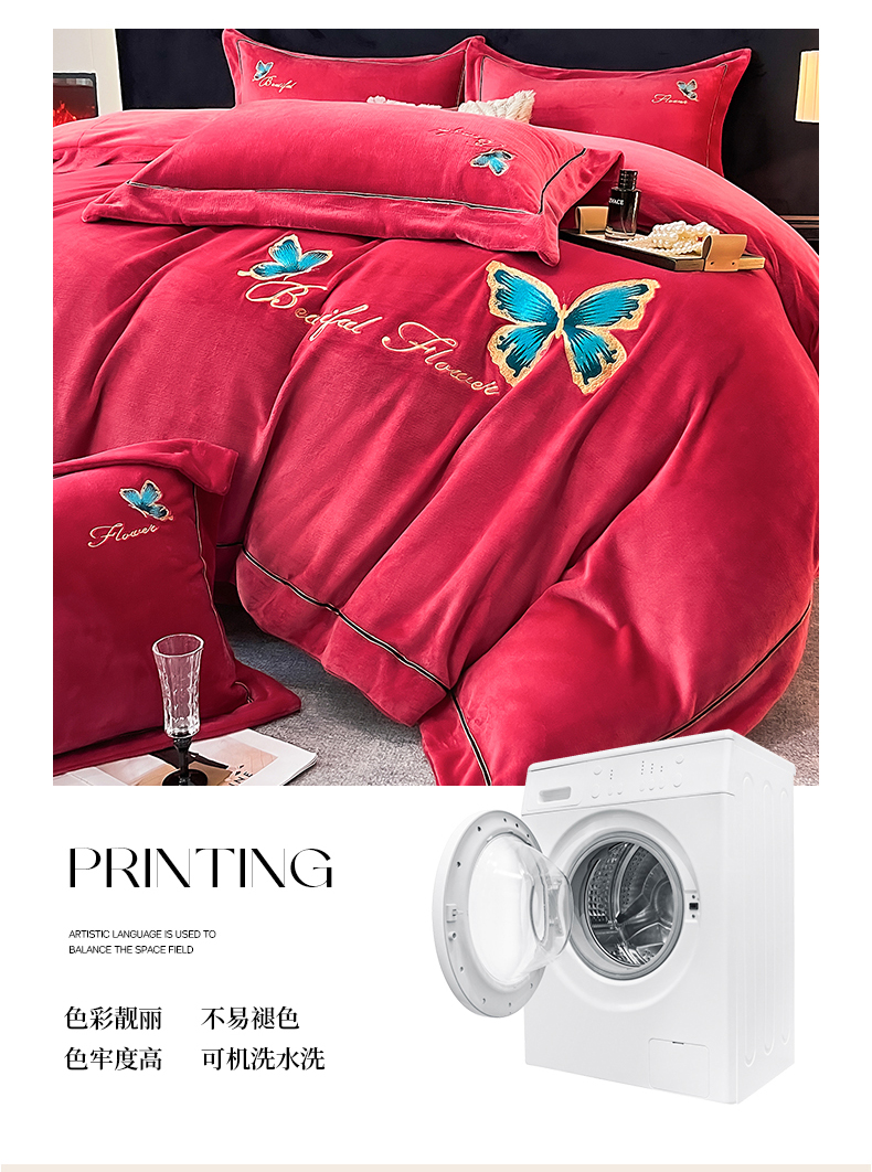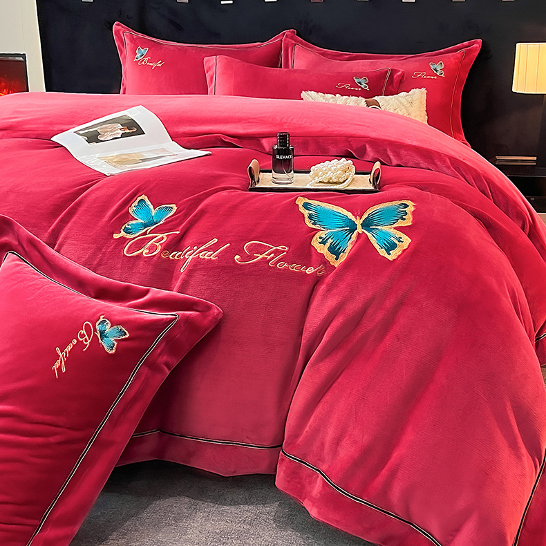 妮恒美家纺 2025新款牛奶绒刺绣四件套唯美蝴蝶结系列 唯美-富世红