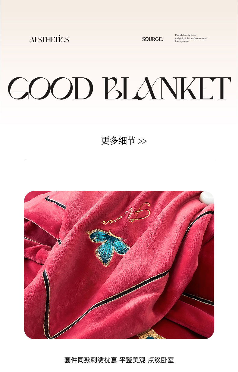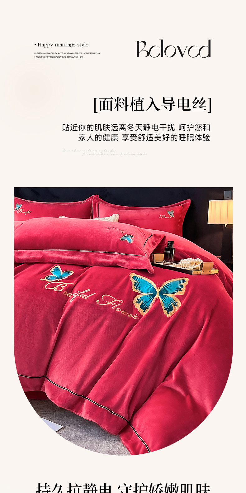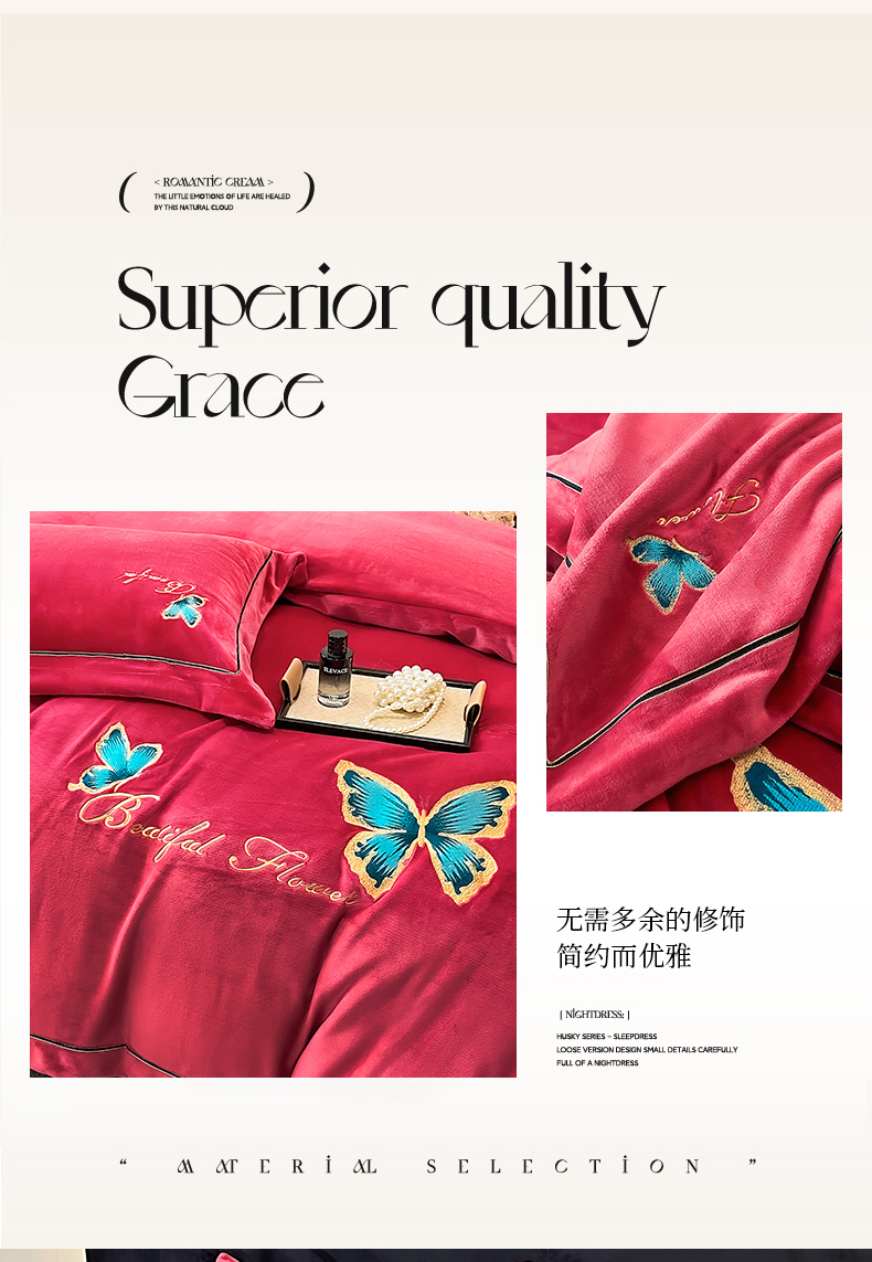 商品名称:妮恒美家纺 2025新款牛奶绒刺绣四件套唯美蝴蝶结系列 唯美-富世红