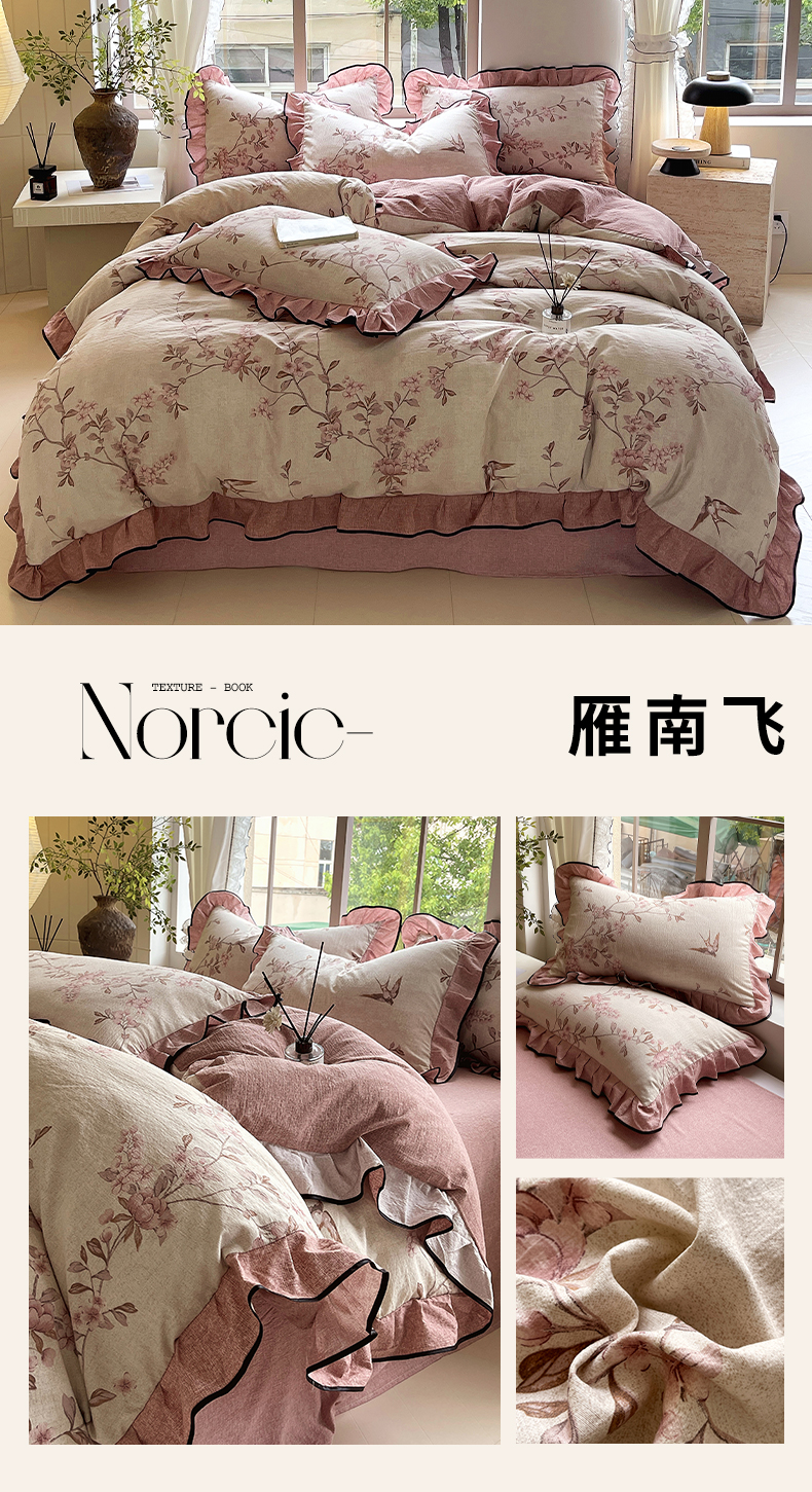 宝士康家纺 2025新品10A抗菌原麻荷叶边床单款四件套 雁南飞