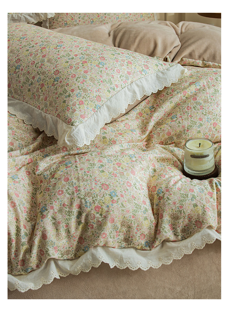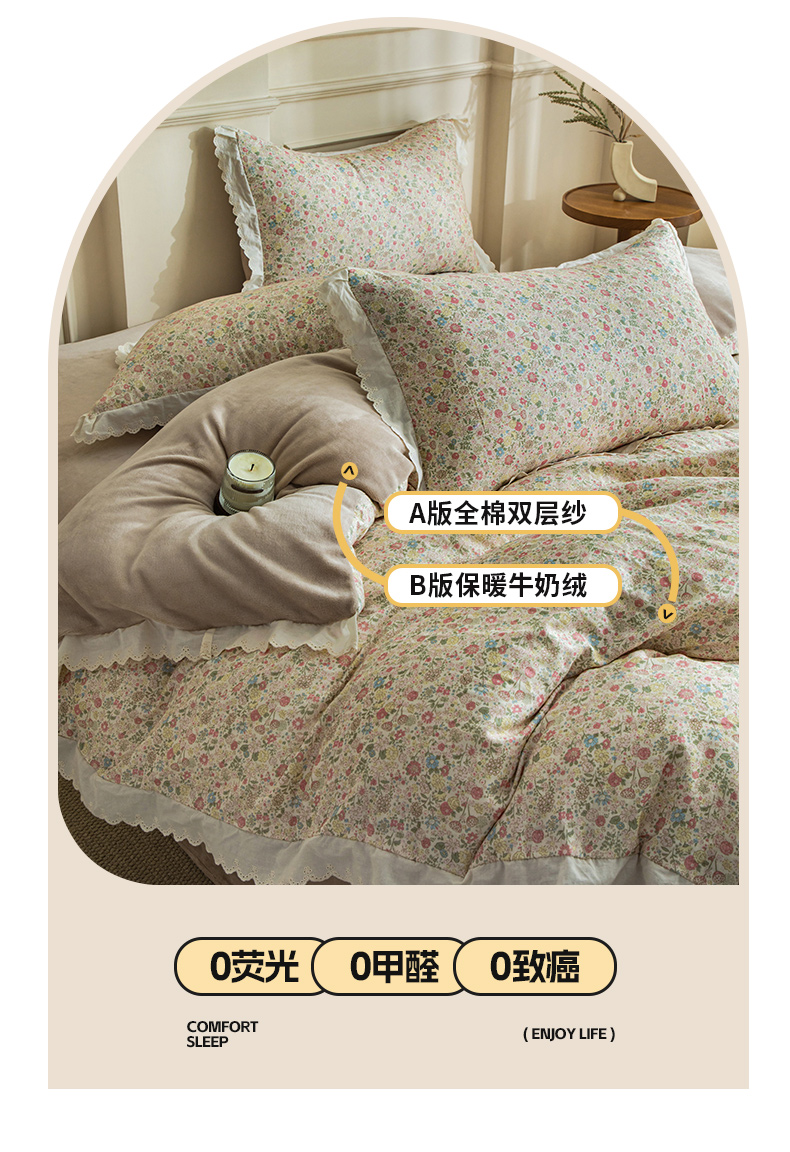 商品名称:大境 2025秋冬新款A类全棉双层纱棉加牛奶绒四件套韩版公主风 奈斯