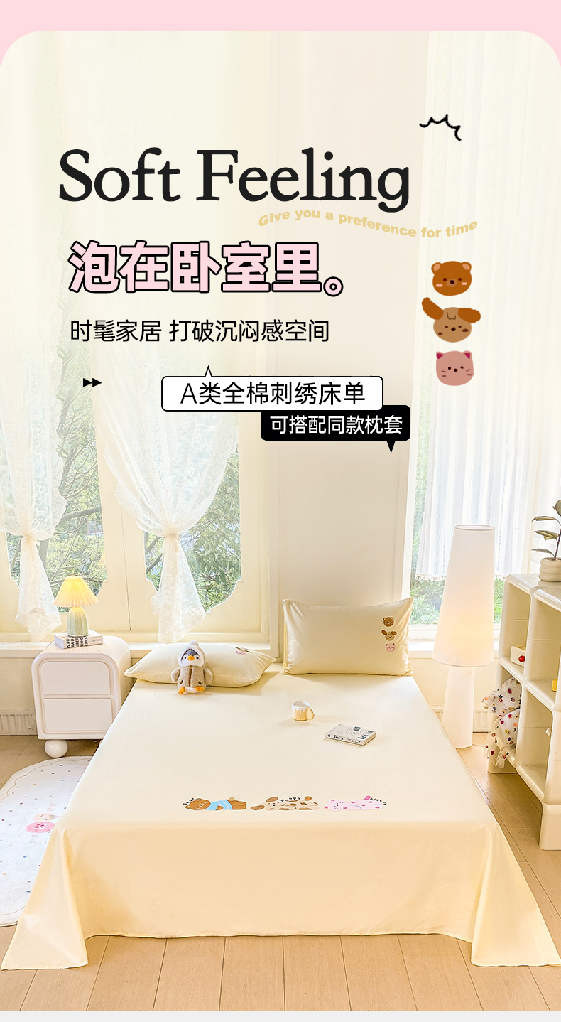 • 91家纺网 家纺一手货源 找家纺 灰鲸 2025新款全棉刺绣大床床单-懒懒小憩系列 懒懒小憩-黄